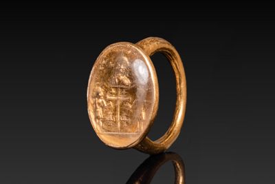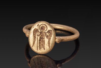 BYZANTINE GOLD NIELLO RING DEPICTING A STANDING ANGEL HOLDIN…