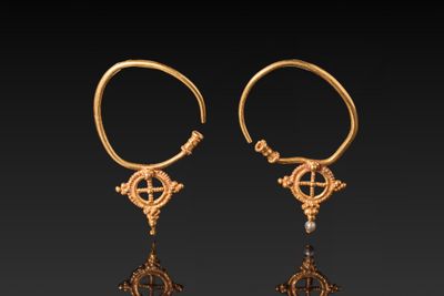 MATCHED PAIR OF BYZANTINE GOLD AND PEARL EARRINGS. Ca. AD 60…