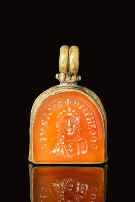 RARE BYZANTINE GOLD PENDANT WITH CARNELIAN INTAGLIO DEPICTIN…