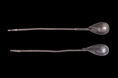 PAIR OF BYZANTINE SILVER AND NIELLO RITUAL SPOONS WITH INSCR…