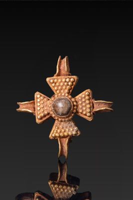 RARE BYZANTINE GOLD AND NIELLO RING WITH JERUSALEM CROSS. Ca…
