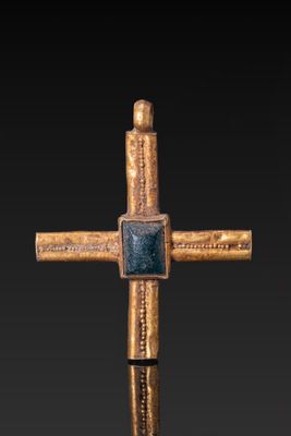 BYZANTINE GOLD CROSS PENDANT WITH GLASS INLAYS. Ca. AD 700 -…