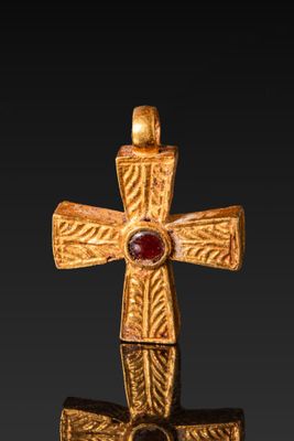 BYZANTINE GOLD CROSS WITH CENTRAL RED GARNET CABOCHON. Ca. A…