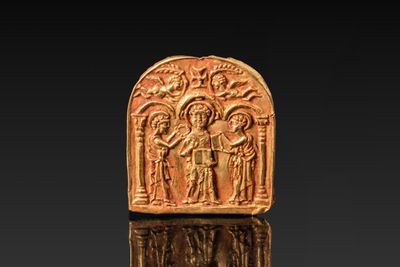 BYZANTINE HIGH KARAT GOLD APPLIQUÉ WITH RED CABOCHON DEPICTI…