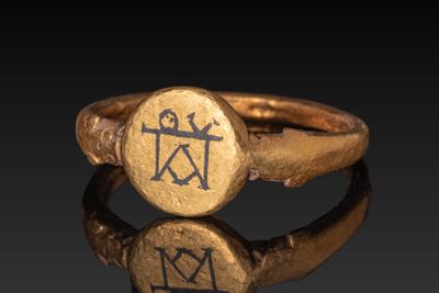 BYZANTINE GOLD RING WITH NIELLO MONOGRAM. Ca. AD 600. A gold…
