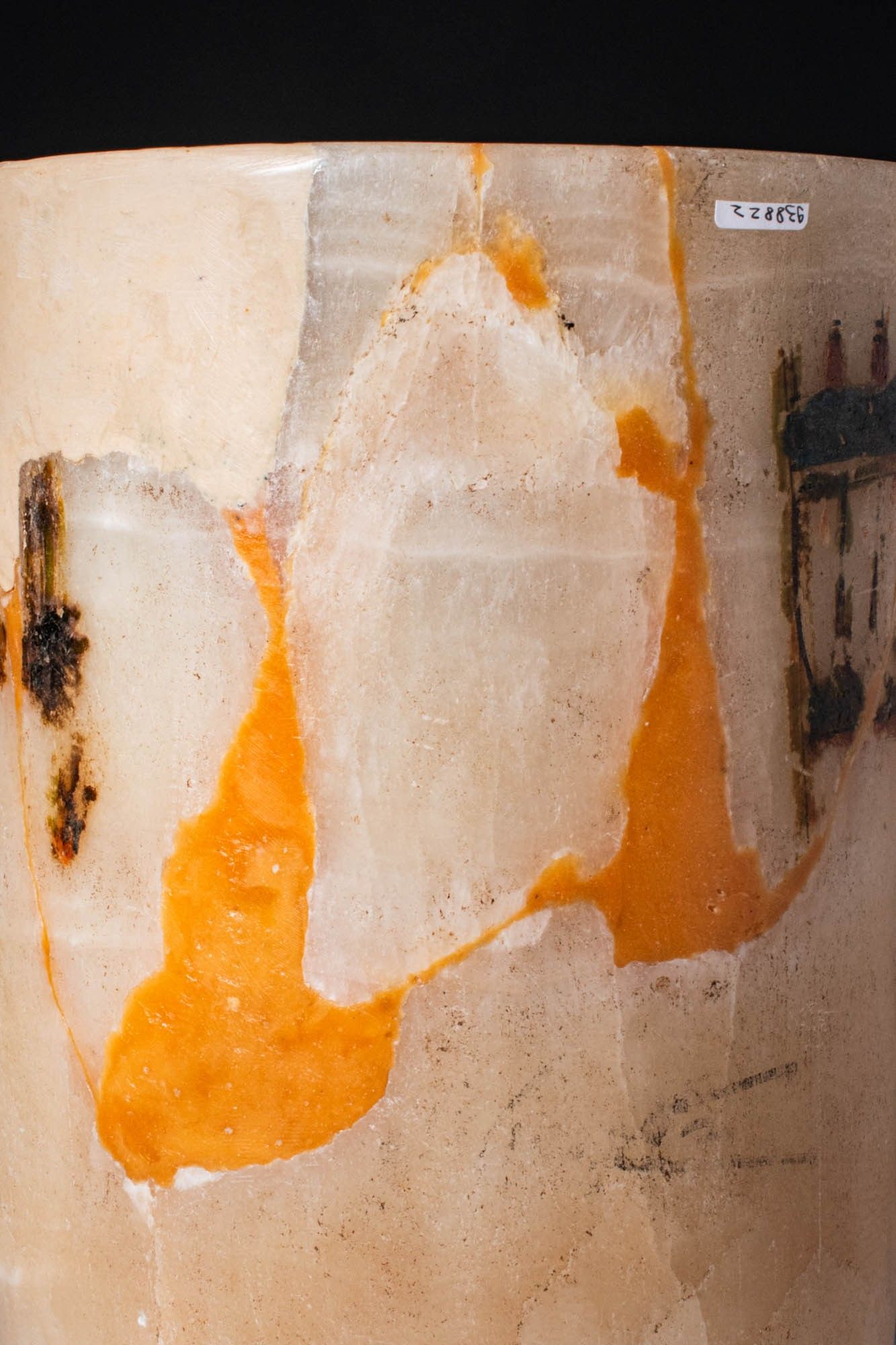 New Kingdom, Ca. 1550 - 1069 BC. A ceremonial jar carved from alabaster with a tubular body ending in a rounded base and a straight cylindrical rim. The upper portion is decorated with a painted frieze of stylised lotus columns. Below, a large central panel depicts a vertical arrangement of three floral elements: a lotus blossom flanked by two poppy seed capsules. For similar see: Egiitto splendore millenariom la collezione di Leiden a Bologna, Skira Editore, Cat. VI.33 and VI.34; For similar see: A. Bevan, Stone Vessel and Values in The Bronze Age Mediterranean, Cambridge, University college London, Institute of Archaeology, 2007; p.147. Size: 300mm x 160mm; Weight: 3.83kg Provenance: Prince collection, 1990s-2014; Ex. Collector's Eye - Thalassic Collection. This item has been cleared against the Art Loss Register database and comes with a confirmation letter. Lot. 42. Lot 74C. This piece is accompanied by an authentication report from Simone Musso, consultant curator for Egyptian antiquities at the Stibbert Museum, Florence, Italy, member of the Nuri Archaeological Expedition. This item has been cleared against the Art Loss Register database and comes with a confirmation letter.