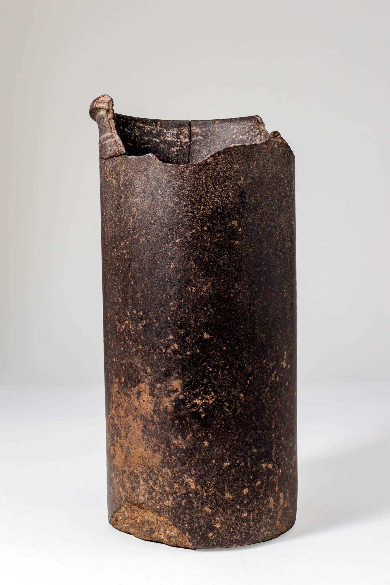 Ca. 3150 BC. A diorite vase with a cylindrical body decorated under the lip with a thin cord, engraved with a hieroglyphic inscription giving the name of Horus of Narmer, with the falcon raised on the serekh. The inscription seems to be a later addition. Narmer, who reigned for about thirty-five years, is considered to be the unifier of Upper and Lower Egypt. Originally from Hieraconpolis, he is said to have won a great victory against the north and thus led to the unification of the country. On the famous palette preserved in the Cairo Museum, he is represented victorious, alternately wearing the crown of the south and that of the north; his name is inscribed with the catfish (nar) and the chisel (sea). According to Manetho, he died at the age of 62, perhaps killed by a hippopotamus during a hunting party. His tomb was located in Abydos, in the royal necropolis among a group of thirty-six tombs distributed in three parallel rows. Besides the Cairo palette, other monuments bear his name: the mace head preserved in the Ashmolean Museum in Oxford, and various vases (University of Pennsylvania Museum). Size: 200mm x 90mm; Weight: 1.4kg Provenance: Prince collection, 1990s-2014; Ex. Binoche' Paris, 30 May 2012, Lot 5. This item has been cleared against the Art Loss Register database and comes with a confirmation letter. This piece is accompanied by an authentication report from Simone Musso, consultant curator for Egyptian antiquities at the Stibbert Museum, Florence, Italy, member of the Nuri Archaeological Expedition.
