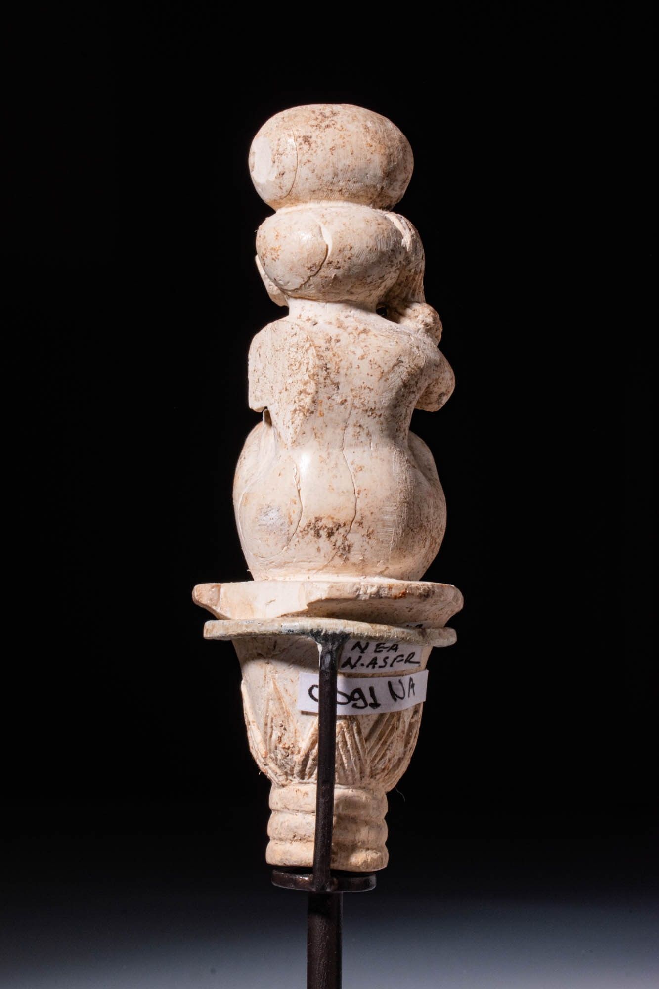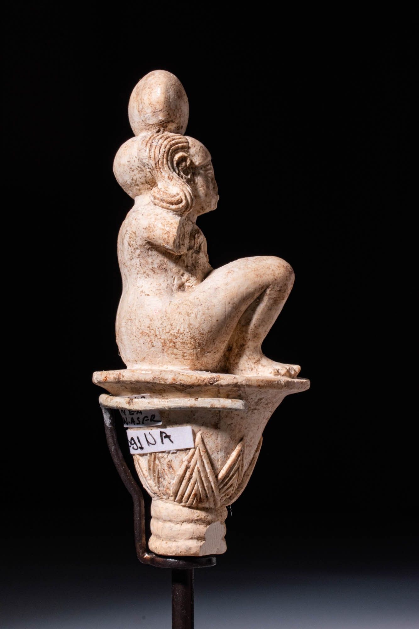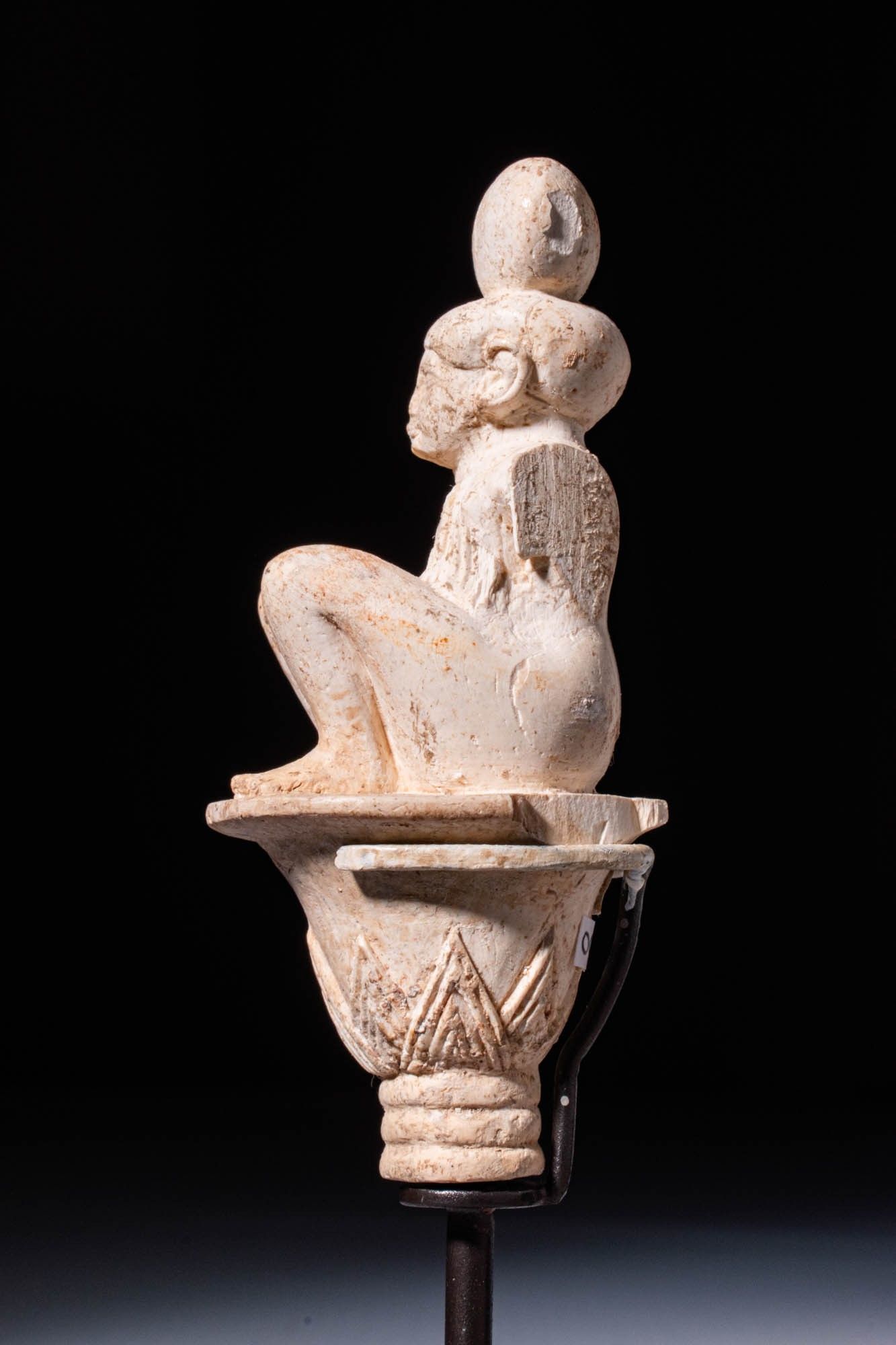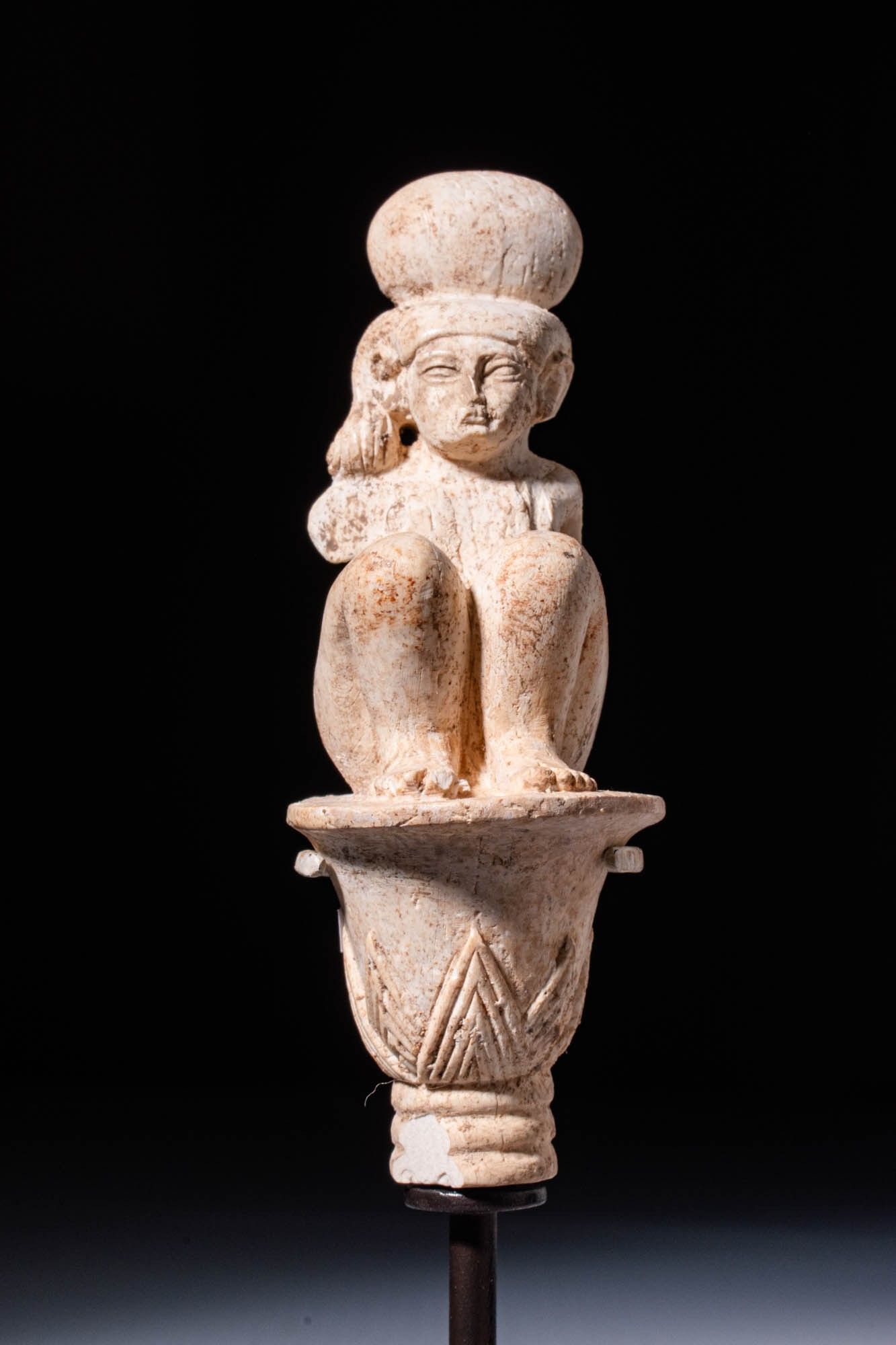 New Kingdom, Ca. 1550 - 1069 BC. A slender, rare stone stopper with a statuette of Harpocrates. The finely detailed portrait depicts the nude upper body of a young sun god with delineated musculature and the characteristic sidelock of youth draped over his shoulder from a bald head. The overall physiognomy comprises small eyes, a broad nose, and prominent lips. The statuette is atop a column capital adorned with lotus leaves. According to the beliefs of the Ancient Egyptians, the sun god was born out of the Nun, the primaeval waters inside a blue lotus flower, which opened to reveal him on the first morning. Reviewed by Simone Musso, consultant curator for Egyptian antiquities at the Stibbert Museum, Florence, Italy, member of the Nuri Archaeological Expedition. Size: 70mm x 25mm; Weight: 40g Provenance: Prince collection, 1990s-2014; Naji Asfar private collection. This item has been cleared against the Art Loss Register database and comes with a confirmation letter.