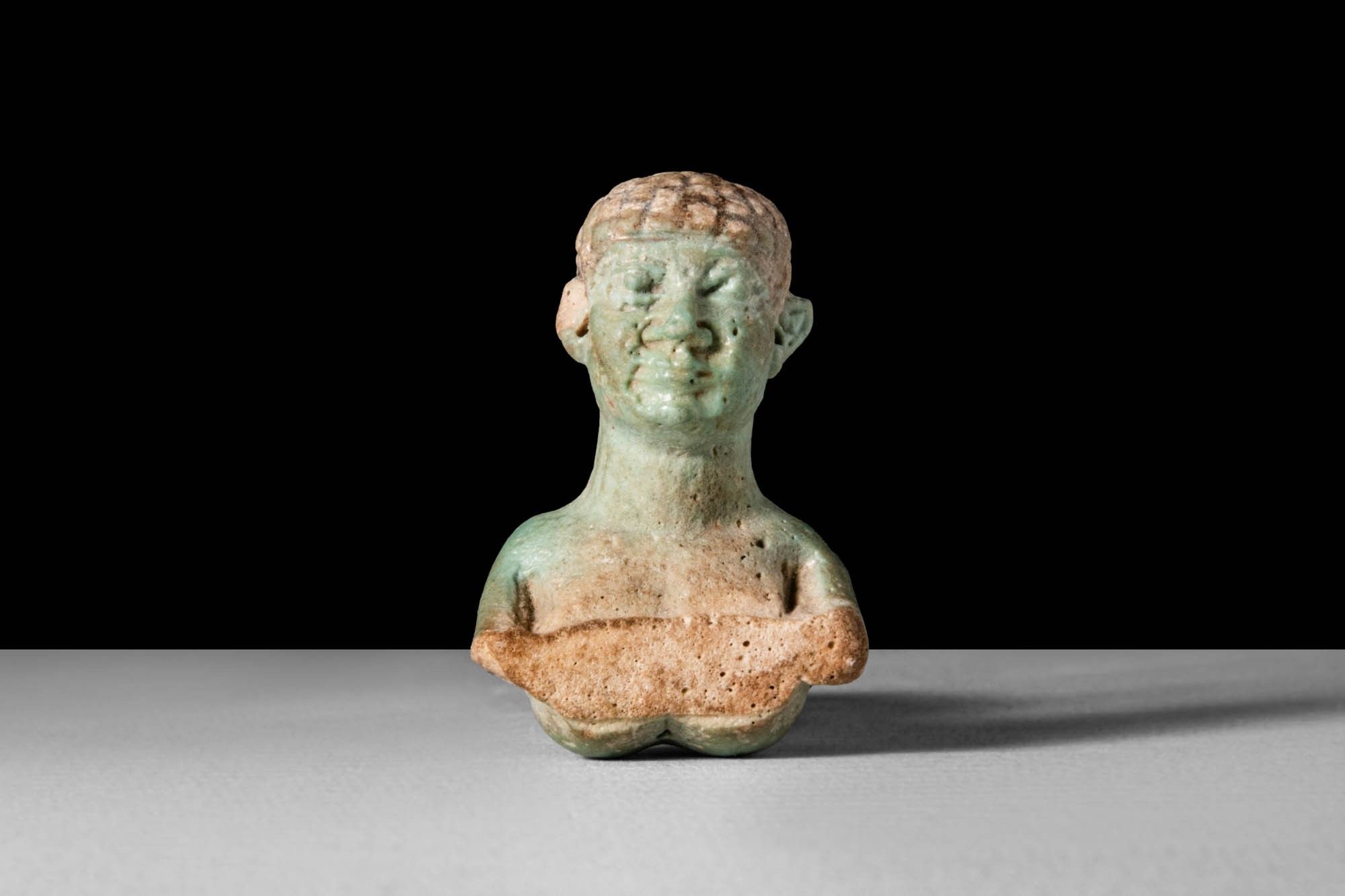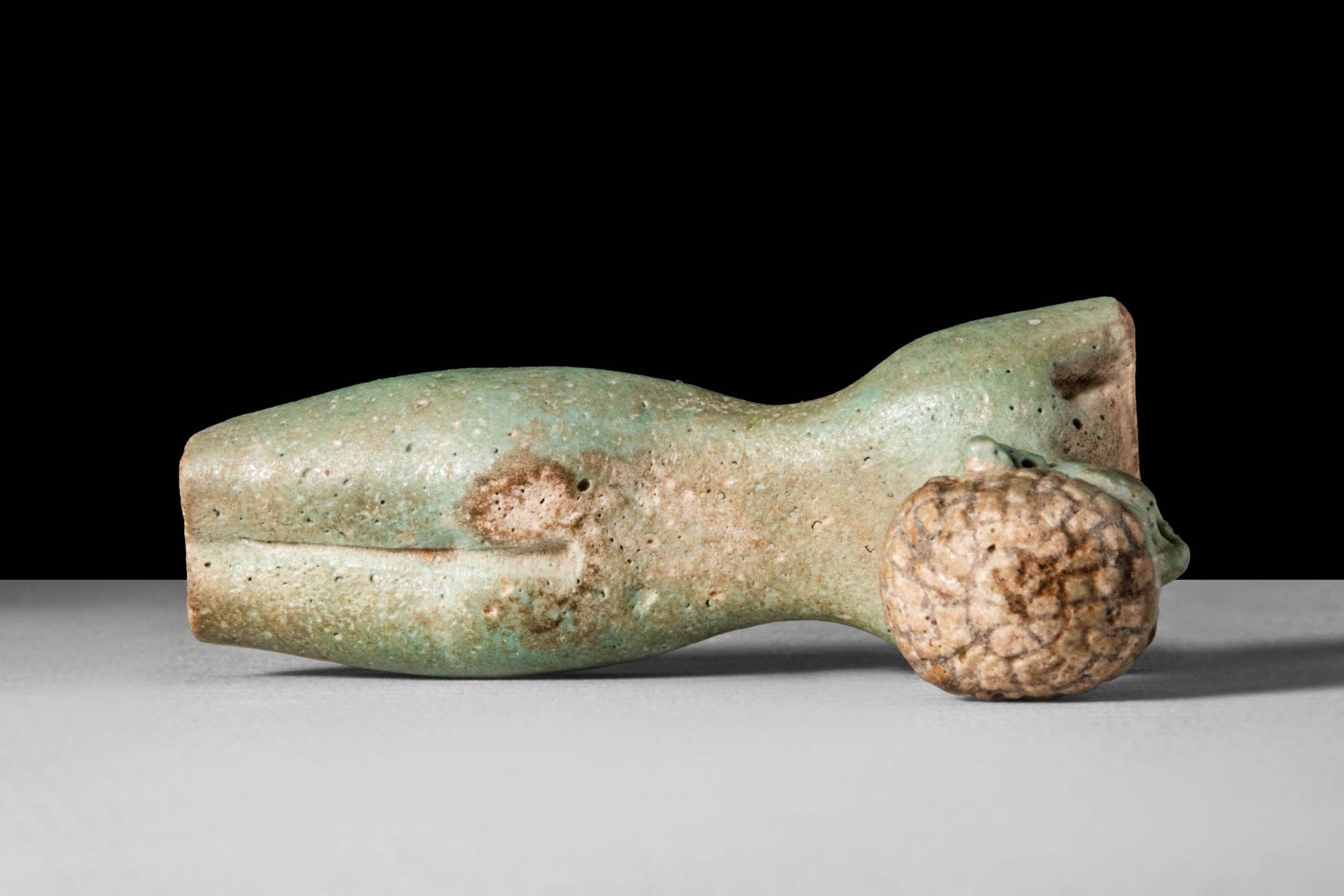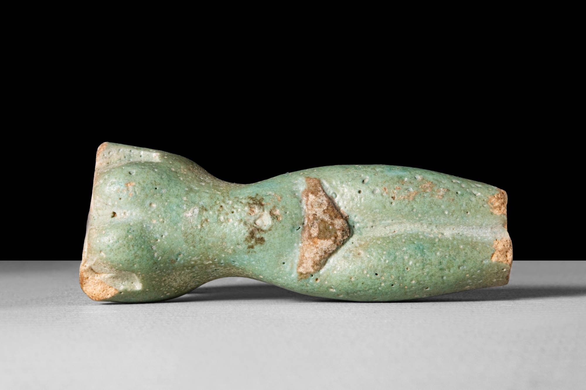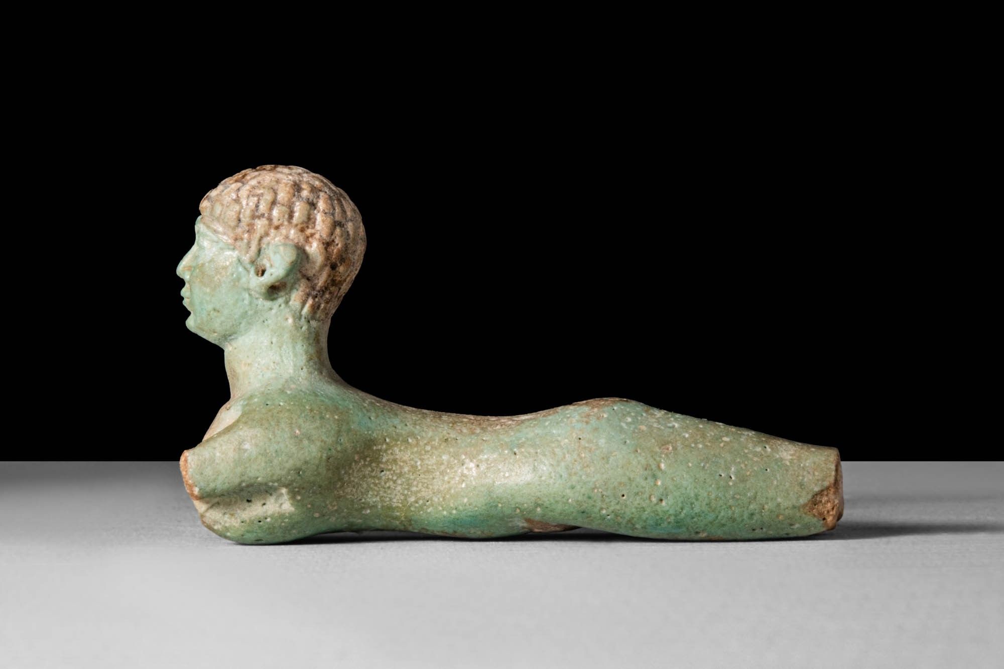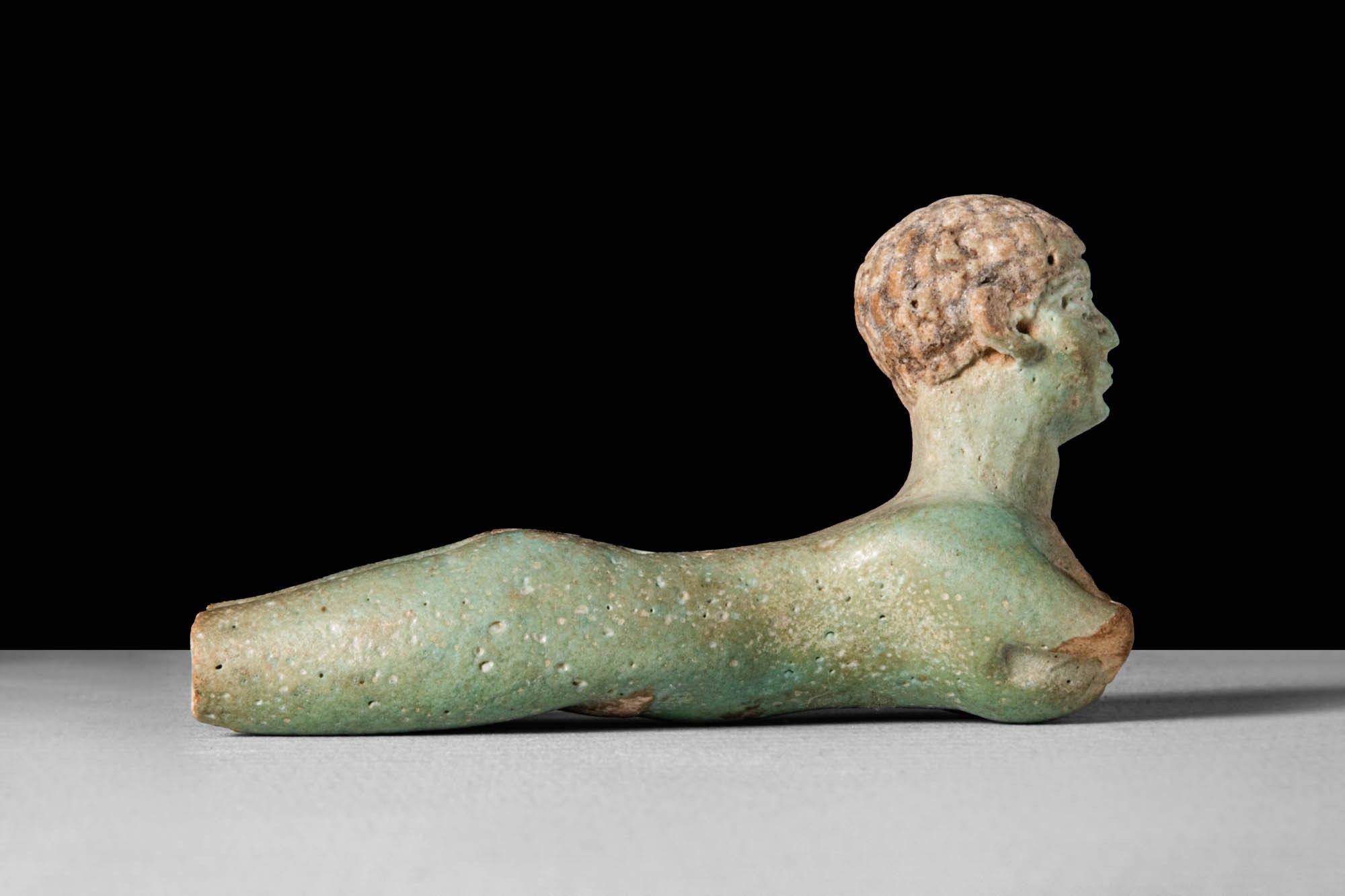 Third Intermediate Period, Ca. 943 - 716 BC. A light green faience offering spoon in the form of a nude female figure depicted in a prone swimming posture. The figure is modelled with the legs joined and extended straight behind. Breasts and navel are clearly indicated, and the arms, originally stretched forward, would have supported a now-missing shallow basin. The head is rendered with finely detailed facial features and a striated wig, with traces of black glaze preserved in the cavities. For similar see: J. Bulté, 'Earthenware and stone offering spoons, messengers of well-being and prosperity' in Revue d'Égyptologie, Paris, 2008, pp. 1-17. Size: 55mm x 30mm; Weight: 15g Provenance: Prince collection, 1990s-2014; Ex. Private collection 1970s-1990s. This item has been cleared against the Art Loss Register database and comes with a confirmation letter.