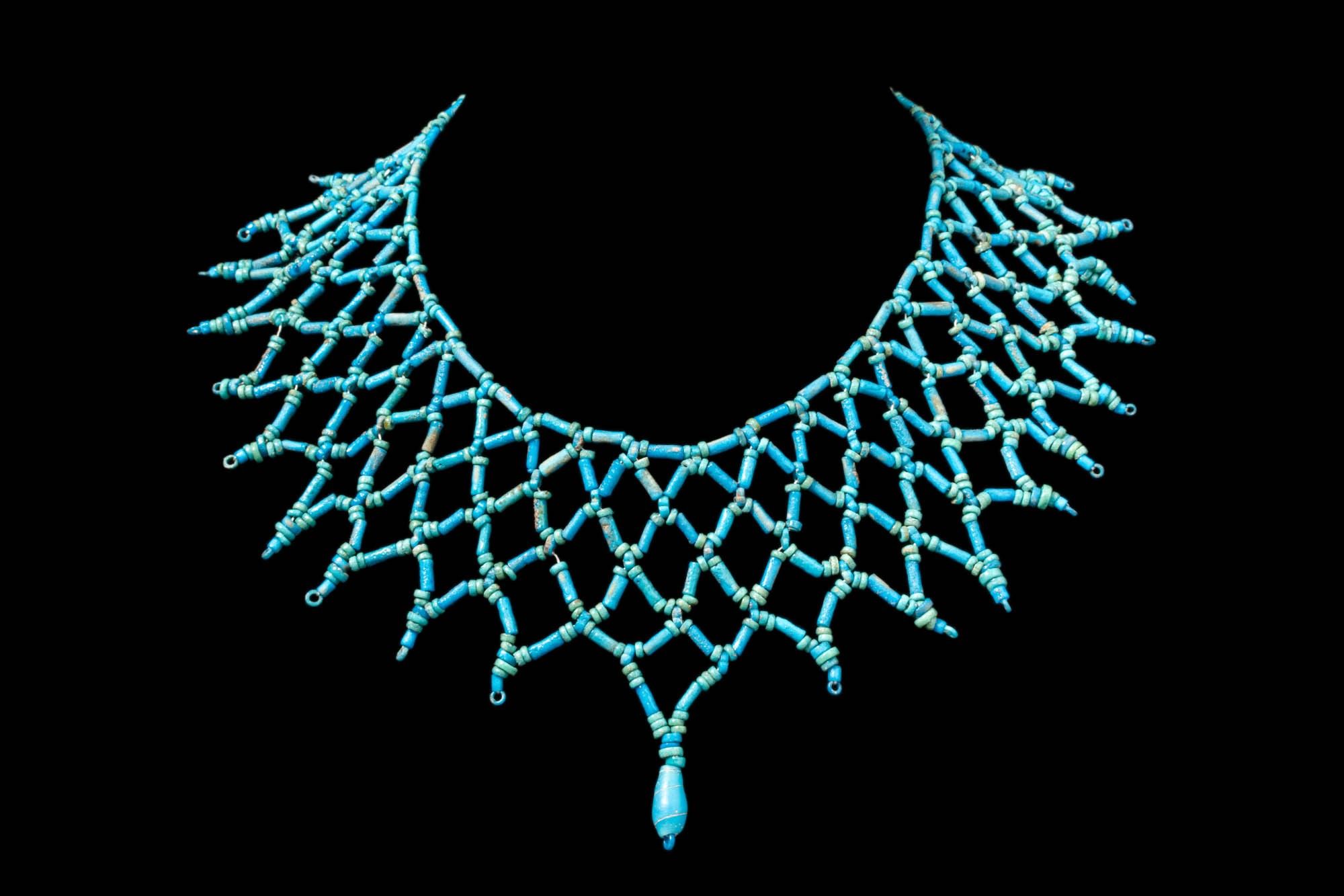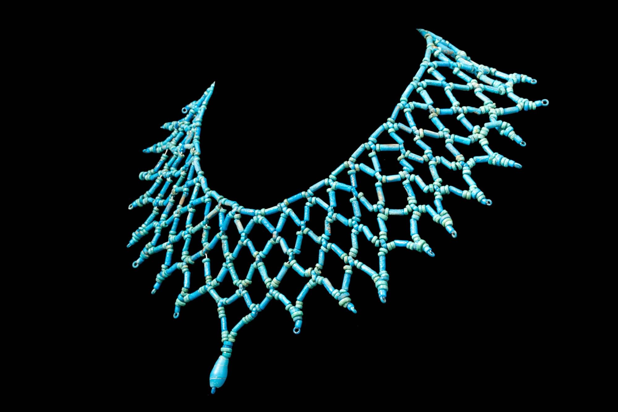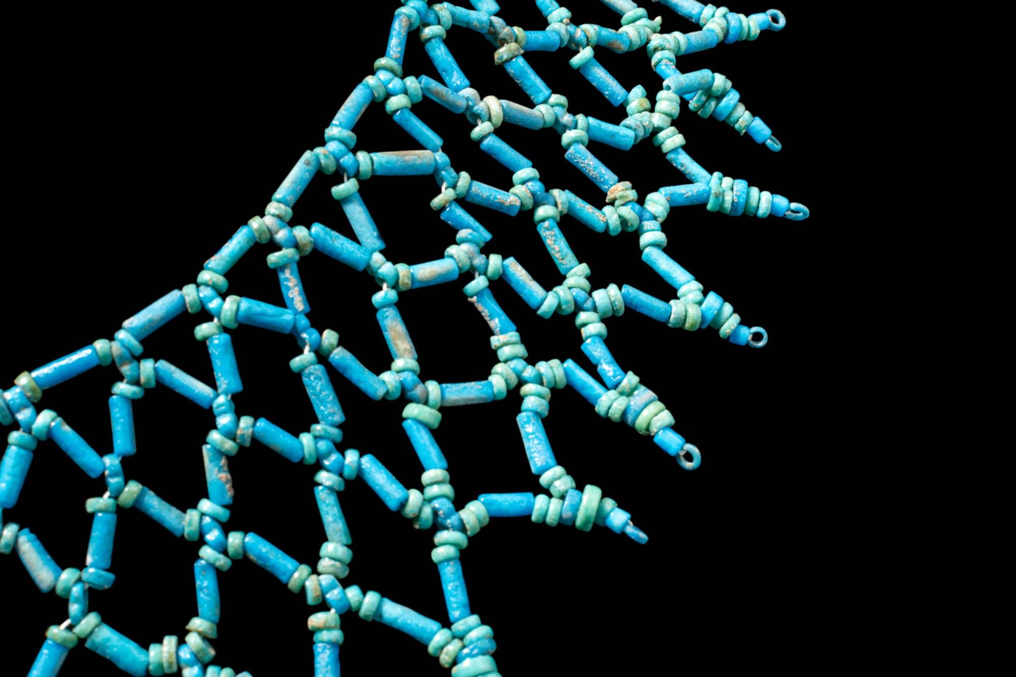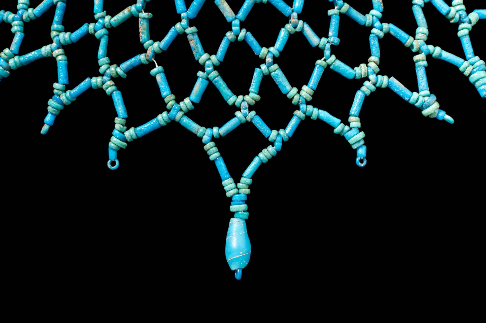 Third Intermediate Period, Ca. 1069 - 664 BC. A restrung necklace featuring an intricate openwork design of small, annular and slightly elongated faience beads arranged in a geometric pattern. The arrangement interlocks to form a lacy effect that broadens towards the lower section. At the centre, a single bead is suspended as a pendant. Reviewed by Simone Musso, consultant curator for Egyptian antiquities at the Stibbert Museum, Florence, Italy, member of the Nuri Archaeological Expedition. Size: 220/440mm x 8mm; Weight: 28/87g Provenance: Private UK collection, acquired on the US art market; Ex. Donald Wonder collection (1938-2023), California & New Jersey; thence by descent; Ex. Harmer Rooke Galleries, New York, prior to 6 December 1983. This item has been cleared against the Art Loss Register database and comes with a confirmation letter.