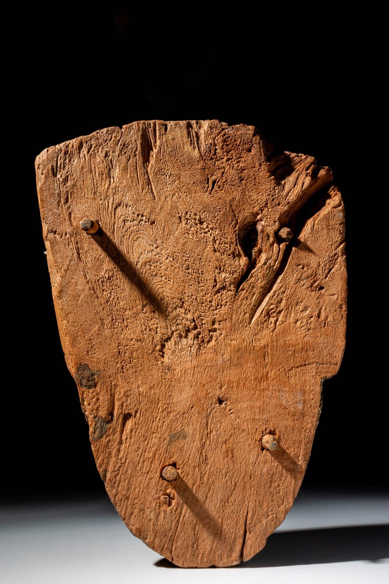 Late Period to Ptolemaic Period, Ca. 664 - 30 BC. A wooden mask from a sarcophagus with a rounded face, short nose, and narrow, slightly curved lips. The eyes are almond-shaped and defined with black cosmetic lines extending towards the temples. The brows are thin and arched, painted in black. The flat backside features attachment pegs for securing the mask to the sarcophagus. For similar see: Christie's, Live Auction 7207, Antiquities, Lot 59. Size: 260mm x 170mm; Weight: 575g Provenance: Private London collection; previously French art market 1970s/1980s. This item has been cleared against the Art Loss Register database and comes with a confirmation letter. Reviewed by Simone Musso, consultant curator for Egyptian antiquities at the Stibbert Museum, Florence, Italy, member of the Nuri Archaeological Expedition.