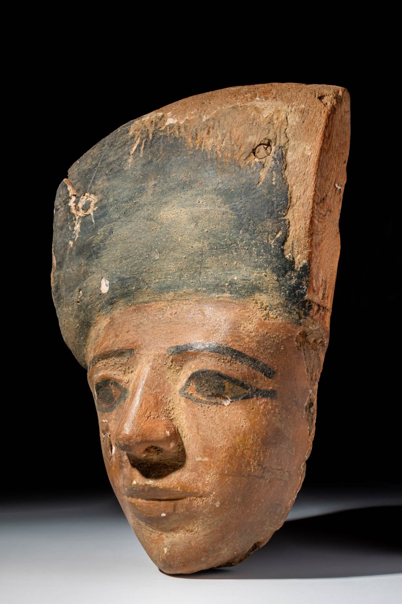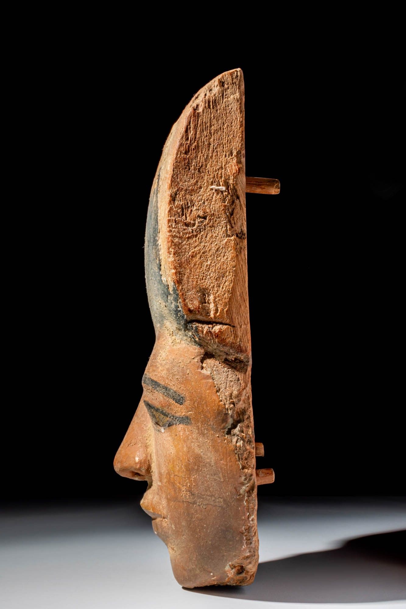 EGYPTIAN PAINTED WOODEN SARCOPHAGUS MASK.