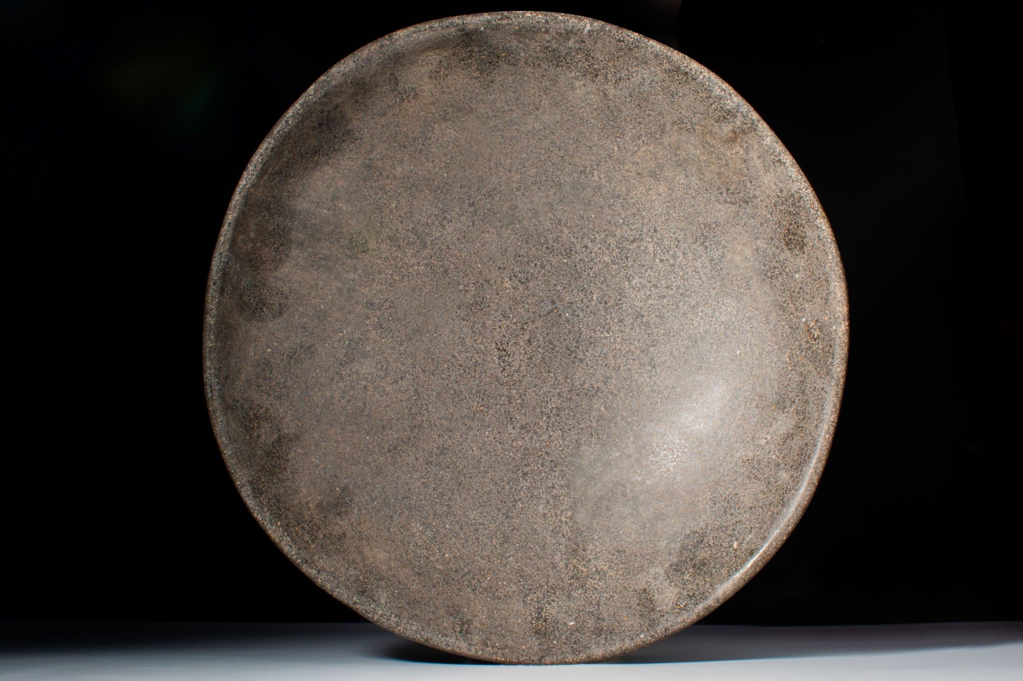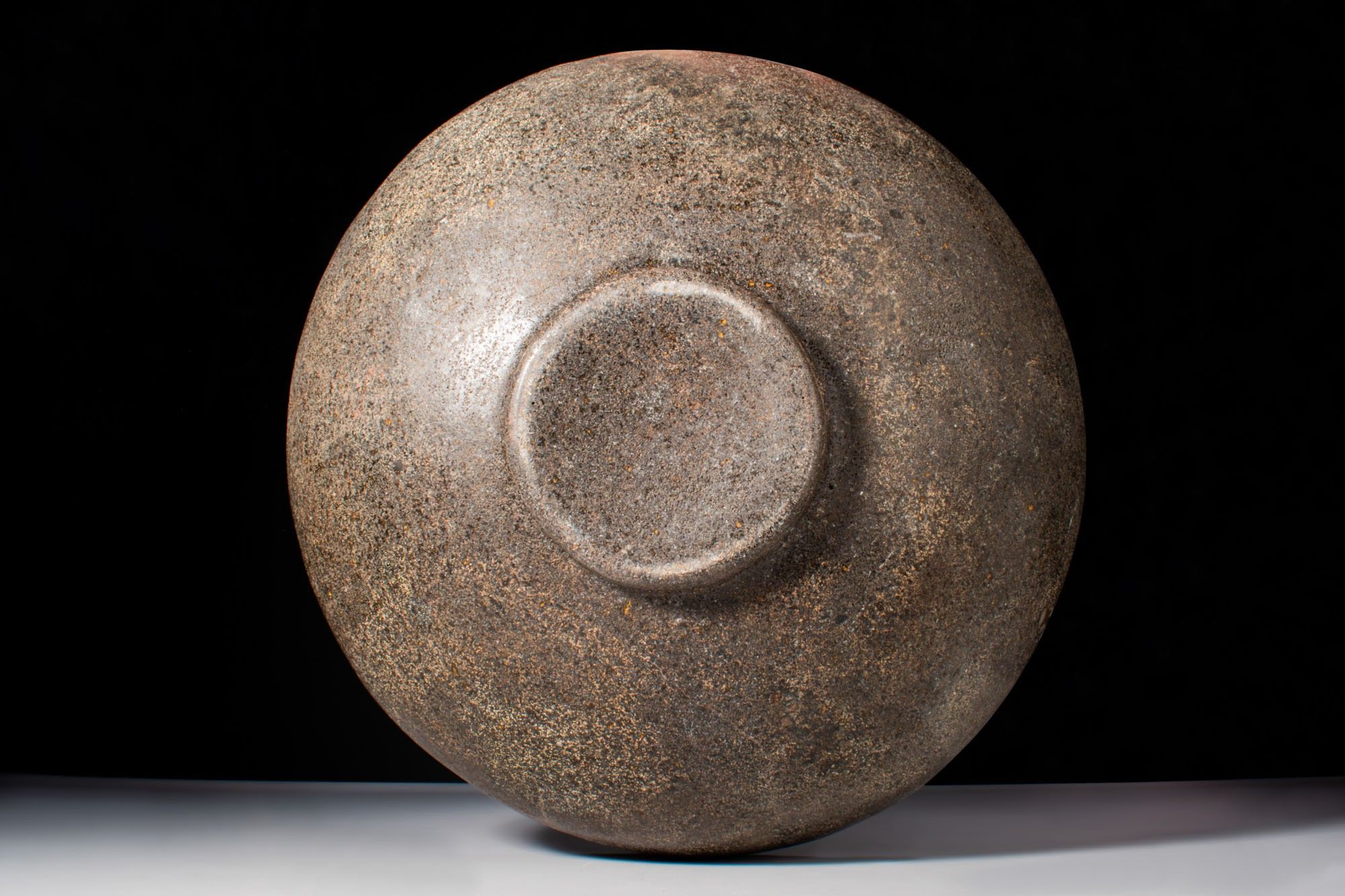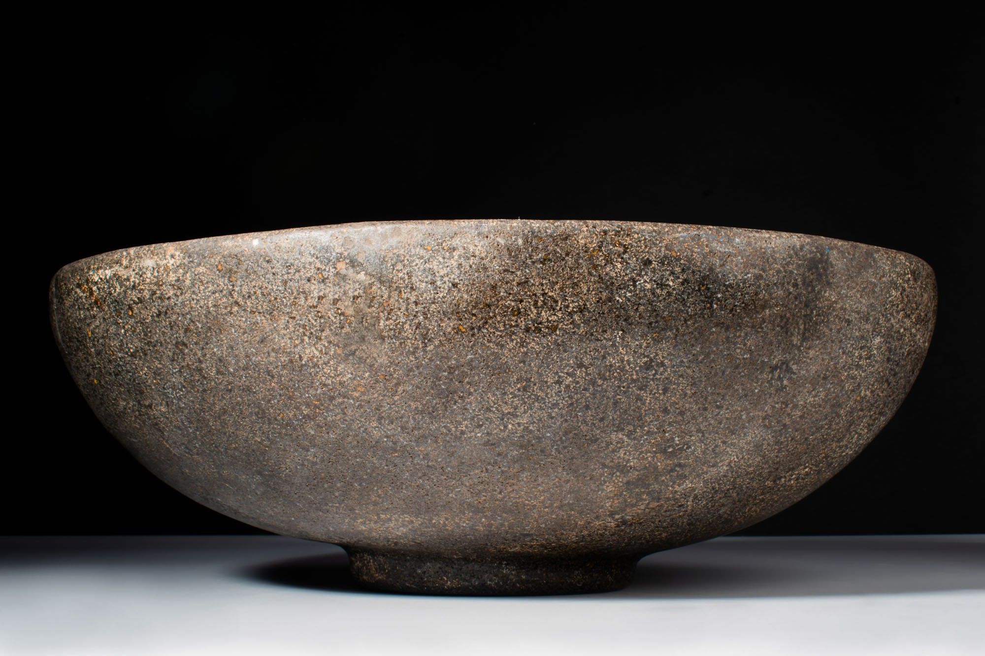 A speckled stone offering bowl with a wide hemispherical body raised on a low ring foot.