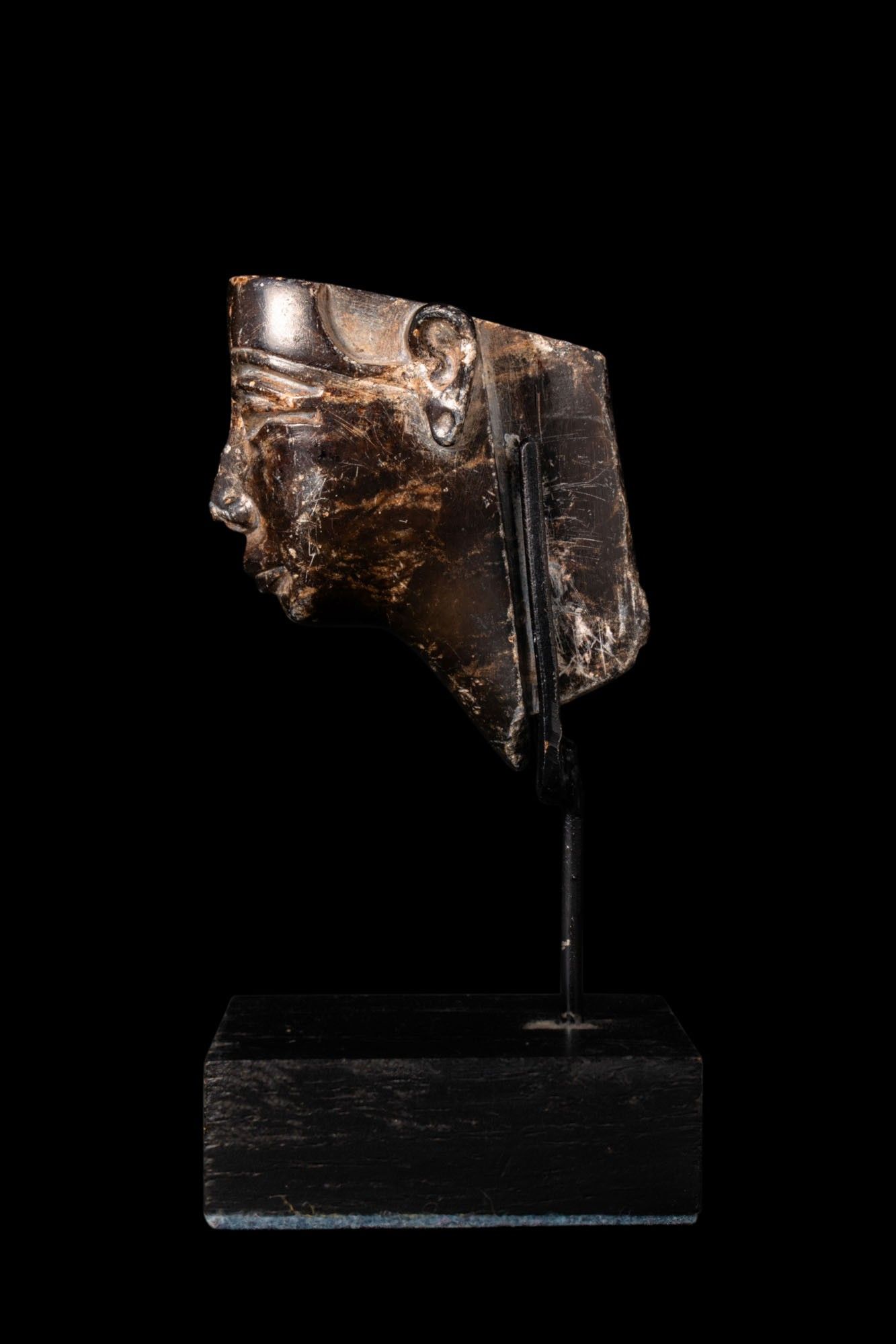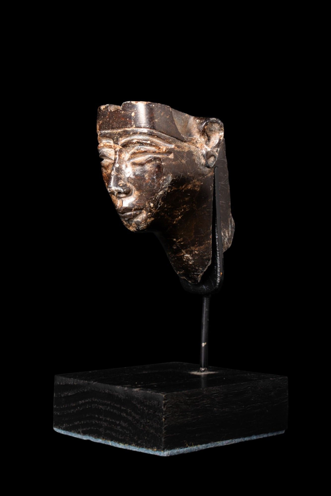 Amarna Period, Ca. 1353 - 1336 BC or later. A hard black stone head of Queen Nefertiti, carved with a flat-topped crown and a long tapering neck. The face has almond-shaped eyes beneath incised brows, a straight nose, and a small, closed mouth with defined lips. Prominent ears project to the sides. Mounted. For similar see: Brooklyn Museum, Accession Number 34.6042; Christie's, Live Auction 19738 Antiquities, Lot 6; Christie's, Live Auction 20677 Antiquities, Lot 13. Size: 100mm x 50mm; Weight: 131g Provenance: Private UK collection; From an old British collection formed in the 1990s. This piece is accompanied by a historical report from Alessandro Neri, an international Cultural Heritage expert based in Florence, Italy. This piece is accompanied by a historical and authentication report from Manfredi Maria Vaccari, archaeologist and antiquities expert of Chimera Heritage Consultants. This piece is accompanied by a historical report from Lisa Sartini, Egyptologist PHD of Chimera Heritage Consultants. This item has been cleared against the Art Loss Register database and comes with a confirmation letter.