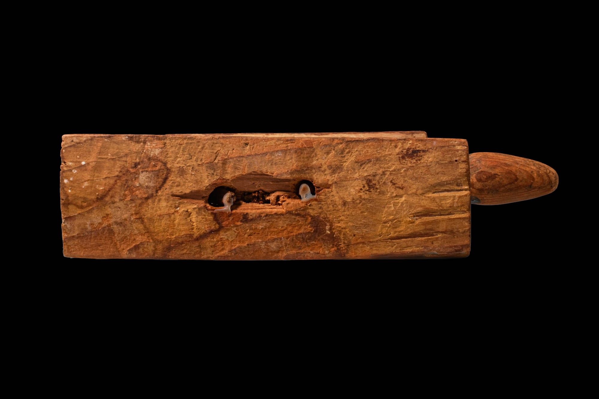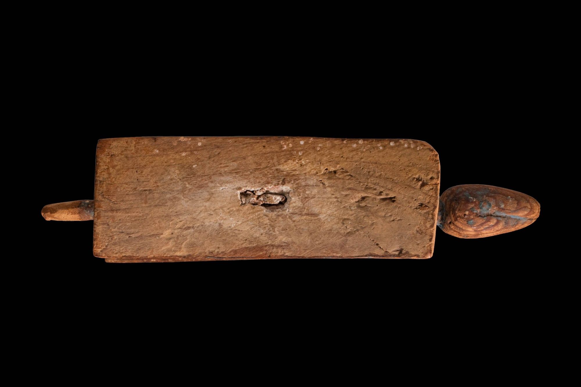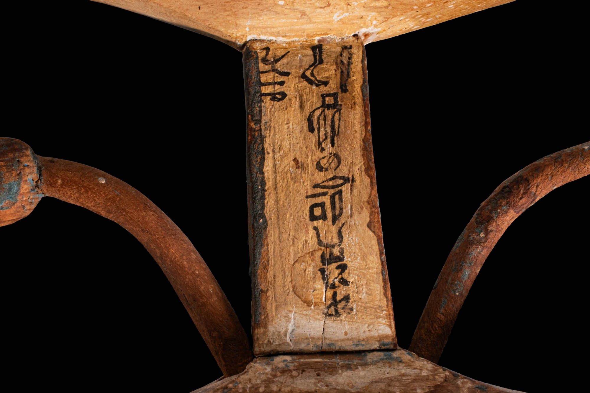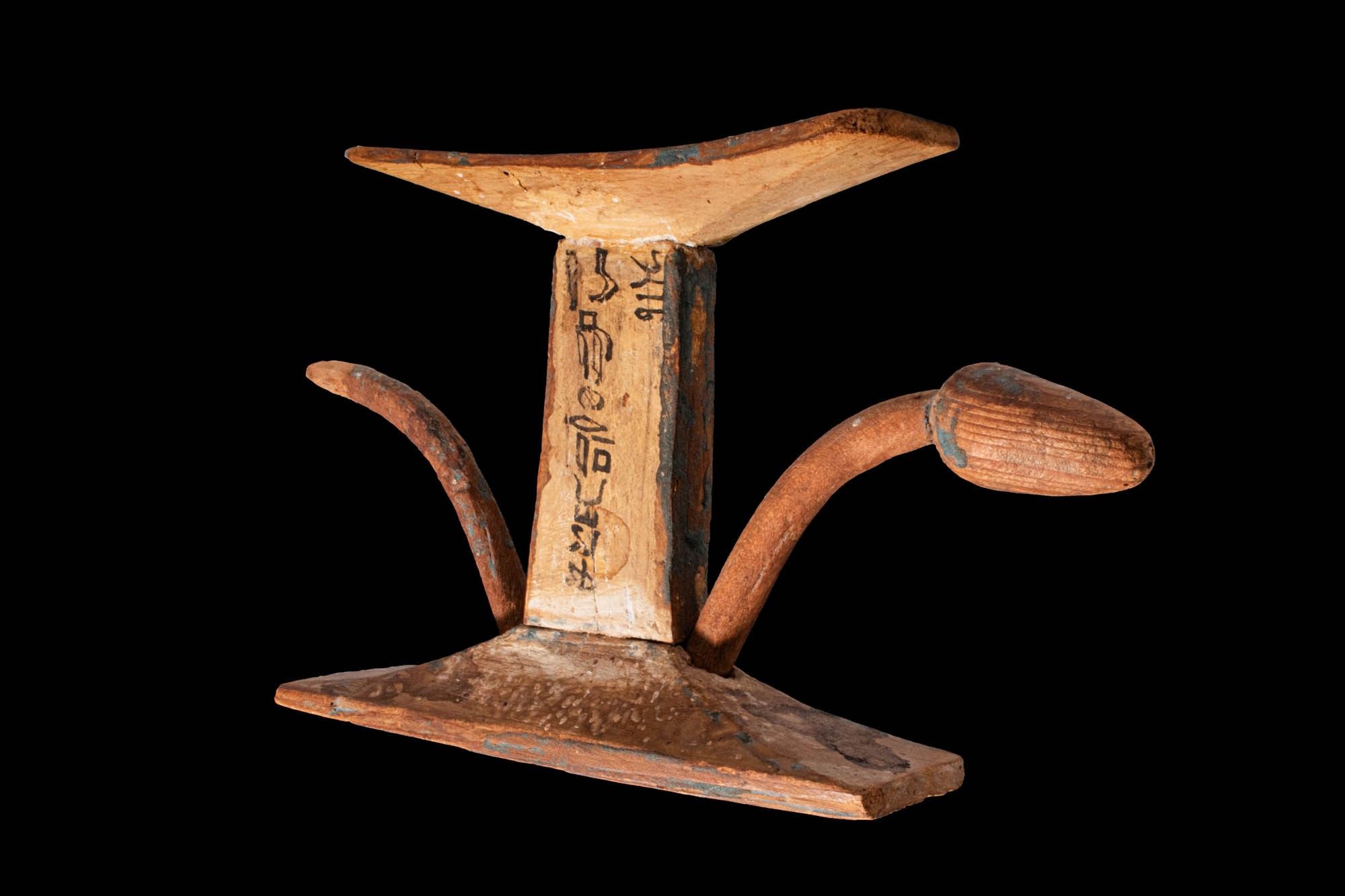 Middle Kingdom, Ca. 2055 - 1790 BC. A wooden headrest composed of a broad base supporting a tall shaft, surmounted by a concave neck rest. Two carved lotus buds project from the lower section of the shaft, just above the base. The front face of the shaft bears two vertical cursive inscriptions in black ink, reading: 'The favoured one before Anubis, Oupaï, justified.' Traces of red and black pigment remain on the surface. Size: 230mm x 150mm; Weight: 160g Provenance: Prince collection, 1990s-2014; Ex. Jacques Billen (Guerlind Corporation), 21 November, 2009. This item has been cleared against the Art Loss Register database and comes with a confirmation letter.