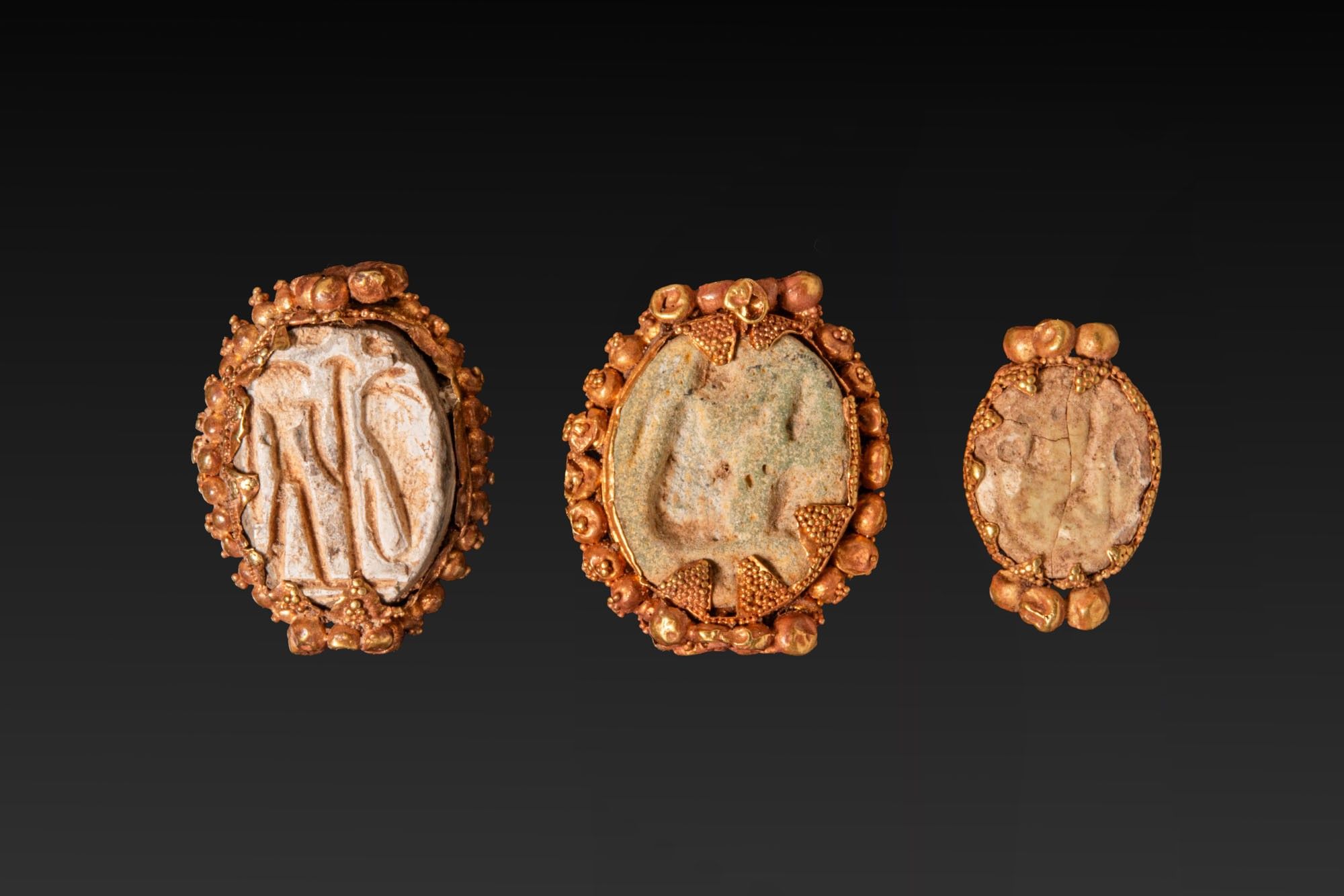 A collection of three scarabs, each set in an oval gold collet within a dense granulated wreath, the undersides engraved with hieroglyphs.