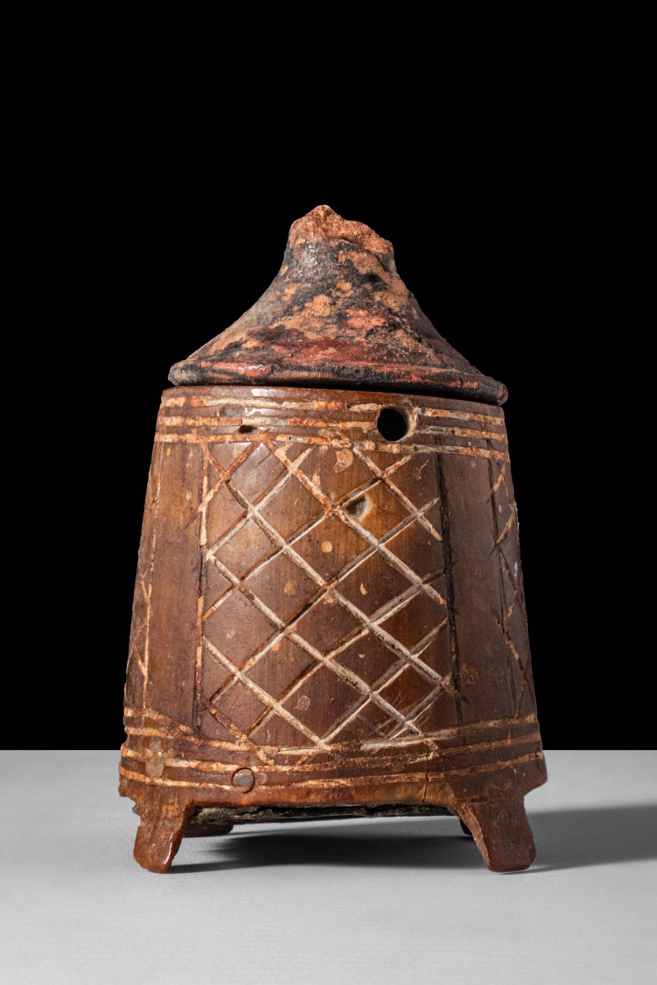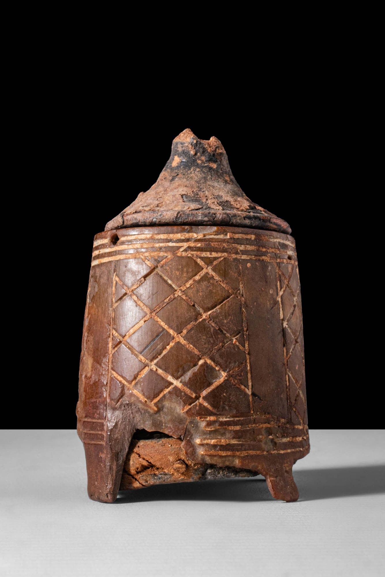 EGYPTIAN WOOD PYXIS. Middle Kingdom, Ca. 2030 - 1650 BC. A truncated cone wood pyxis supported on four short legs. The exterior is decorated with incised checkerboard panels and framed by parallel bands near the top and base. A separate conical lid fits over the opening. Size: 80mm x 65mm; Weight: 45g Provenance: Prince collection, 1990s-2014; Ex. Kurt Flimm, 2008. This item has been cleared against the Art Loss Register database and comes with a confirmation letter.