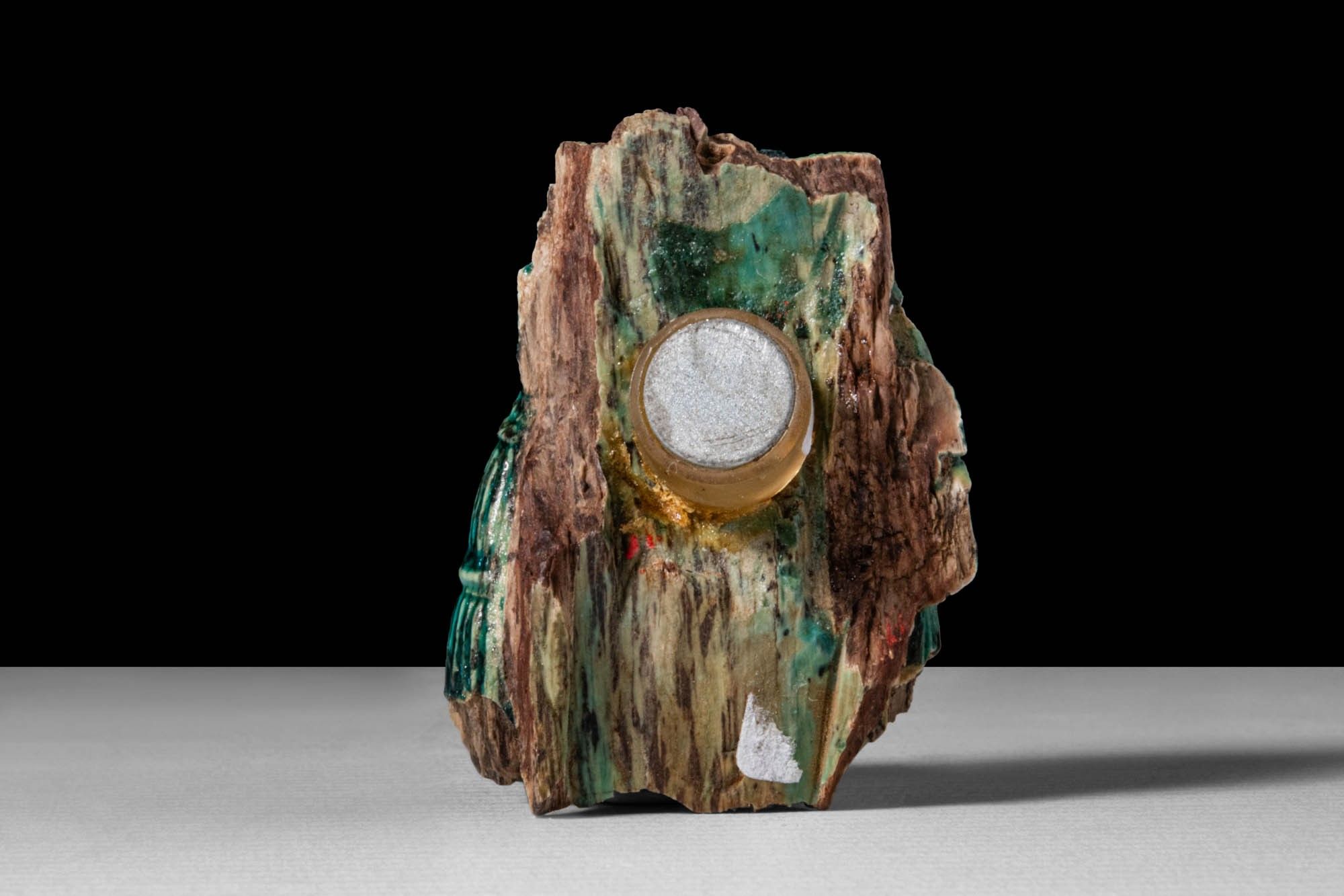 EGYPTIAN GLAZED STEATITE FRAGMENT OF A HATHORIC DOUBLE WIG. New Kingdom, Ca. 1550 - 1069 BC. A fragment of a Hathoric wig rendered in glazed steatite, preserving the upper section of the lappets. Each side displays vertically ribbed strands separated by horizontal bands. The surface is coated in a rich green glaze with darker pooling in the grooves. For similar see: Museo Internazionale della ceramica di faenze, Guida alla sezione del Vicino oriente ed Egitto antichi. Emil Edizioni, 2020, p. 33, f. 1-3. Size: 50mm x 35mm; Weight: 50g Provenance: Prince collection, 1990s-2014; Ex. Frieda 2008. This item has been cleared against the Art Loss Register database and comes with a confirmation letter.