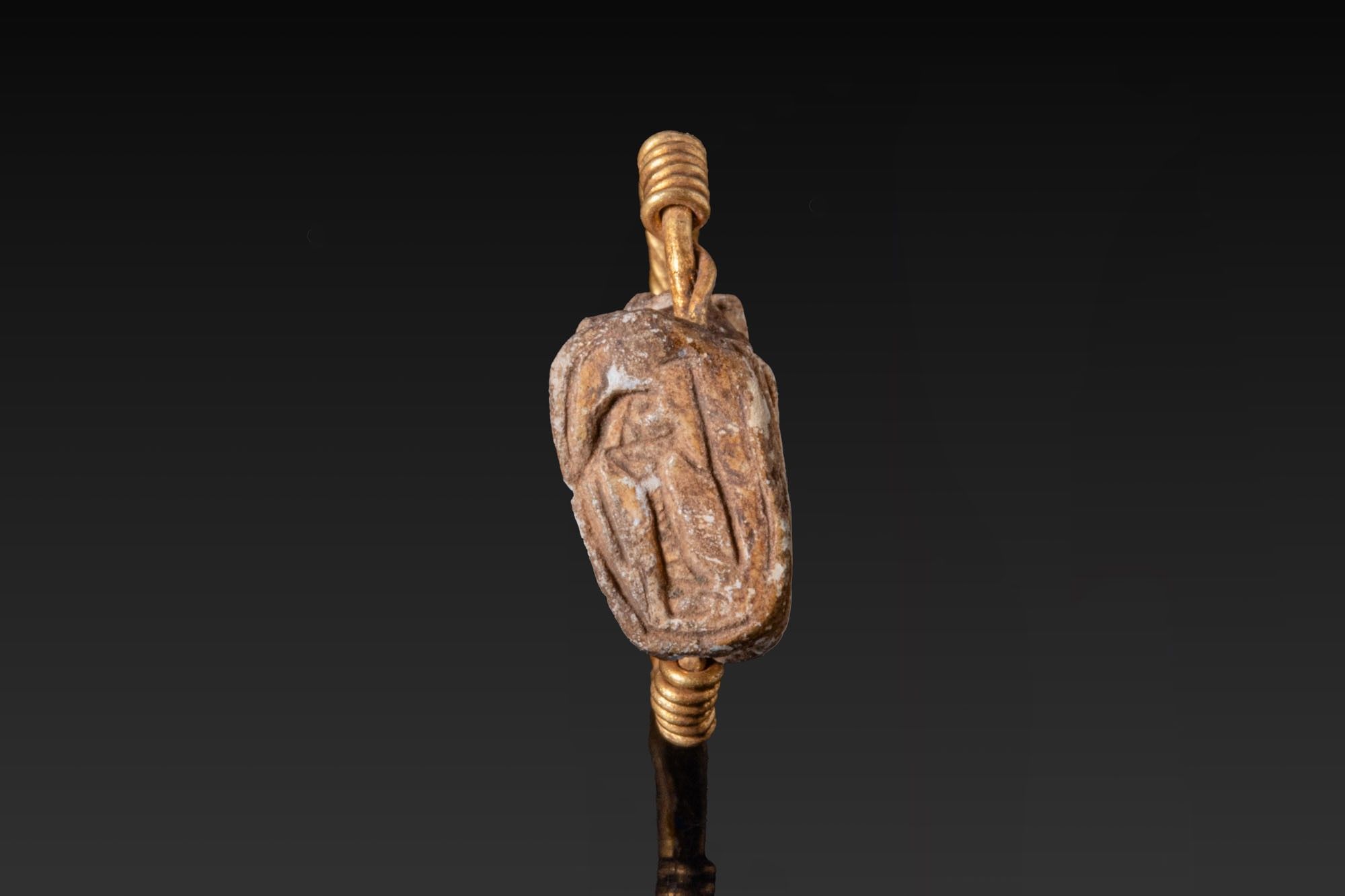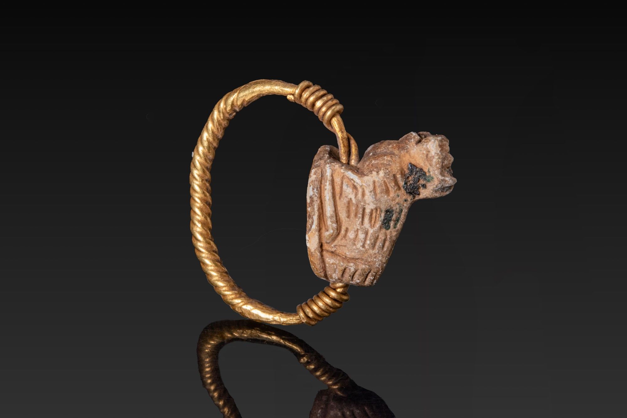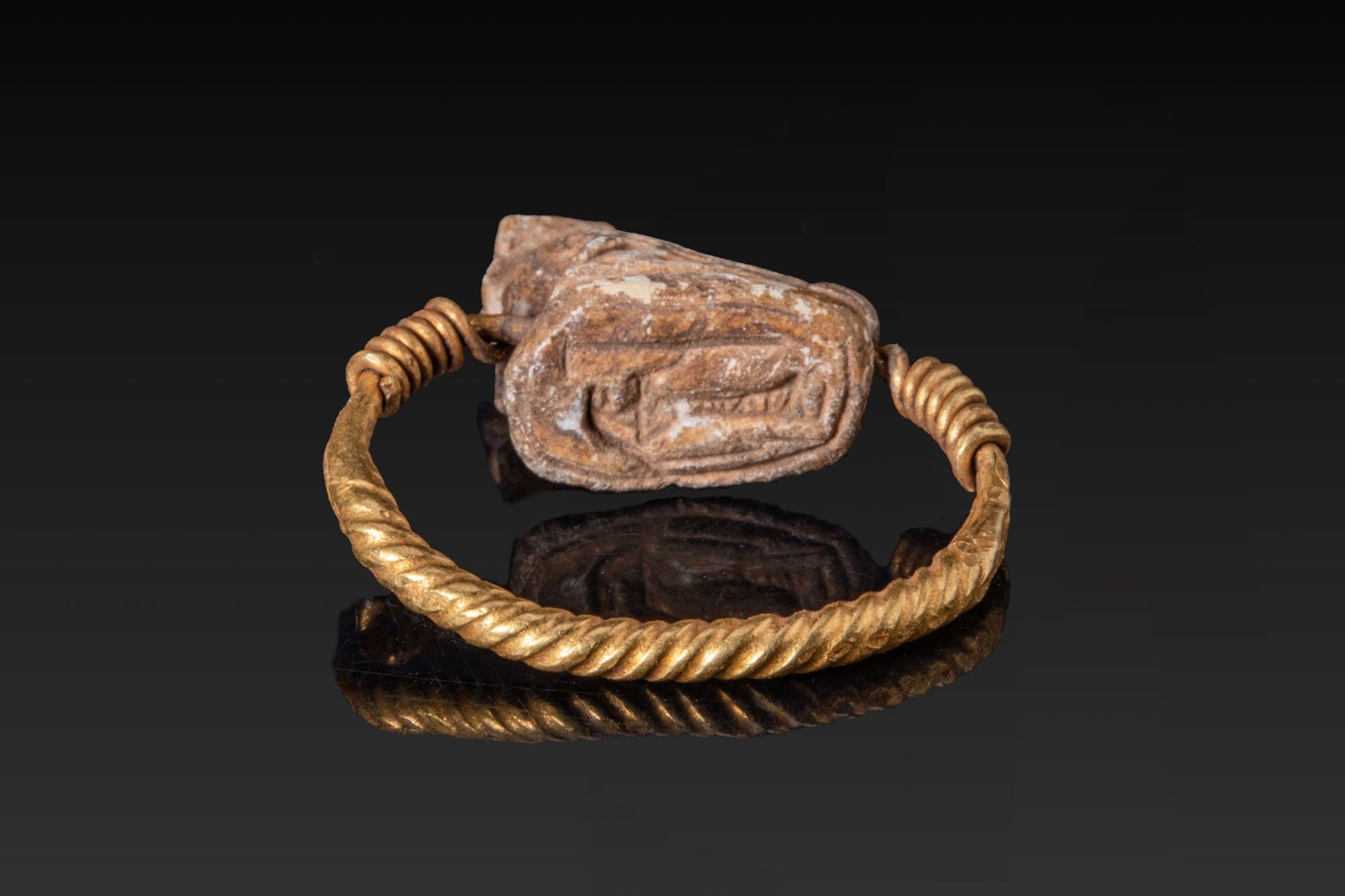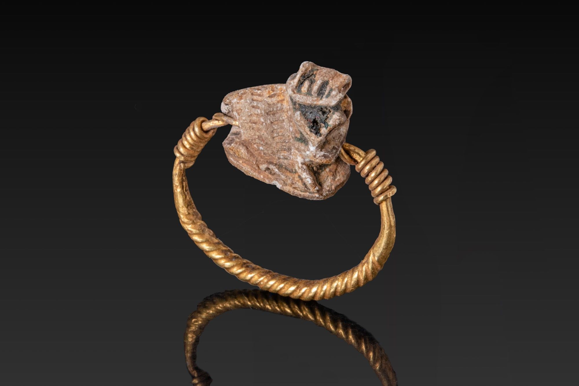 EGYPTIAN GOLD COILED RING WITH STEATITE SCARAB / FALCON. Lat…