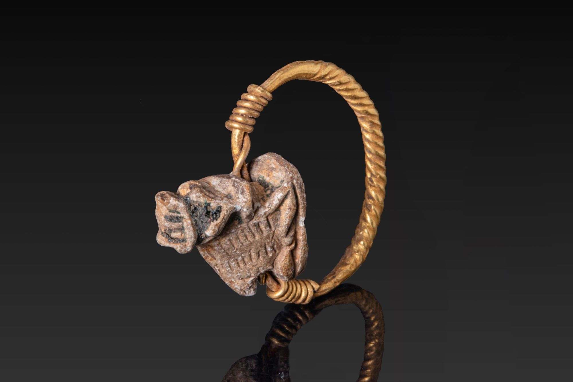 Premium EGYPTIAN GOLD COILED RING WITH STEATITE SCARAB / FALCON. Lat…