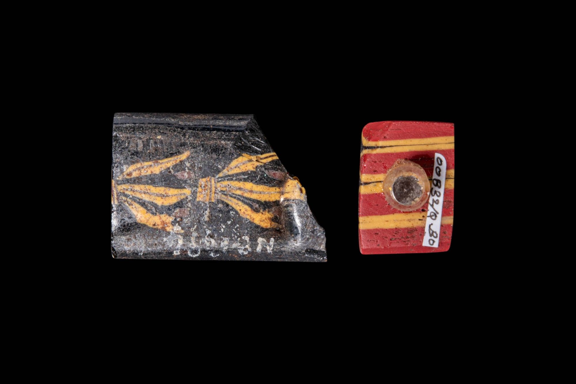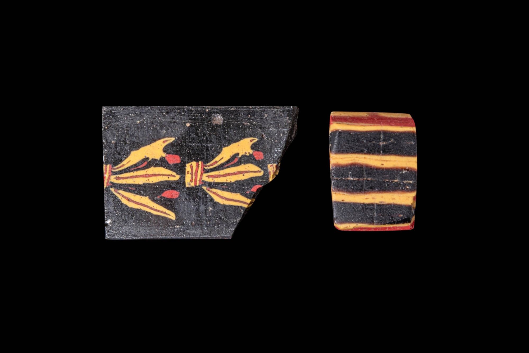 Ca. 332 BC - AD 200. A pair of glass inlays. One fragment displays a dark ground with a repetitive motif of stylised lotus flowers in yellow with red details. The other, rectangular in shape, consists of alternating dark and yellow horizontal bands with undulating contours, bordered in red. Reviewed by Simone Musso, consultant curator for Egyptian antiquities at the Stibbert Museum, Florence, Italy, member of the Nuri Archaeological Expedition. For similar see: Christie's, Live Auction 7758, The Groppi Collection, 26 April 2012, Lot 11. Size: 18-30mm x 13-20mm; Weight: 10g Provenance: Prince collection, 1990s-2014; Ex. Bonhams, Sale 1685328 Oct. 2009. Lot. 287. This item has been cleared against the Art Loss Register database and comes with a confirmation letter.