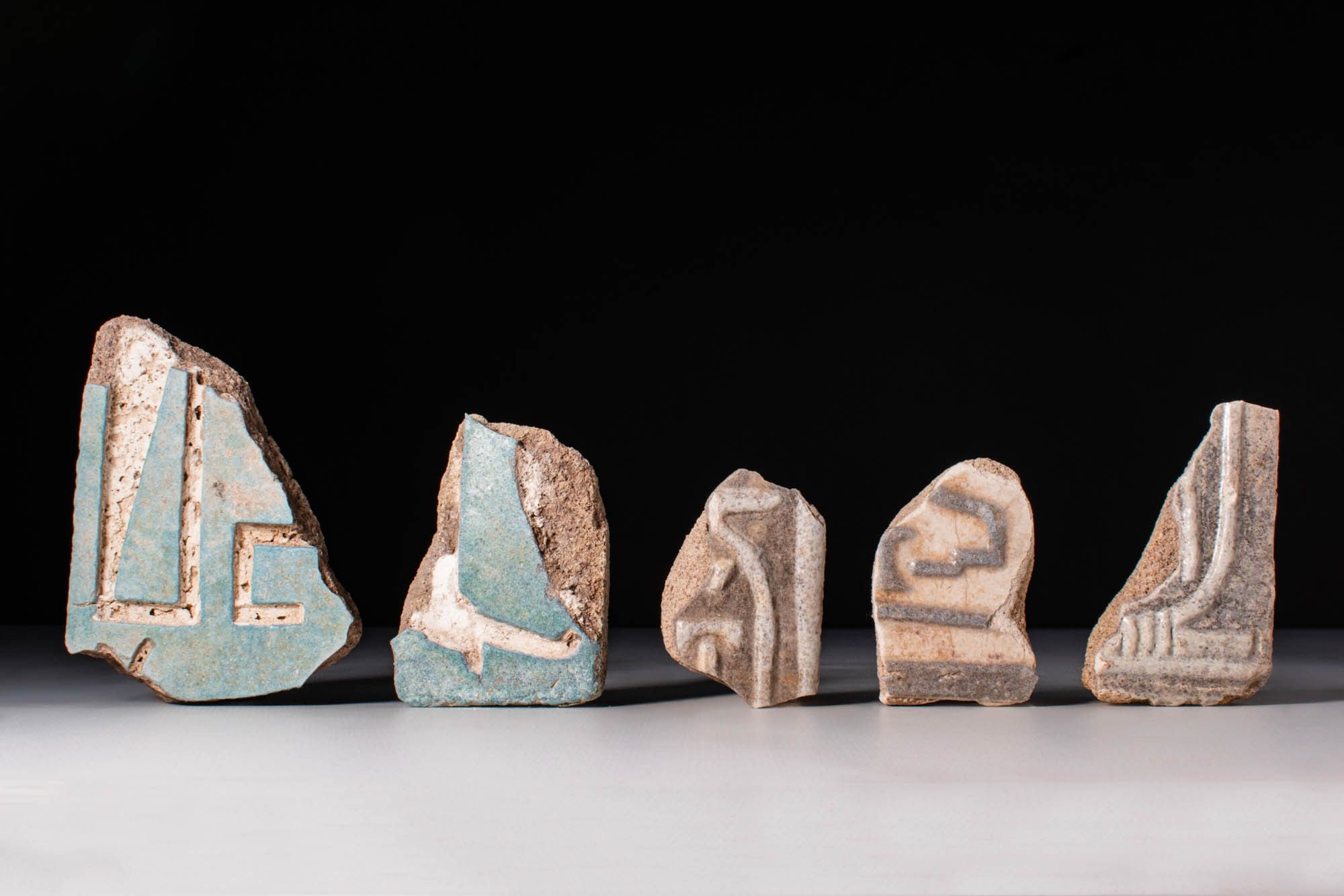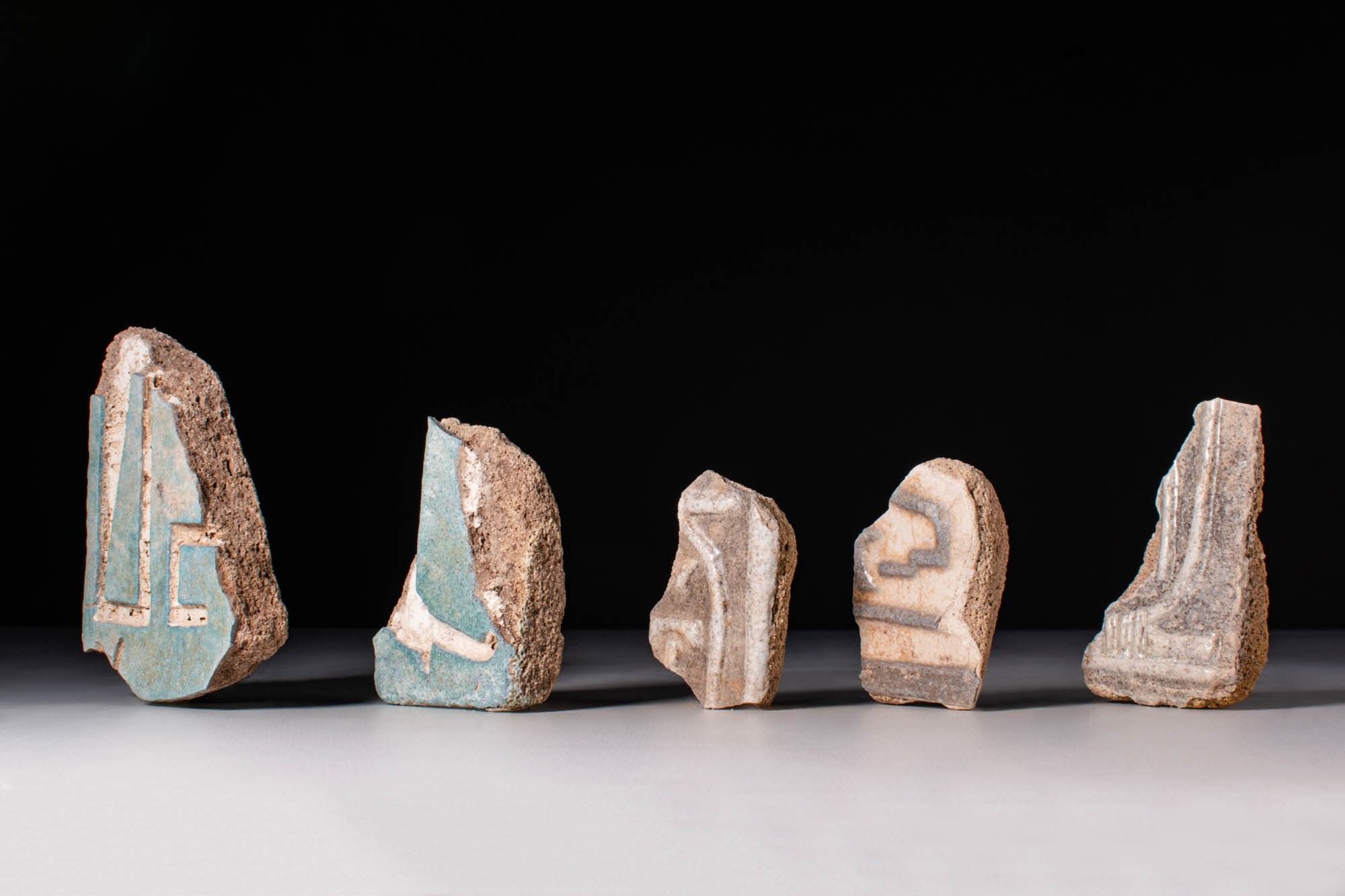 New Kingdom, 19th Dynasty, Ca. 1293 - 1070 BC. A group of fragments of inlaid faience tiles depicting geometric motifs with differents colours and shapes, most likely from Qantir, New Kingdom. Size: 55-95mm x 35-70mm; Weight: 270g. Provenance: Prince collection, 1990s-2014; Ex. James Ede, 2012; with Khawam brothers, Cairo, 1950s, thence European private collection. This item has been cleared against the Art Loss Register database and comes with a confirmation letter. Reviewed by Simone Musso, consultant curator for Egyptian antiquities at the Stibbert Museum, Florence, Italy, member of the Nuri Archaeological Expedition.