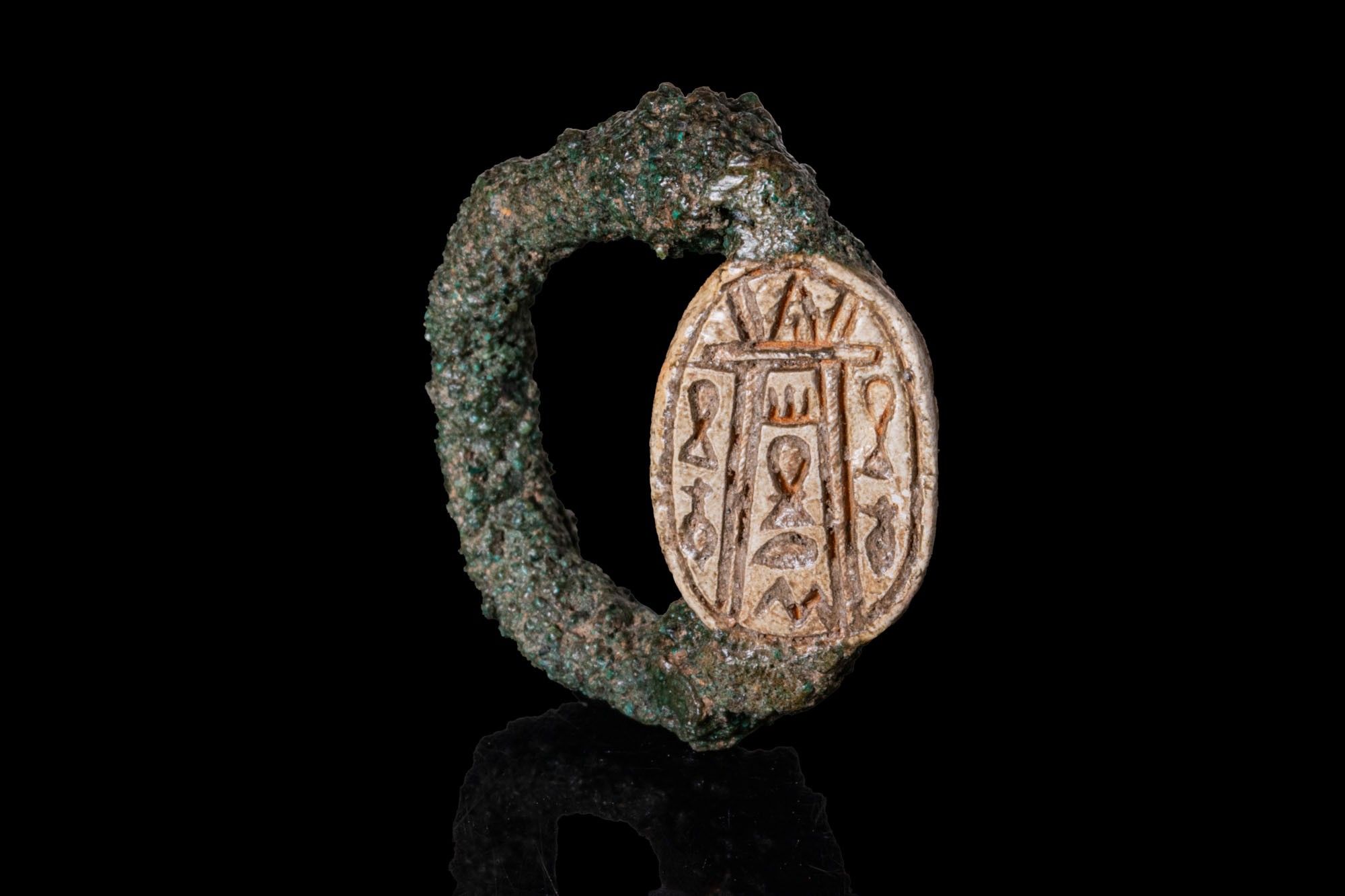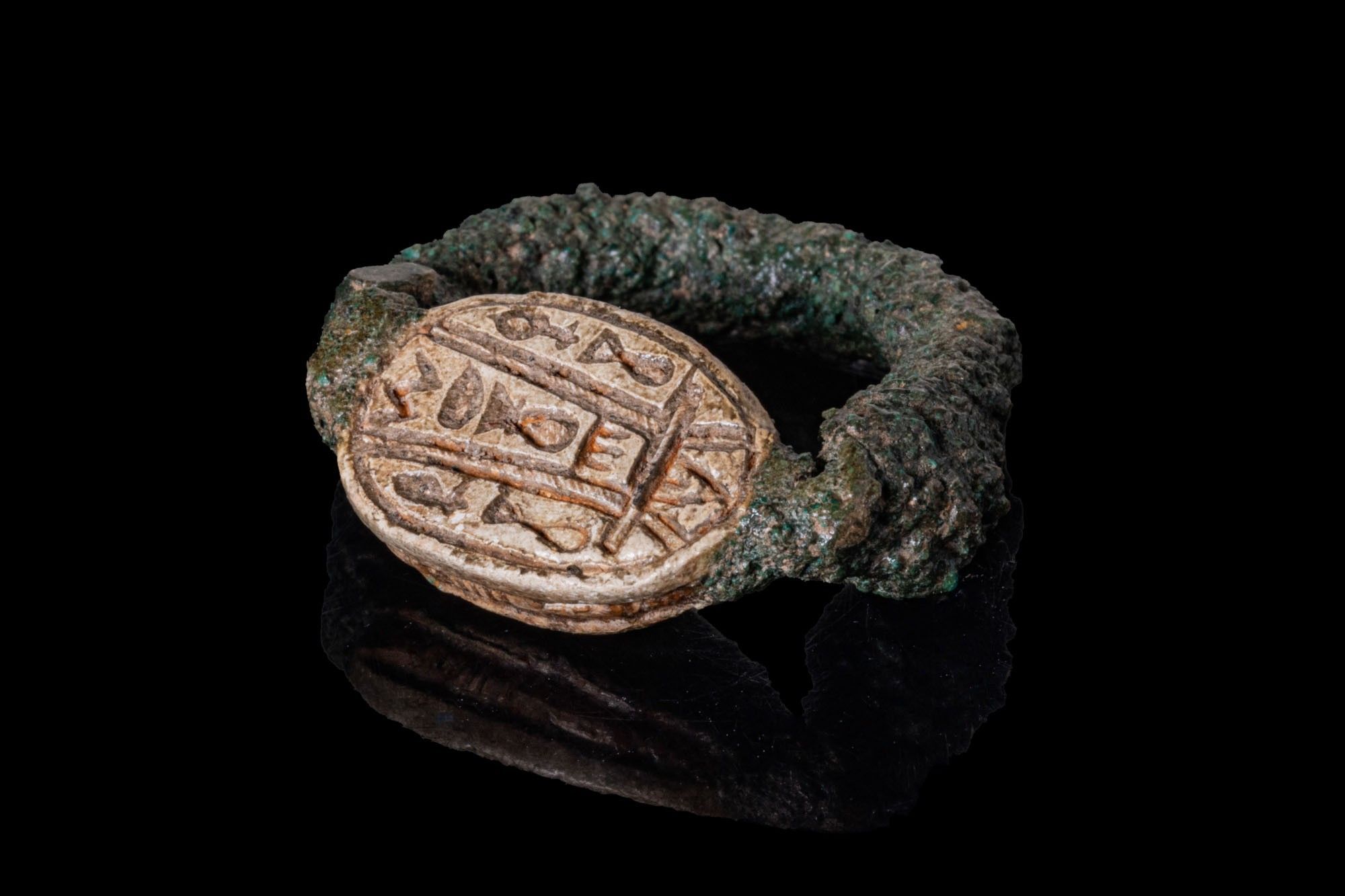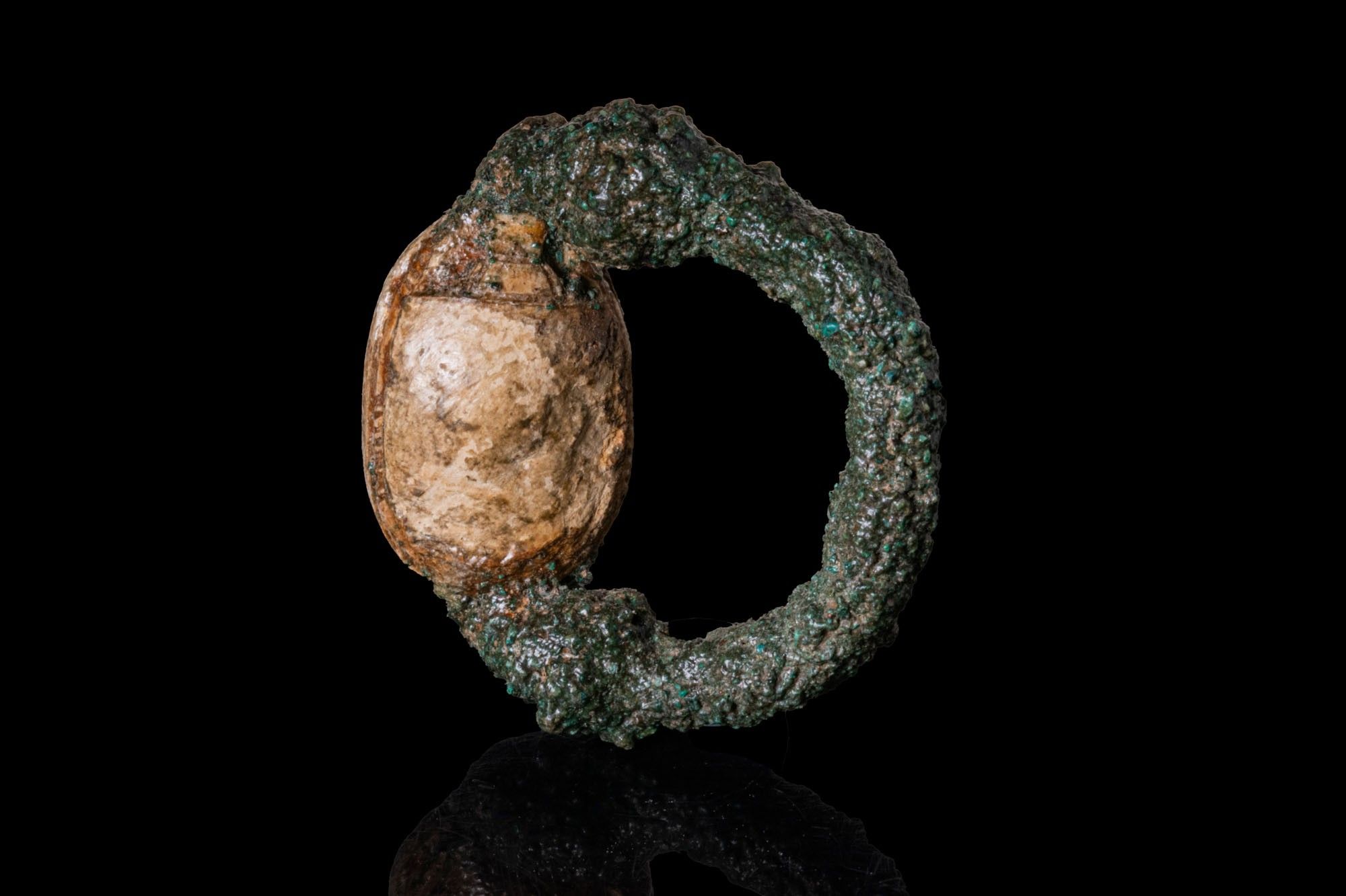 EGYPTIAN BRONZE RING WITH STEATITE SCARAB.