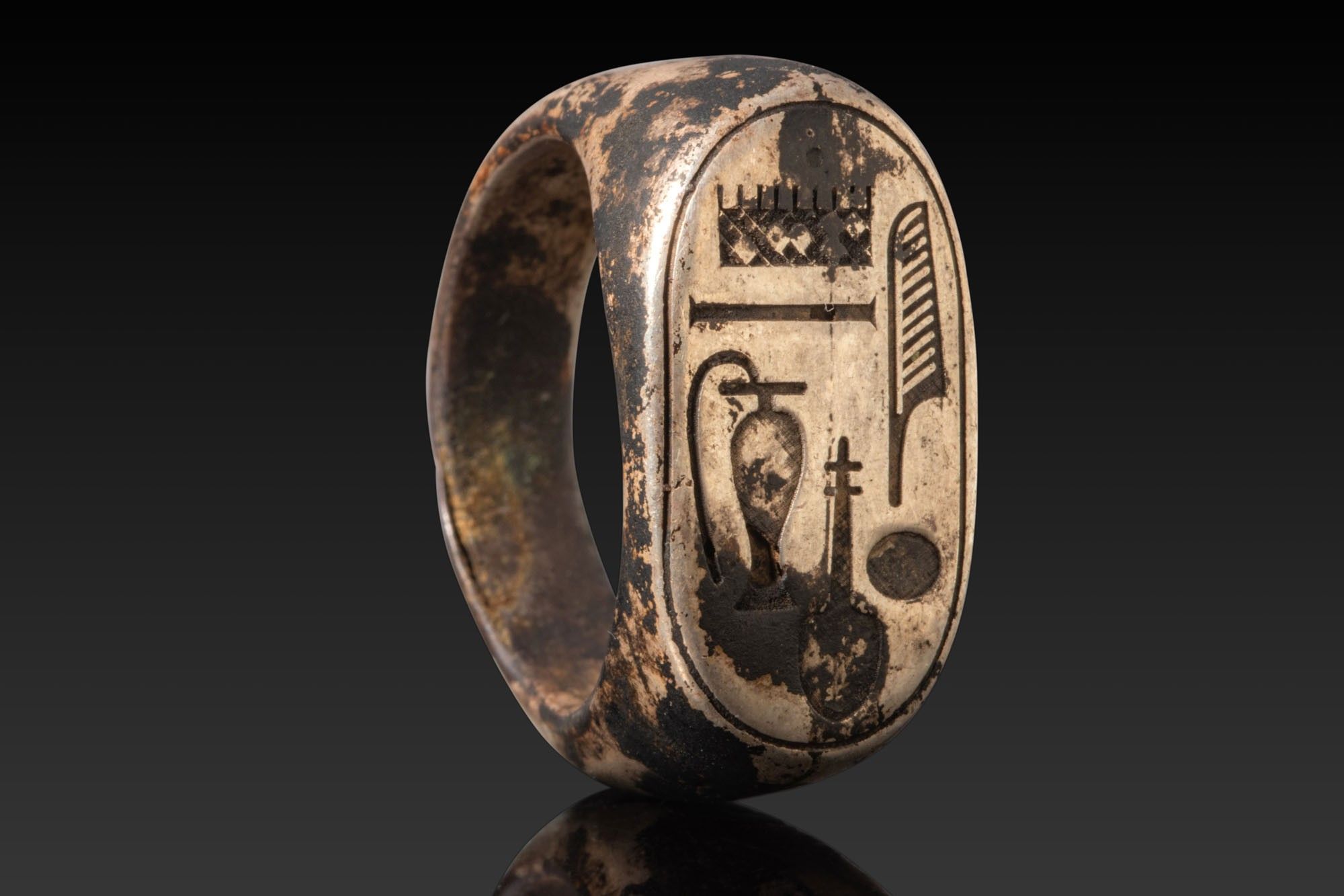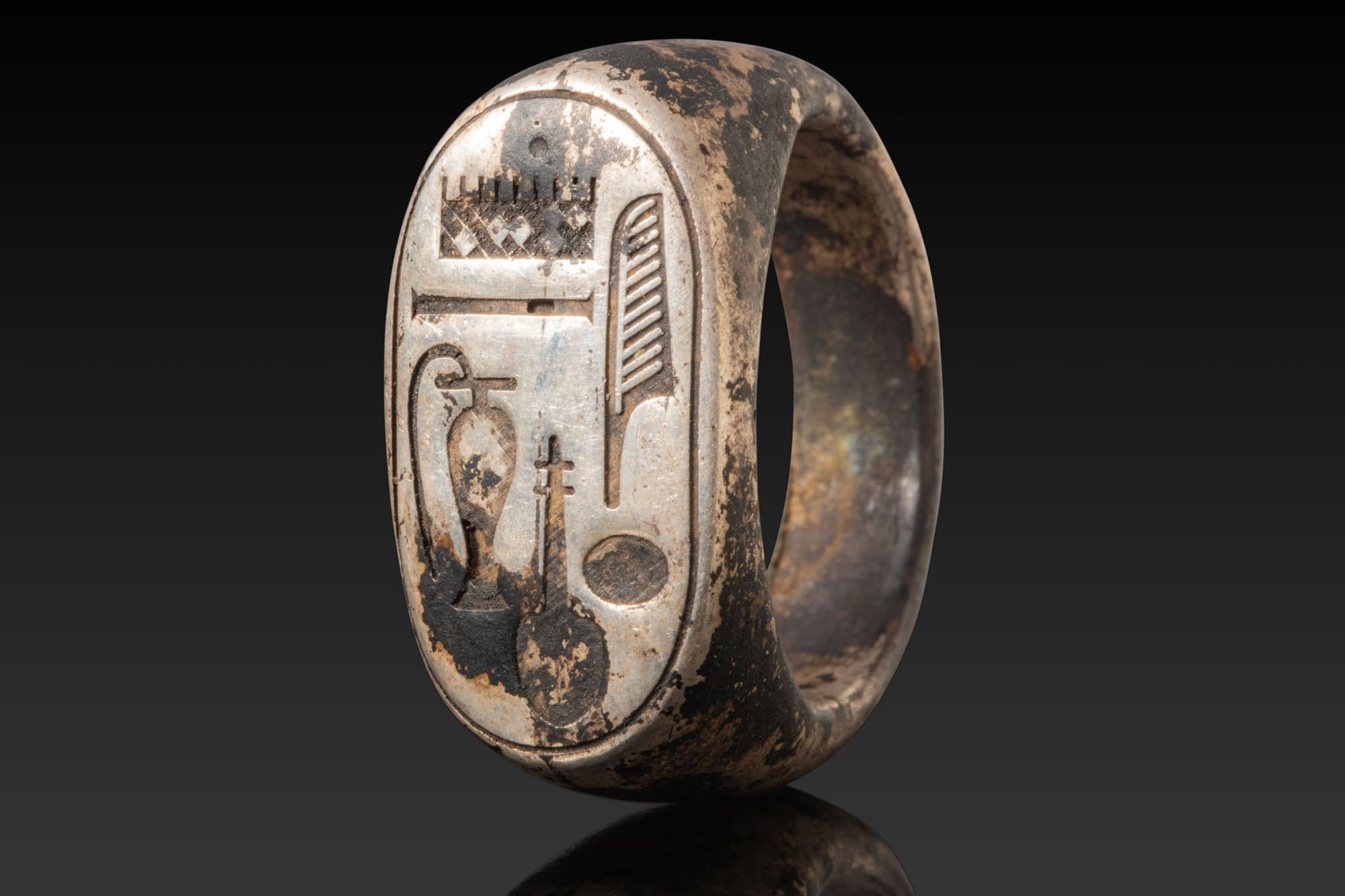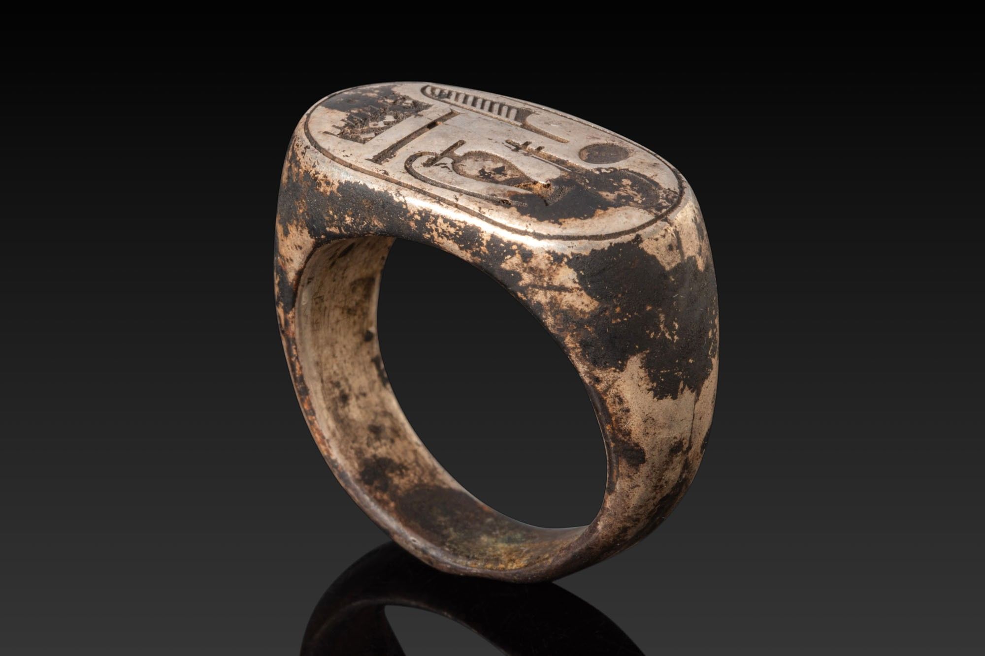 Premium EGYPTIAN SILVER STIRRUP RING WITH CARTOUCHE. New Kingdom, Ca…