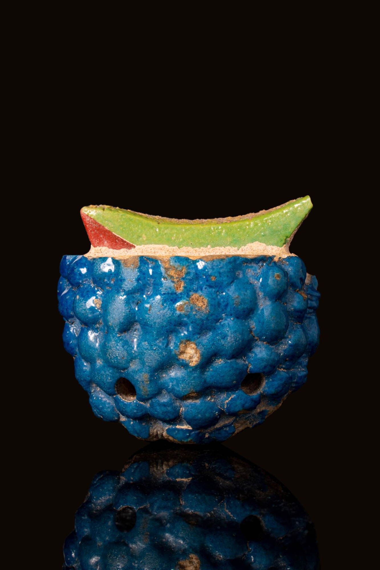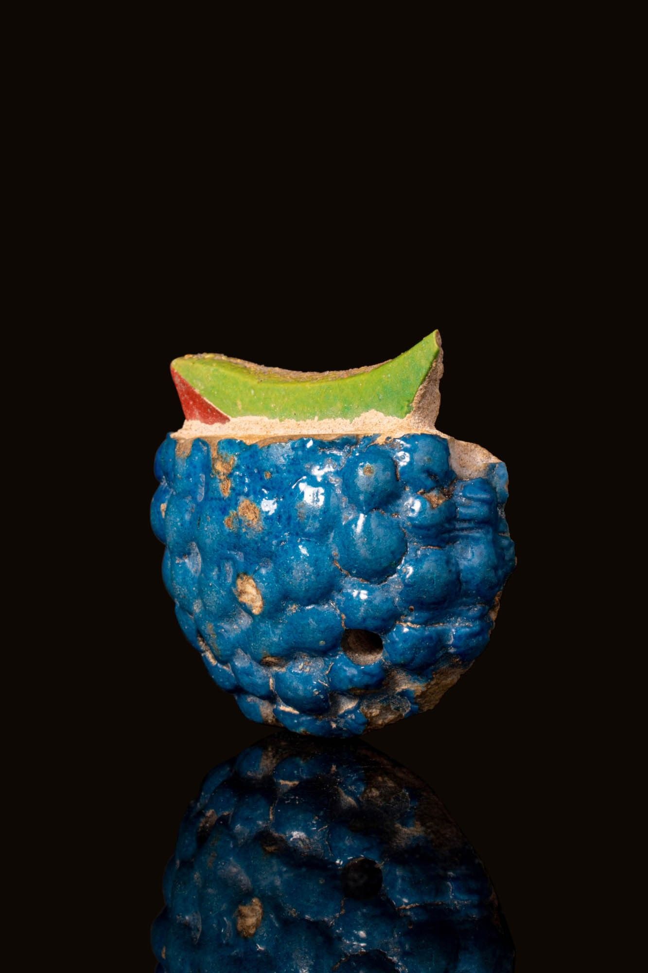 Ca. 1356 - 1336 BC. A blue faience grape cluster. It has a sapphire-blue colour and would have been used for decoration. The grapes are depicted under a horizontal bar, surmounted by more coloured parts. For similar see: The Metropolitan Museum of Art, Accession Number 07.230.34. Size: 45mm x 50mm; Weight: 41g Provenance: Prince collection, 1990s-2014; Ex. E. Strobel private collection. This item has been cleared against the Art Loss Register database and comes with a confirmation letter.