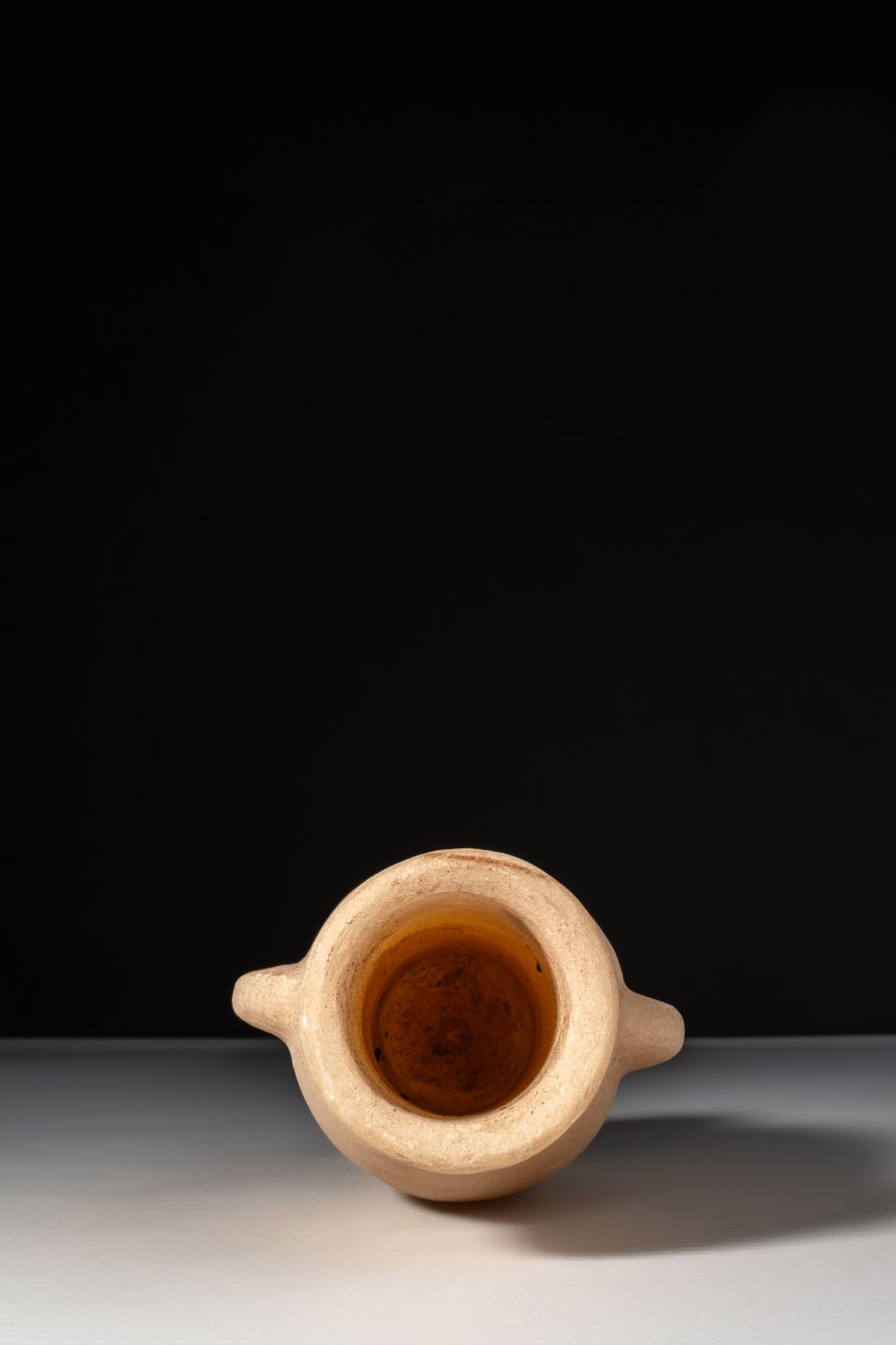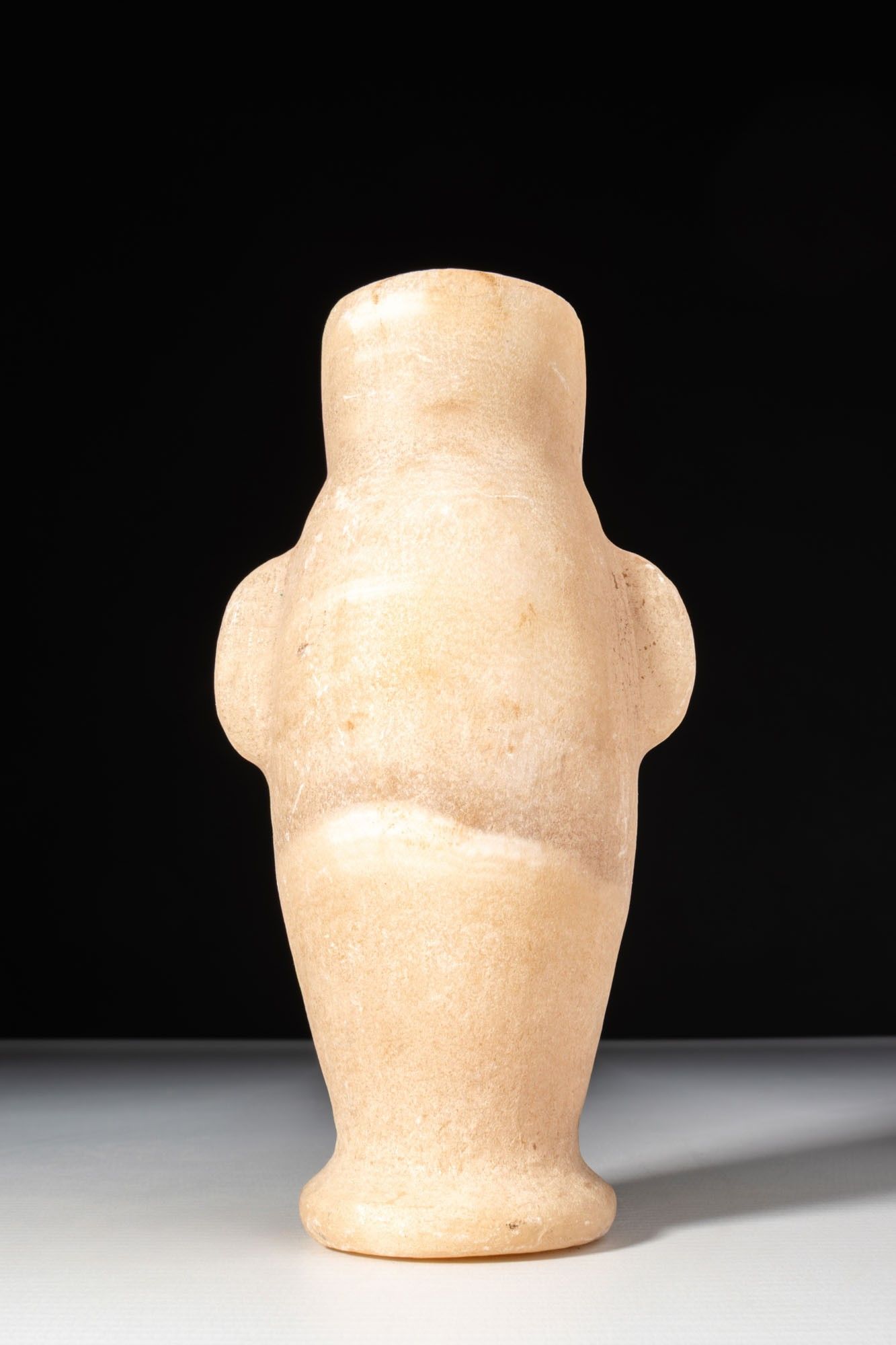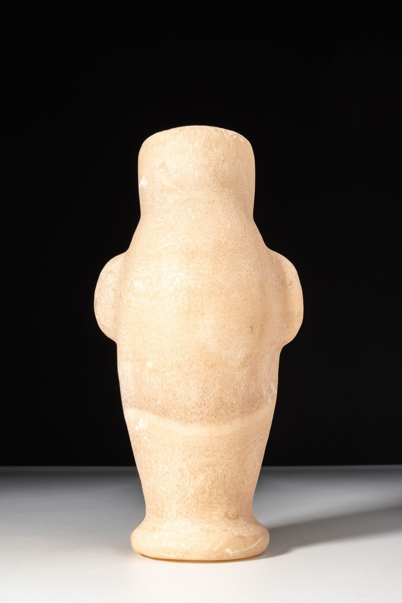 An alabaster vessel with a short, straight neck and plain, rounded rim. The ovoid body is formed with a pair of opposed, rounded lug-projections at the shoulder and set on a low, splayed foot.