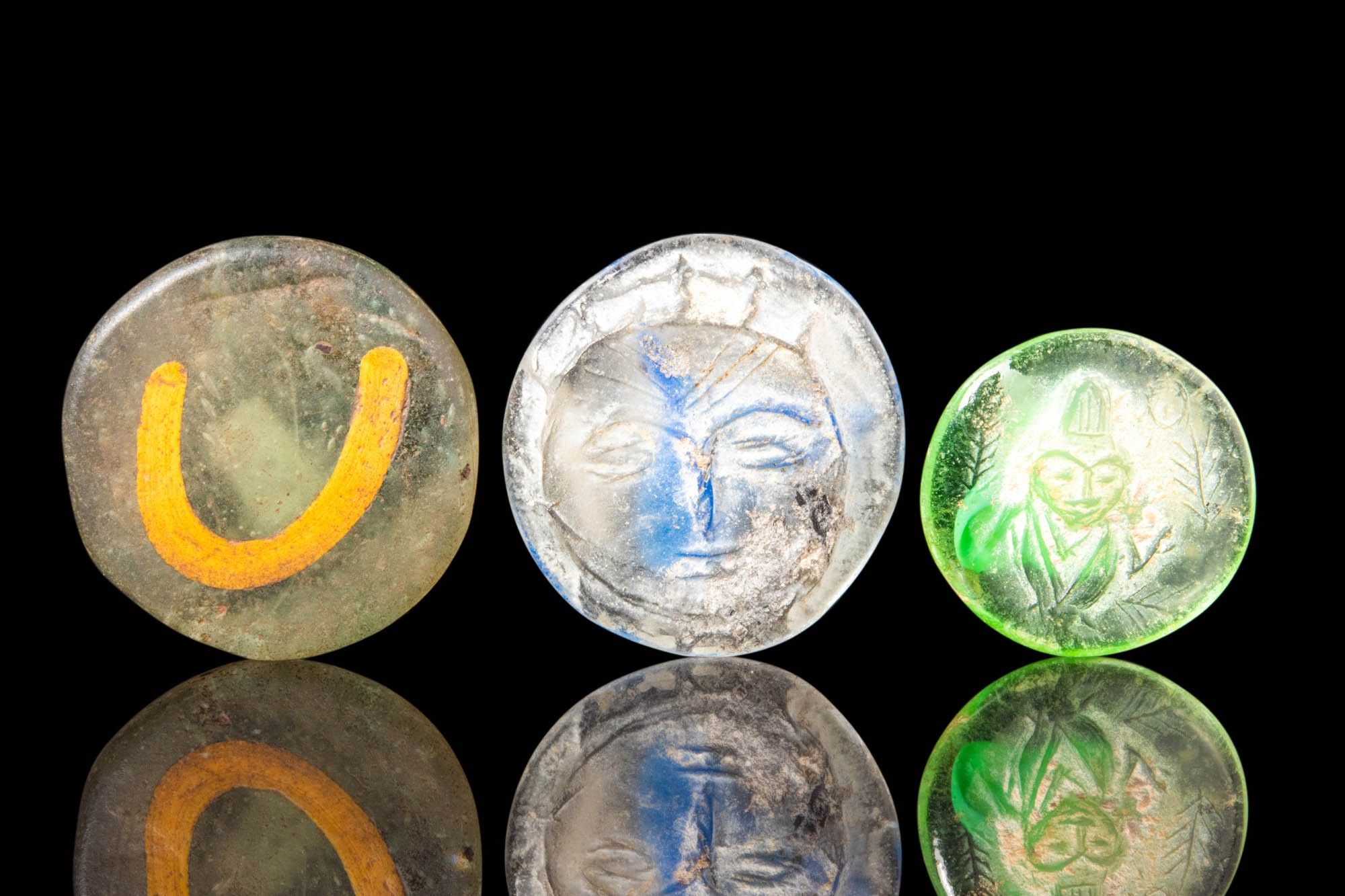 Ca. 30 BC - AD 200. A set of rare Romano-Egyptian glass stamped disc amulets. The first shows a U-shaped sign in gold; the second depicts a frontal face of a man with a hood; the third shows a bust of a man in a long robe with a high cap between two trees. Size: 22.2-28.1mm x 22.3-26.8mm; Weight: 16.97g Provenance: Prince collection, 1990s-2014; Ex. Private collection 1970s-1990s.
