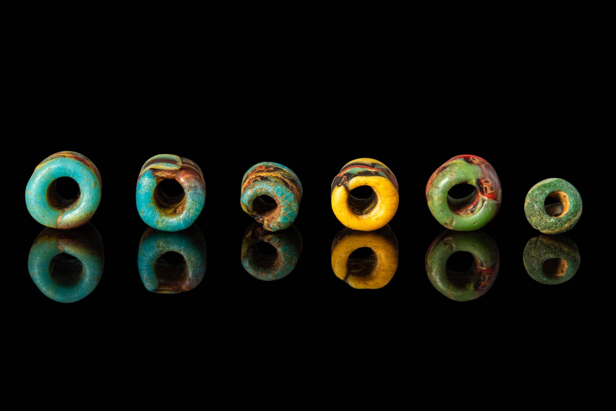 Ca. 30 BC - AD 200. A set composed of four tubular rod-formed beads in shades of pale blue and yellow, each bearing a central band with motifs of vine tendrils with leaves alternating with trefoil-shaped grape clusters. The set also includes two flattened spherical beads, one matching the vine motif of the tubular beads, while the other is embellished with white trailing. Size: 8.3-3.3mm x 5.4-7.0mm; Weight: 4.96g Provenance: Prince collection, 1990s-2014; Ex. Private collection 1970s-1990s.