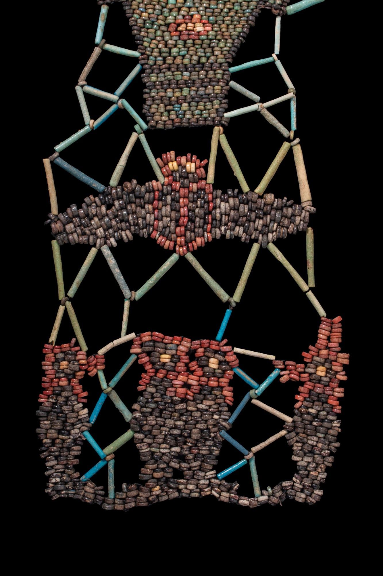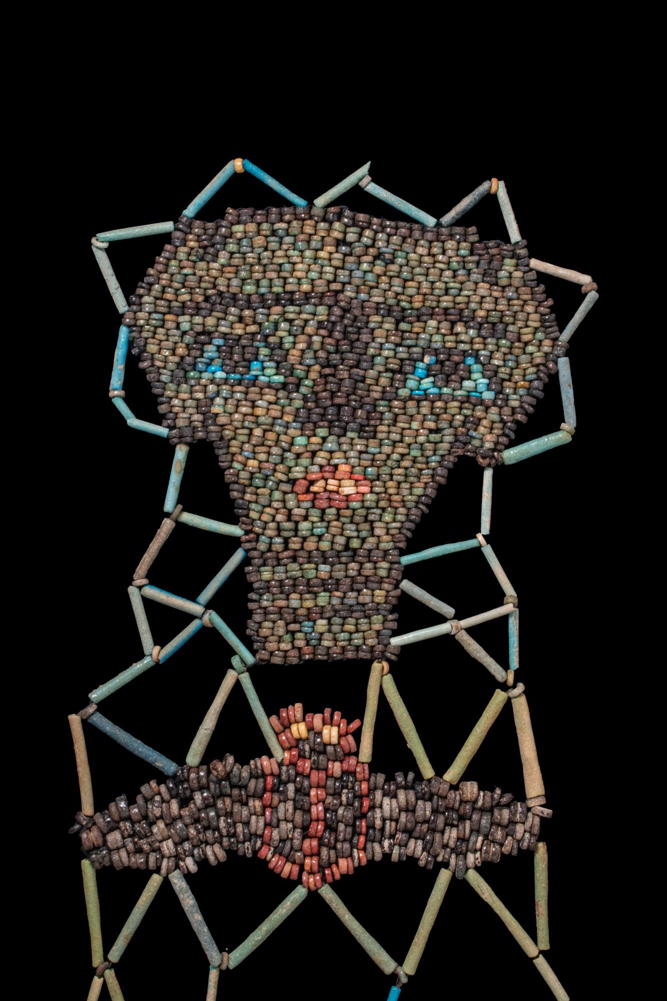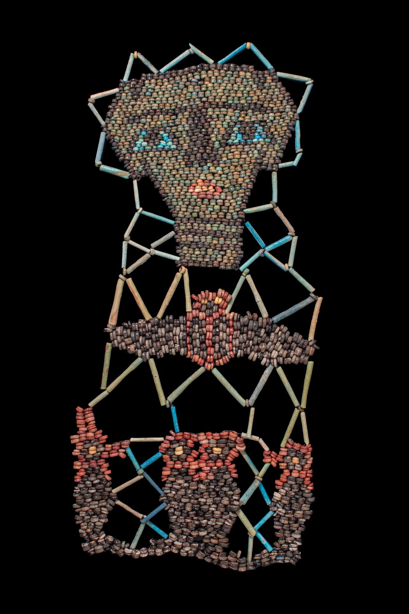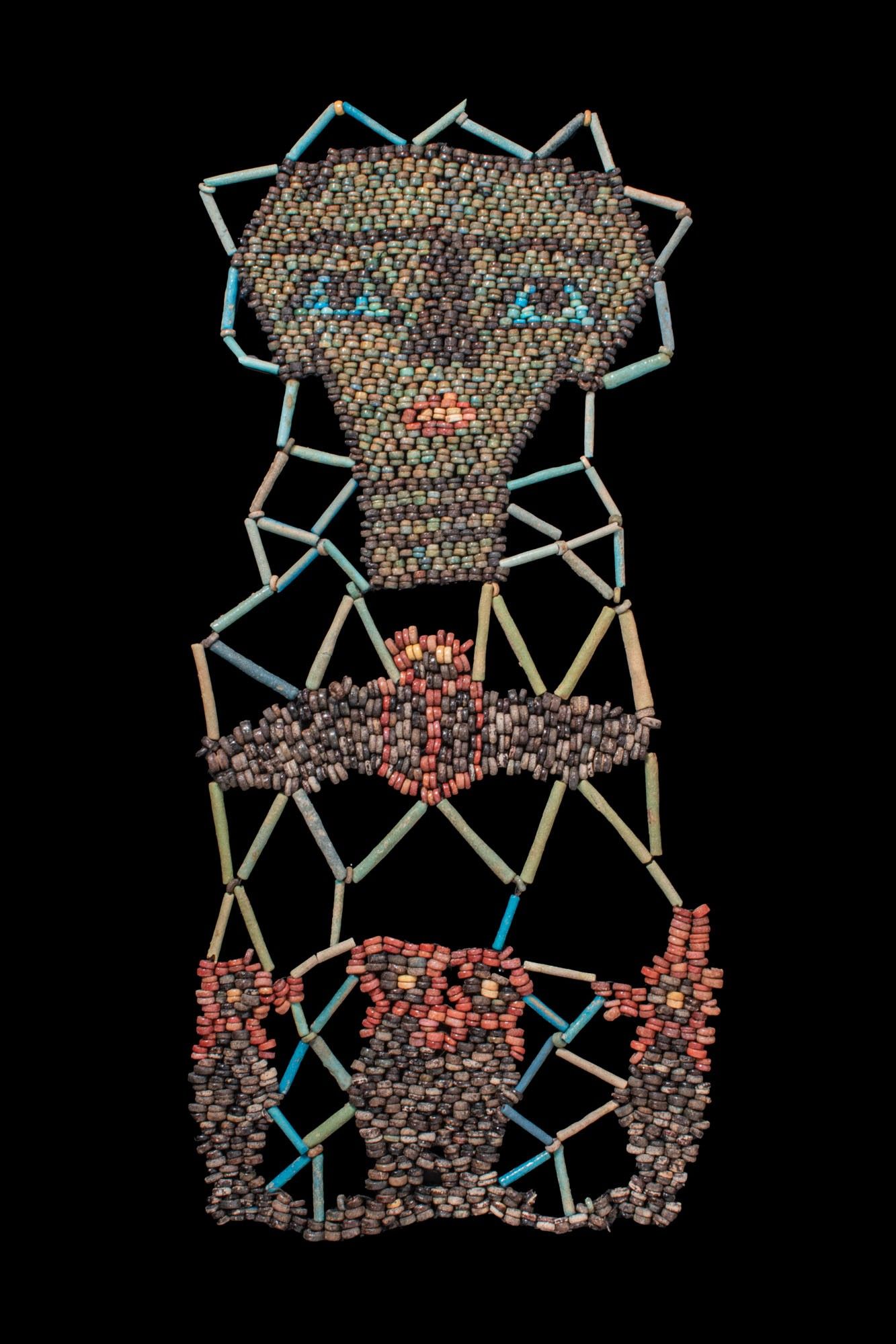 A faience shroud restrung from tubular and discoid beads. The lattice pattern frames three polychrome panels: at the top a mask with large eyes; below a winged scarab; and at the base the Four Sons of Horus: Imsety, Hapy, Duamutef and Qebehsenuef, shown as mummiform figures.