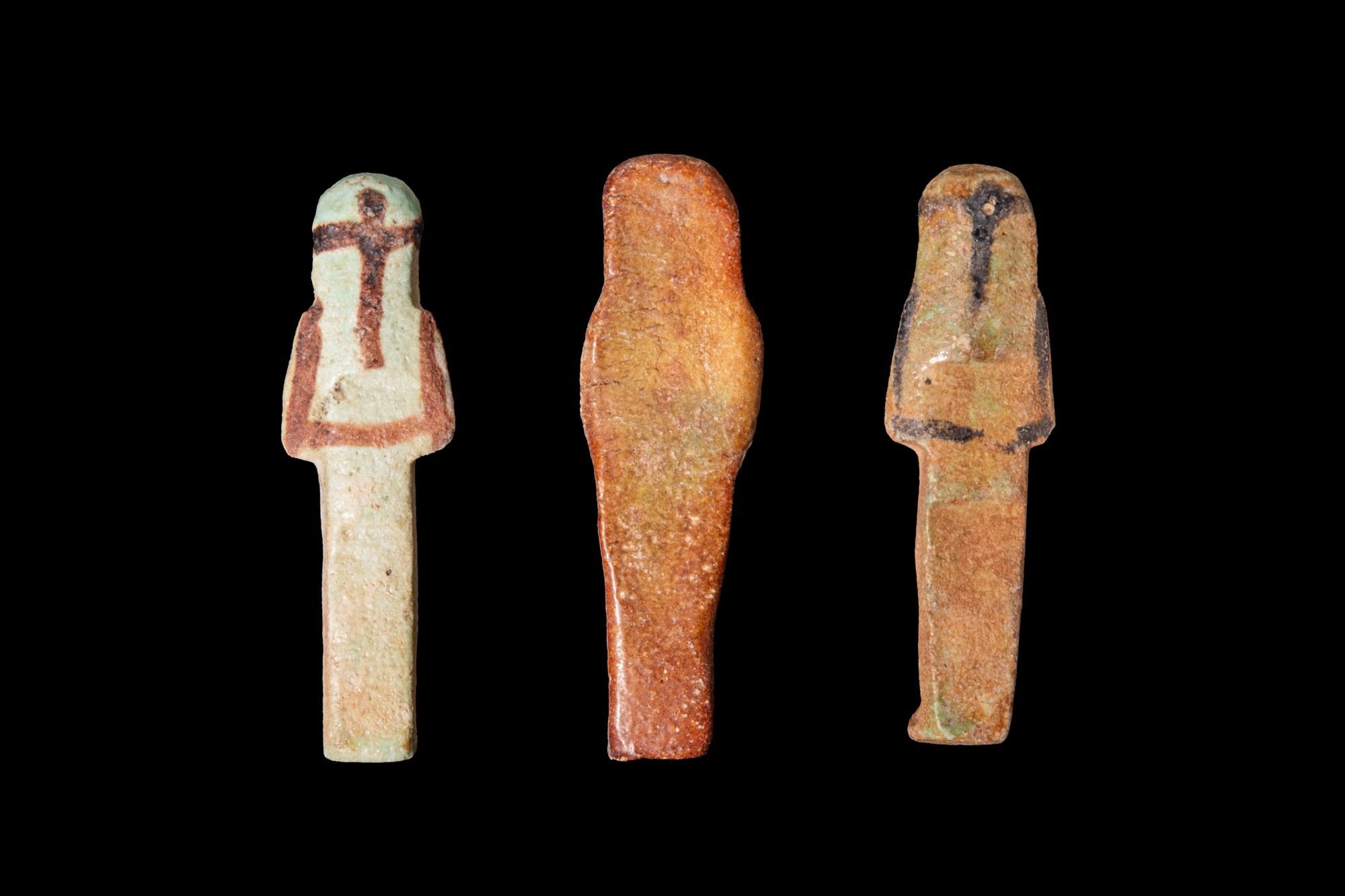 A collection of three faience ushabtis, the outer two with painted headbands, small faces, and dark strokes highlighting agricultural implements held in crossed forearms, the reverses showing painted seed bags; the central figure with a projecting false beard, hands crossed on the chest above a long tapering body, the back plain.