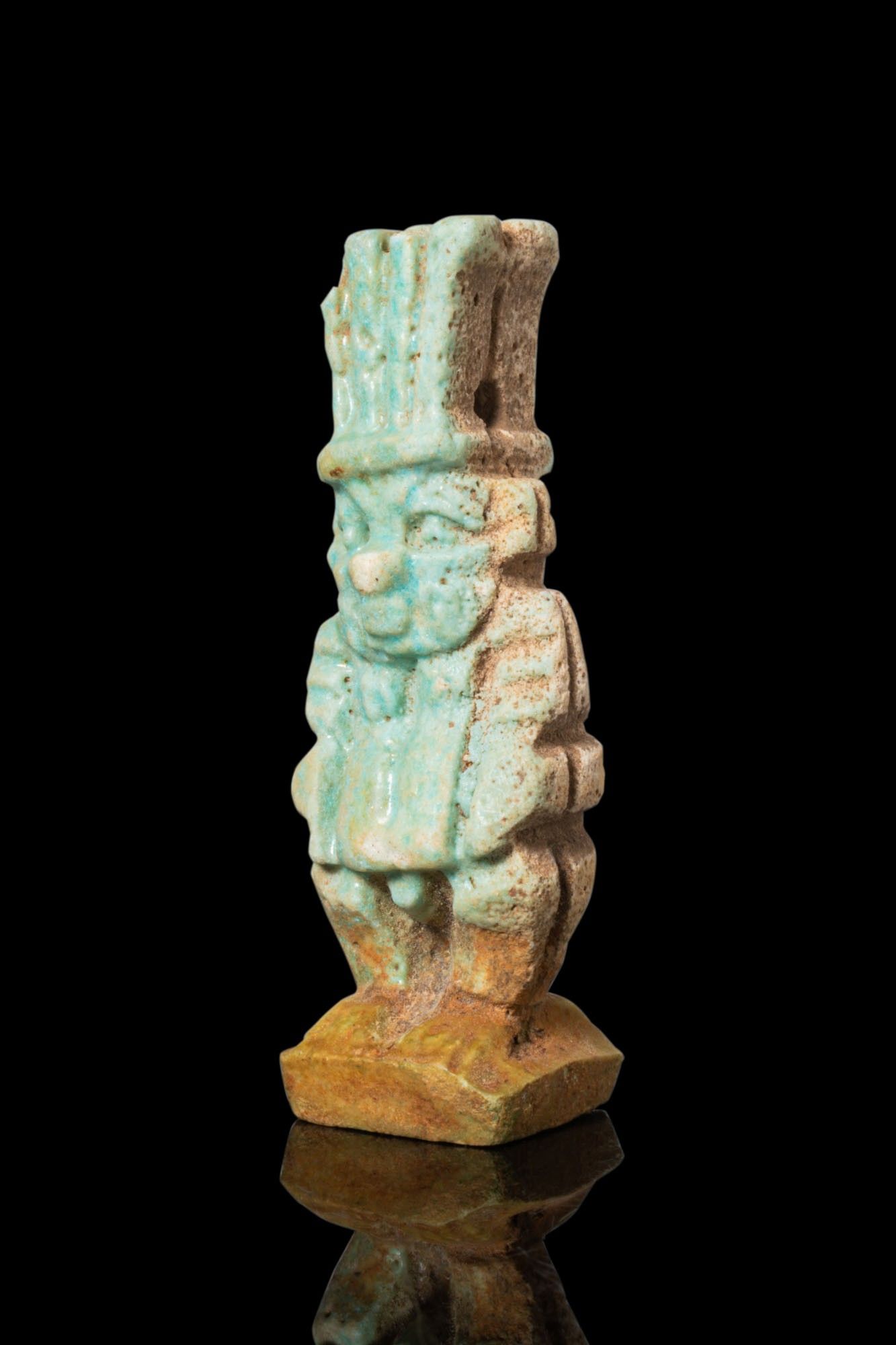 A faience amulet of the dwarf-god Bes, modelled on both faces. The compact figure stands on an integral rectangular plinth with a rounded face, a rectangular torso with the arms held tight to the sides, short legs, and a tall feathered headdress. A lateral perforation pierces the crown for suspension.
