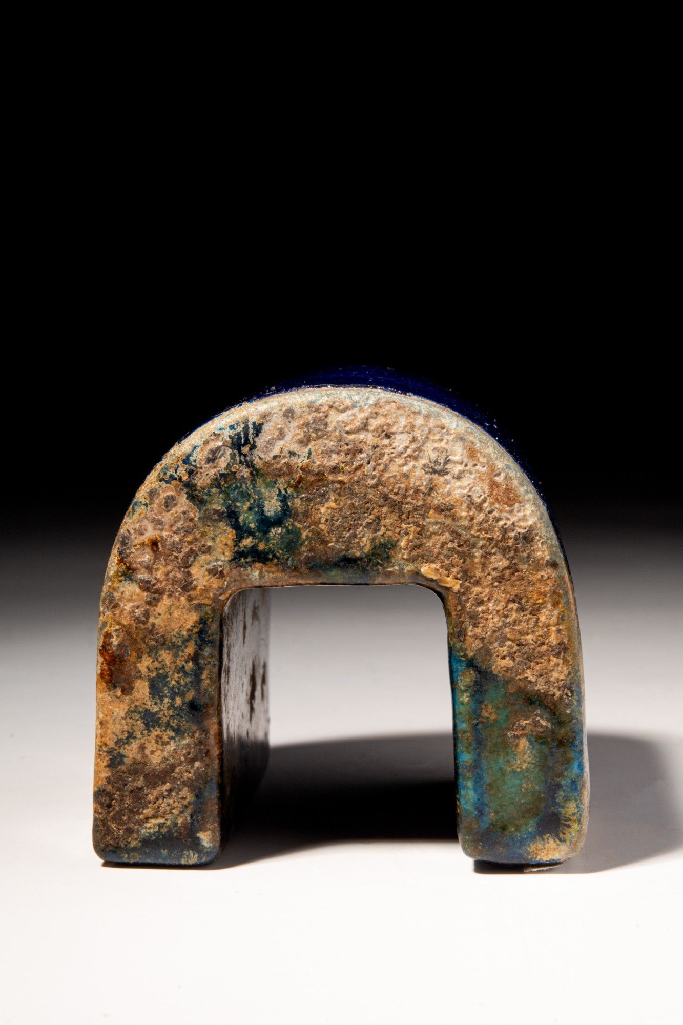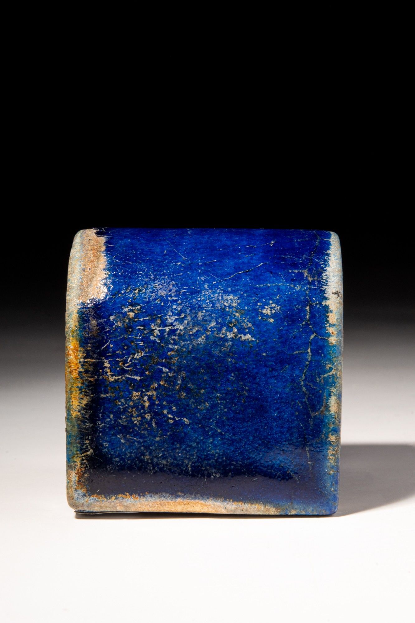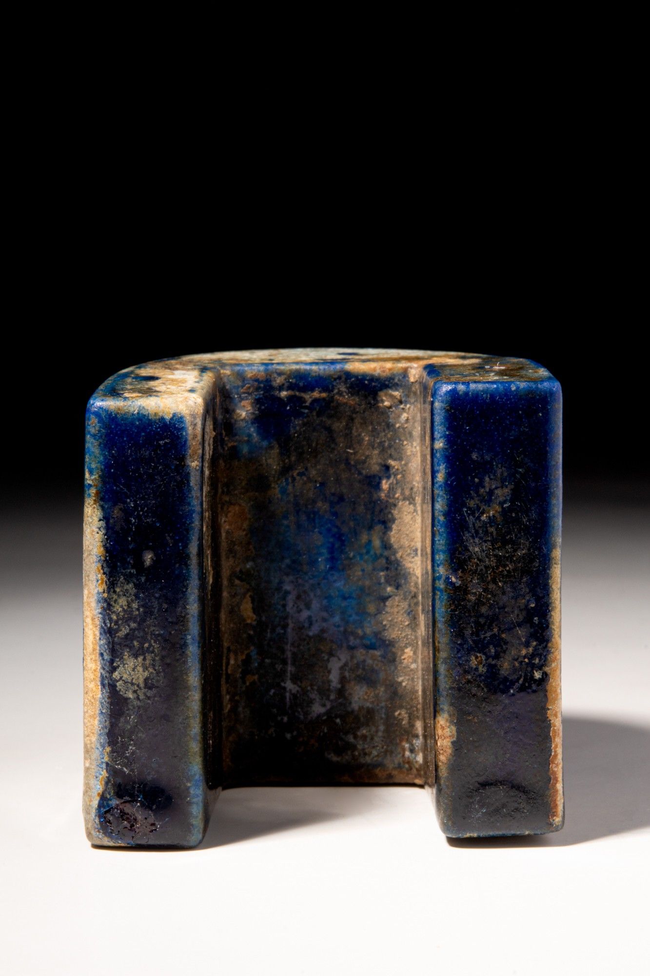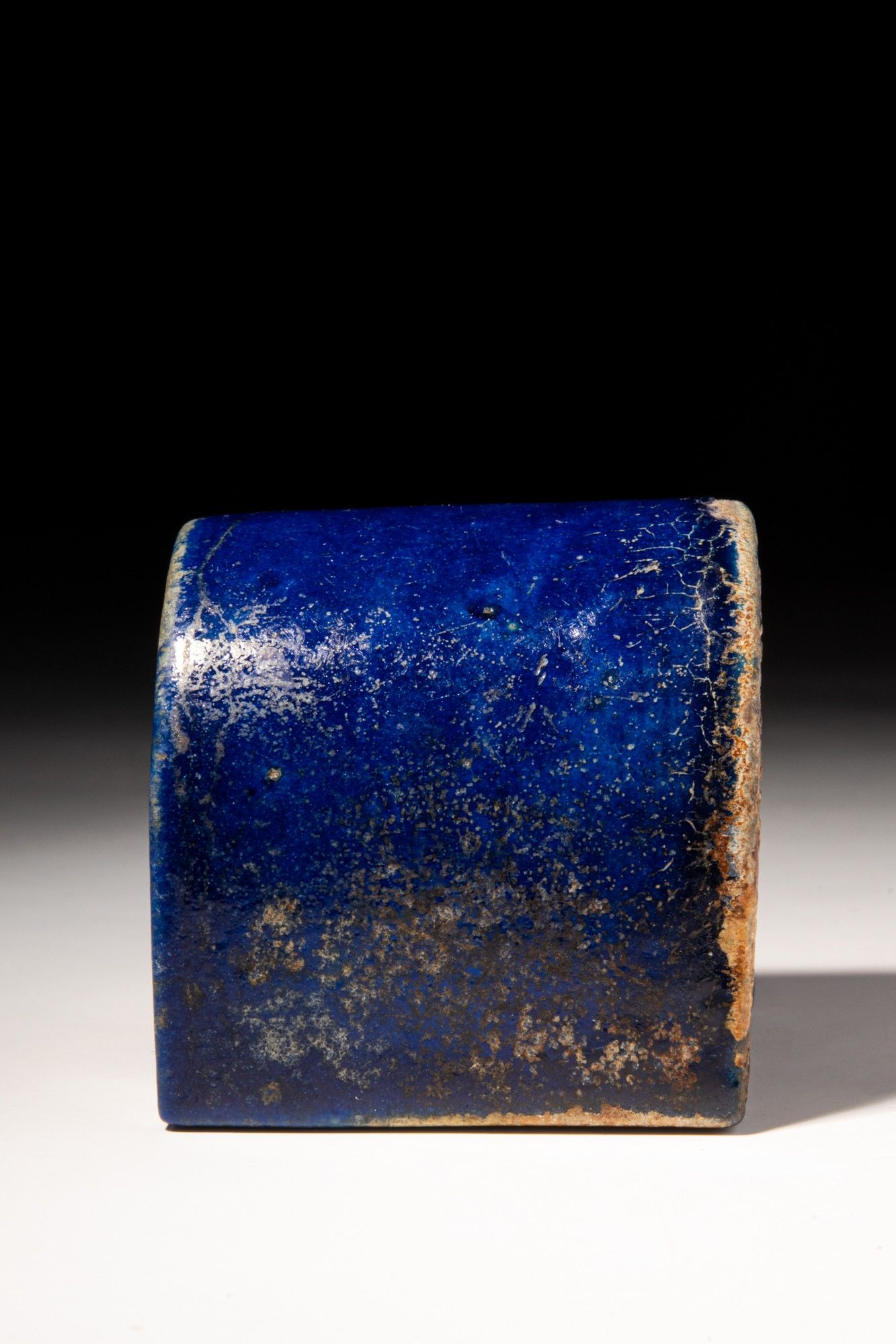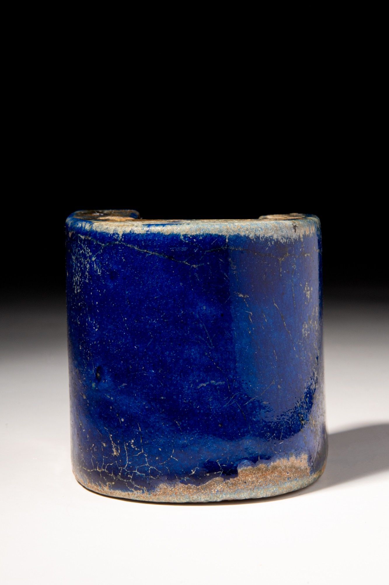 New Kingdom, Ca. 1550 - 1070 BC. An inlay displaying a vibrant cobalt blue glaze. The inlay features a cylindrical shape with smooth, tall walls which slope into concave sides. This form of inlay was possibly part of a tomb or building complex. Size: 35mm x 35mm; Weight: 65g Provenance: Prince collection, 1990s-2014; Ex. Private collection 1970s-1990s.