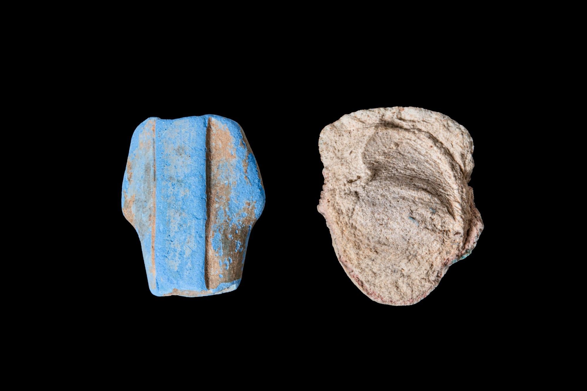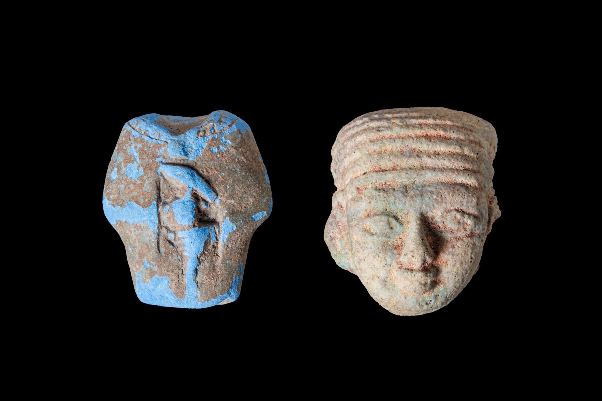 A pair of faience figural elements, including, from left to right: a vivid blue fragment with a relief of a standing deity preserved at the midsection, holding a was-sceptre in both hands; and a small figurine head with a broad, horizontally ribbed headdress, almond-shaped eyes, a straight nose and small lips, the face oval with softly modelled cheeks.