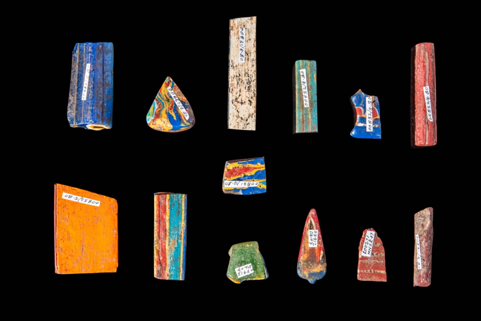 Ca. 30 BC - AD 200. A set of 13 mosaic glass canes, inlays of revetment tiles with a mix of shapes, sizes, and designs, including polychrome and striped patterns. These canes were intended to be fused into larger mosaic compositions. For similar see: The Corning Glass Museum, Accession Number 58.1.29. Size: 14.7-40mm x 7.8-9.7mm; Weight: 42.55g Provenance: Prince collection, 1990s-2014; Ex. Private collection 1970s-1990s.