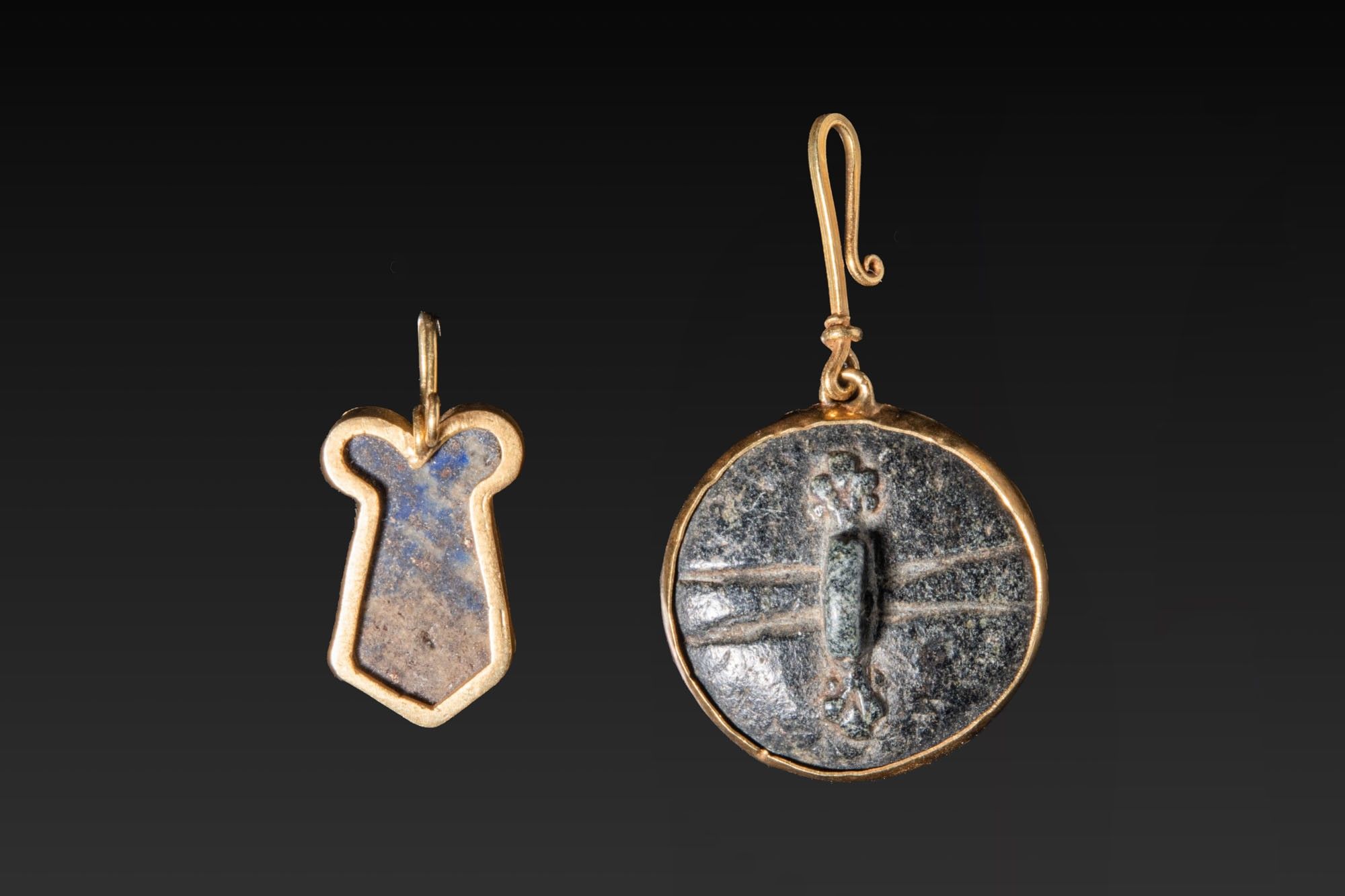 A pair of amulets mounted in modern gold settings, including, from left to right: an Egyptian lapis lazuli amulet in the form of a pair of ostrich feathers with a central cleft and pointed terminal; and a Mesopotamian stone disc with a rosette on one face and a small handle on the reverse.