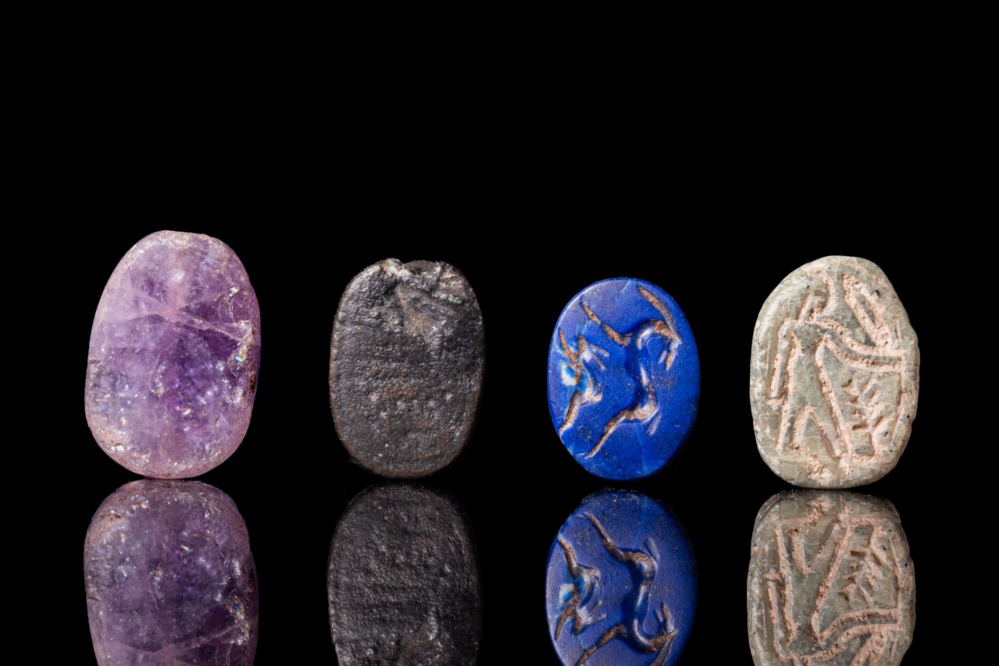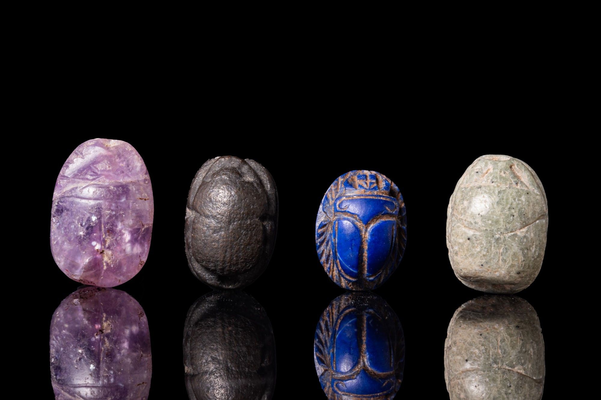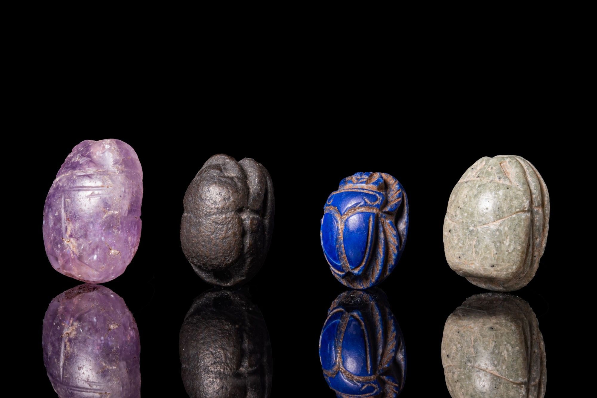 A collection of four stone scarabs, including, from left to right: an amethyst scarab with a smooth lenticular body and a flat, undecorated base; a dark stone scarab with a domed back, marked pronotum and segmented wing cases, the base left plain; a lapis lazuli scarab with incised head and thorax, the base engraved with running animals in profile; and a pale green stone scarab with segmented dorsum, the base engraved with a standing figure.