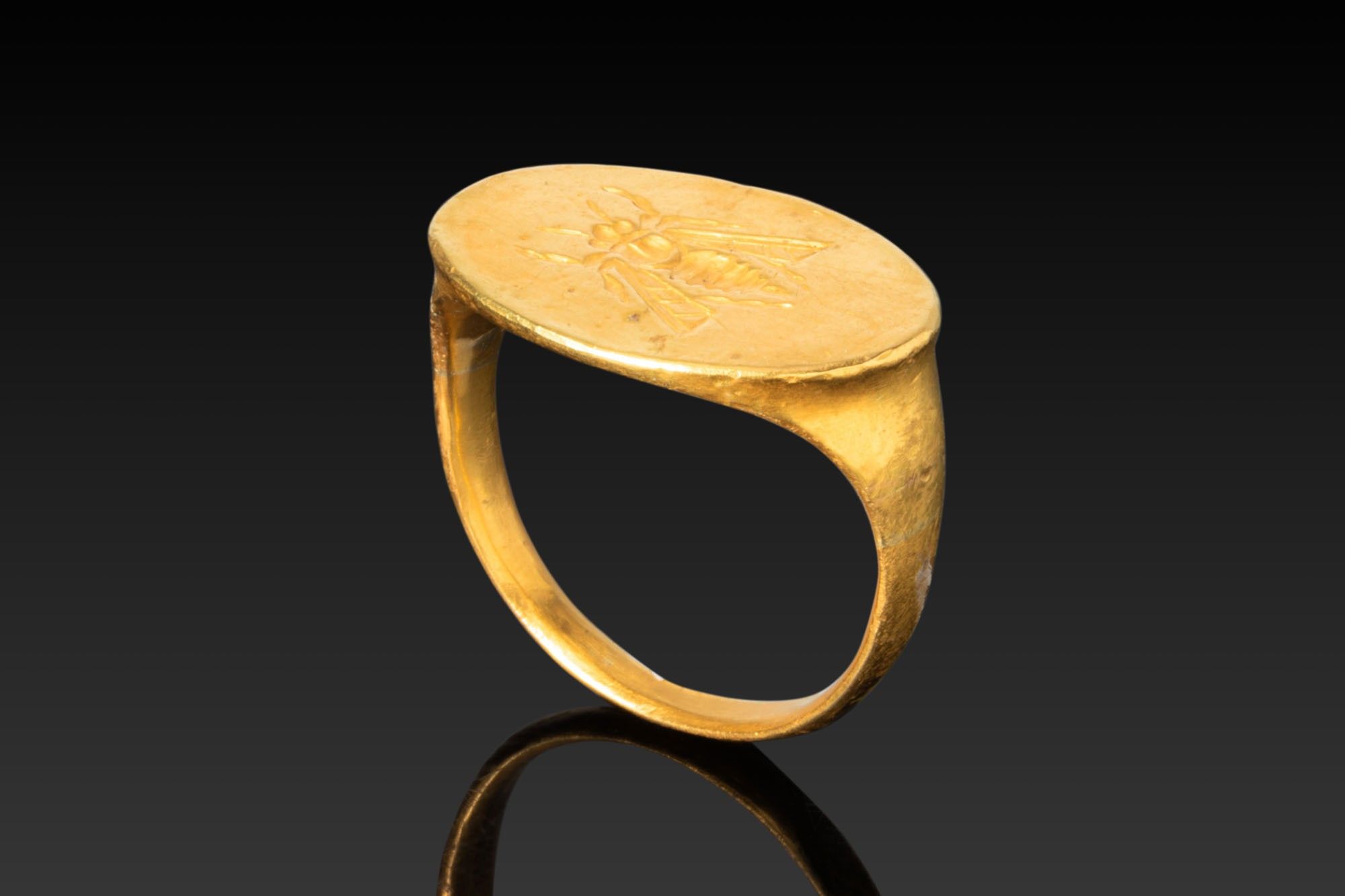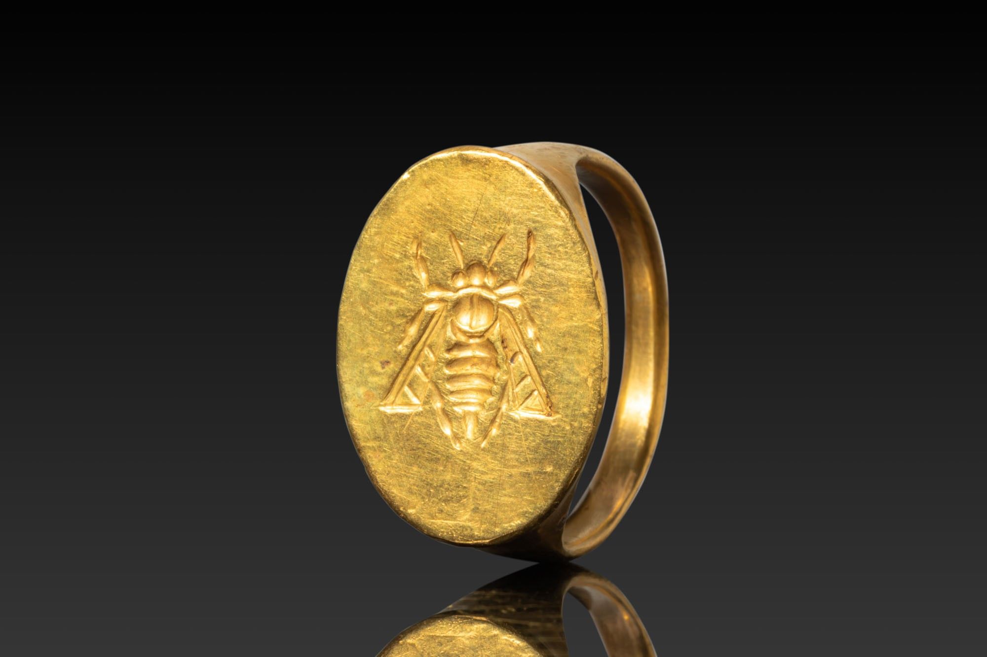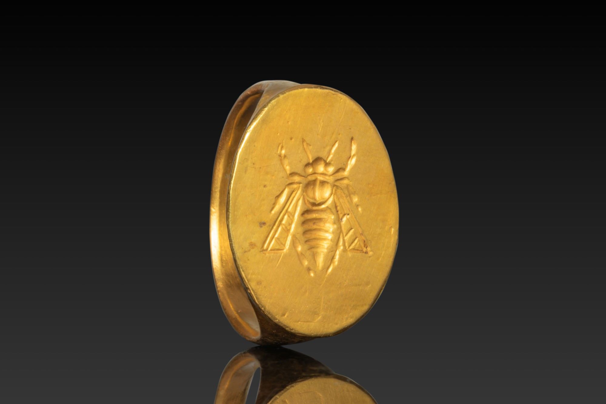 Premium LARGE GREEK SOLID GOLD RING WITH BEE. Ca. 500 - 300 BC. A so…