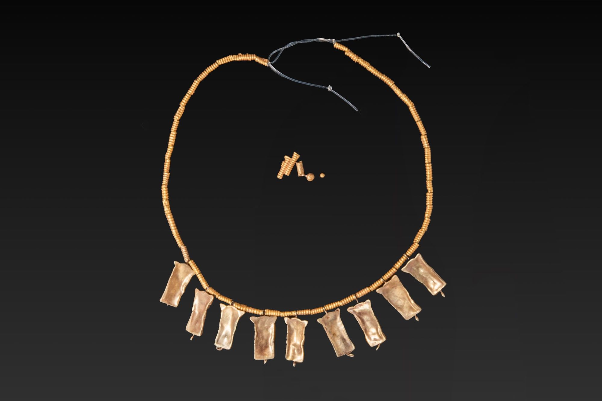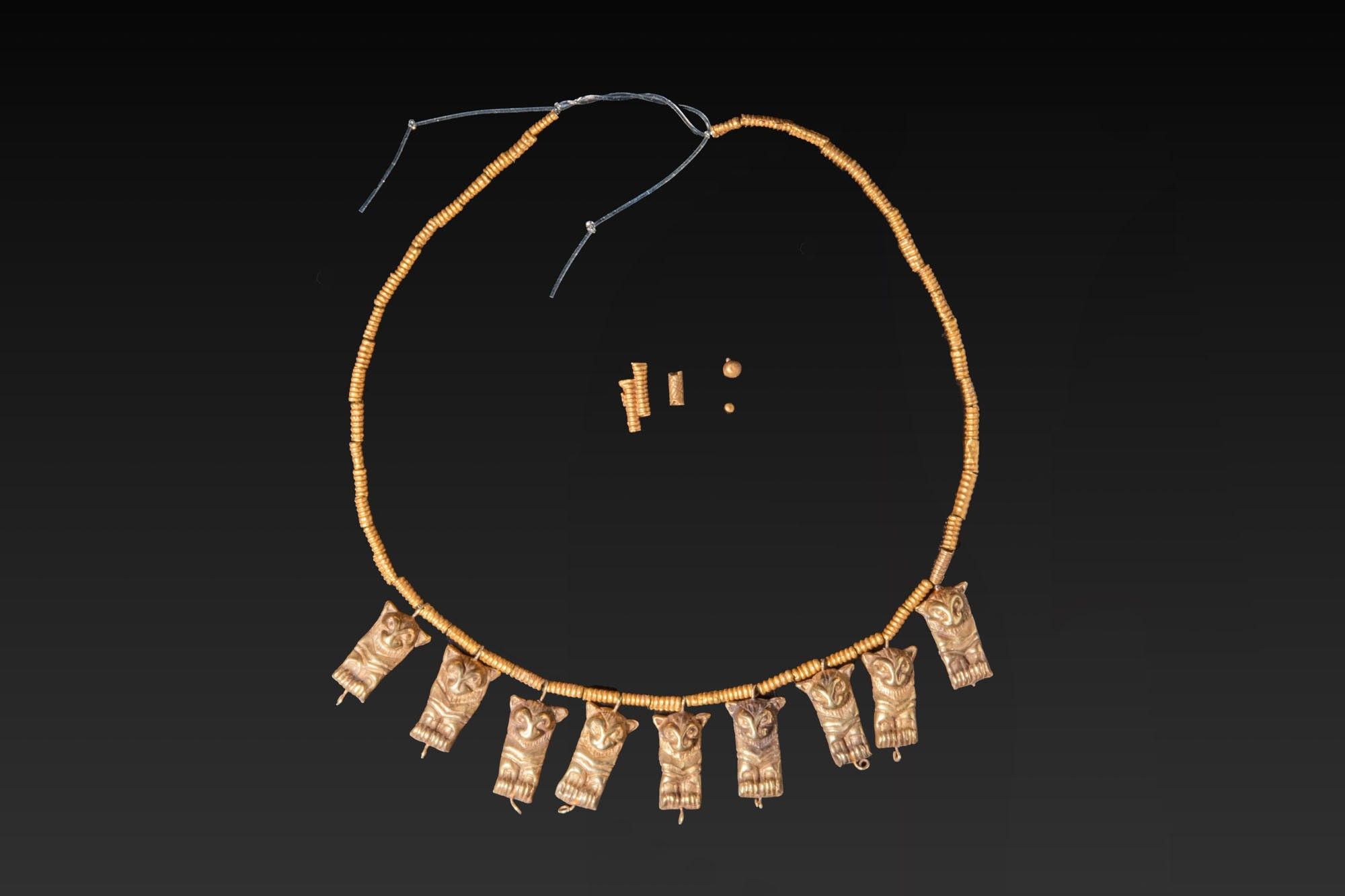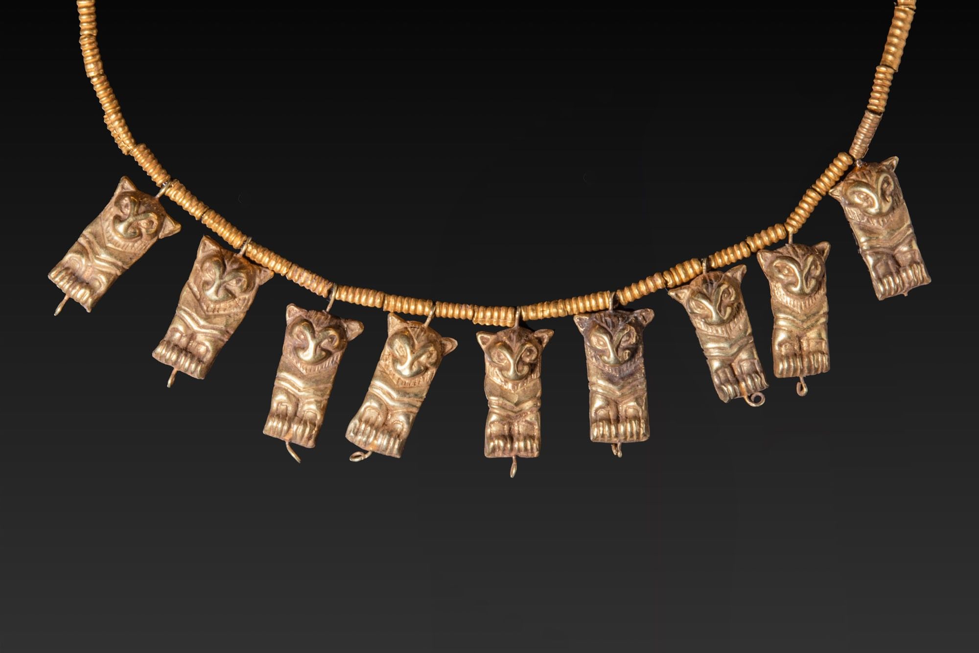 A gold necklace restrung with nine sheet-gold pendants in the form of lions shown frontally, each suspended from a collar of ribbed tubular beads. Each animal plaque is modelled in low relief with almond-shaped eyes, a short muzzle, a mane and indicated forepaws; a separate loop projects above the head and a small loop is set at the lower edge; the reverses are plain.
