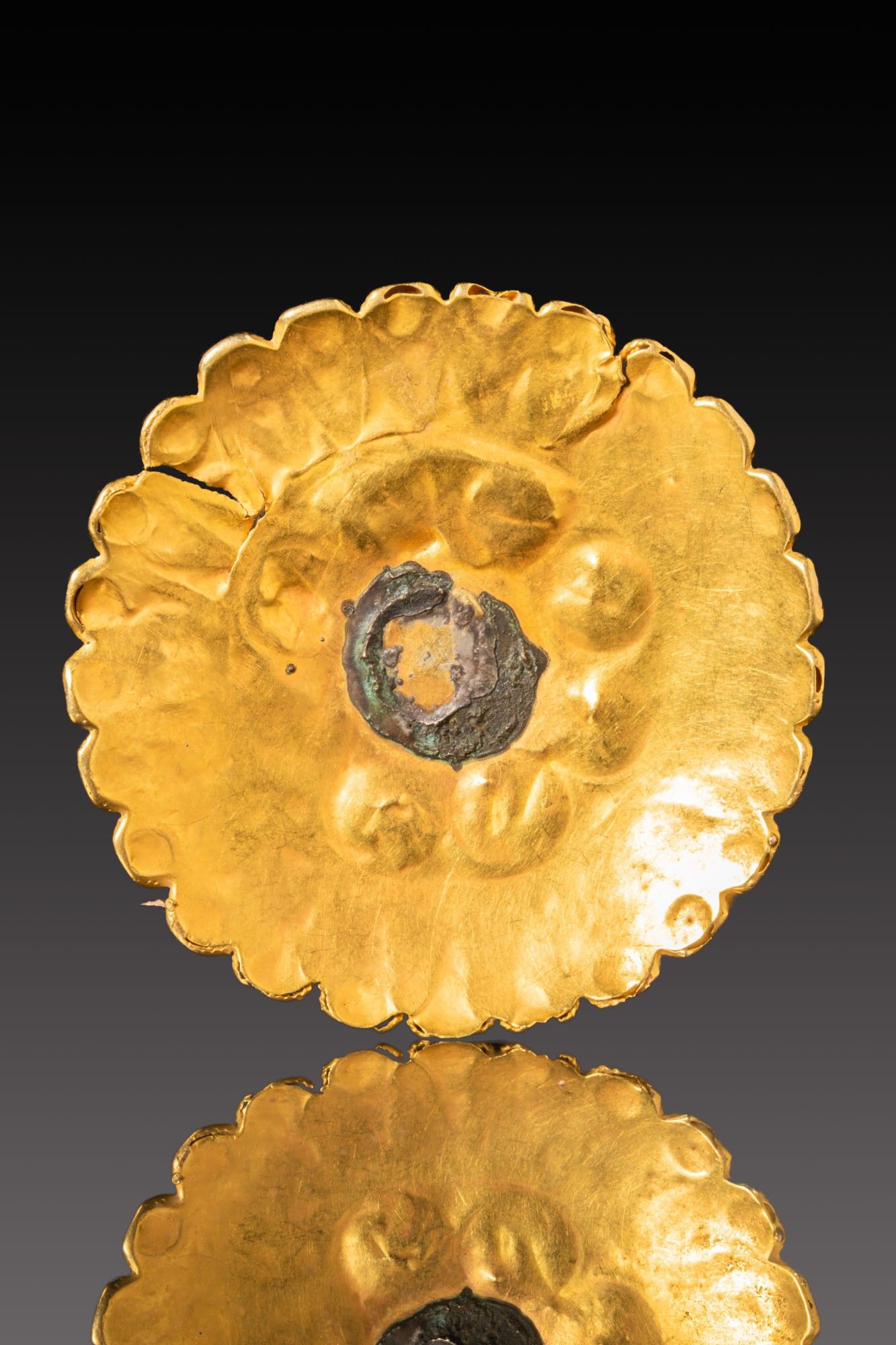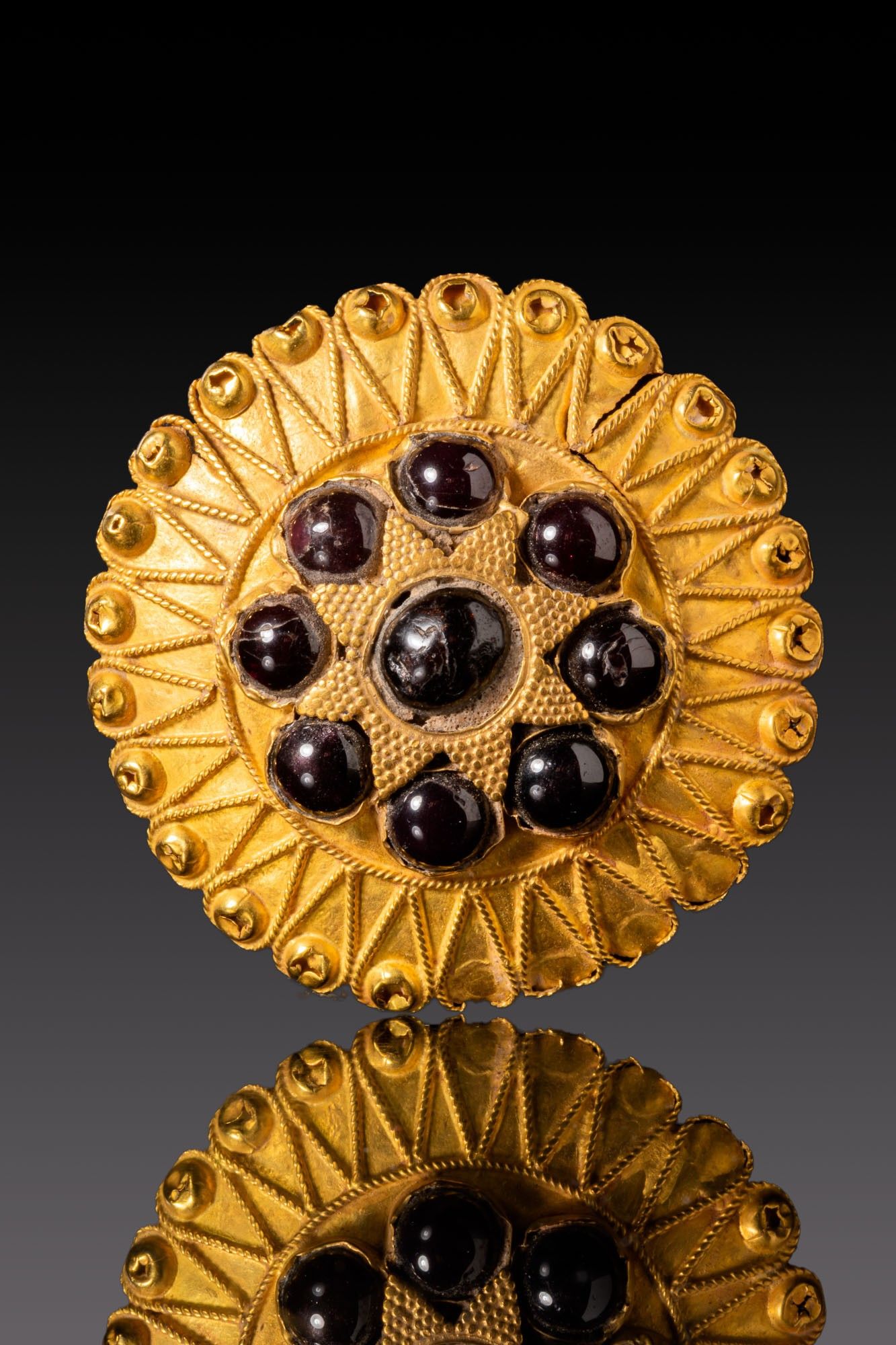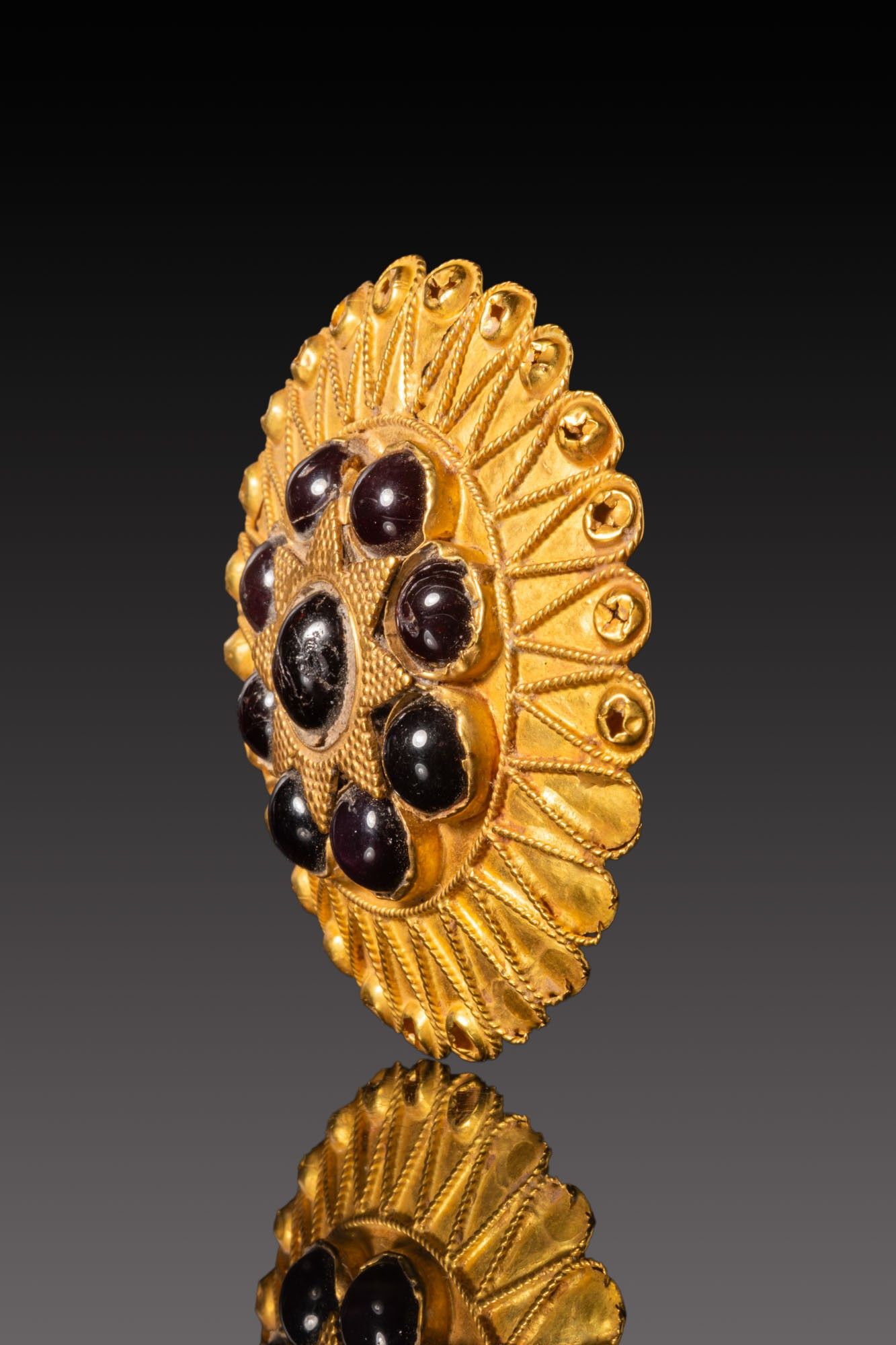 A gold appliqué centred by a rosette of cabochon garnets. The stones are set in circular cells around a larger central cabochon framed by a filigree star shape. A narrow beaded fillet encircles the composition, within a broad outer border of radiating petals edged with twisted wire. Each petal ends in a small domed boss.