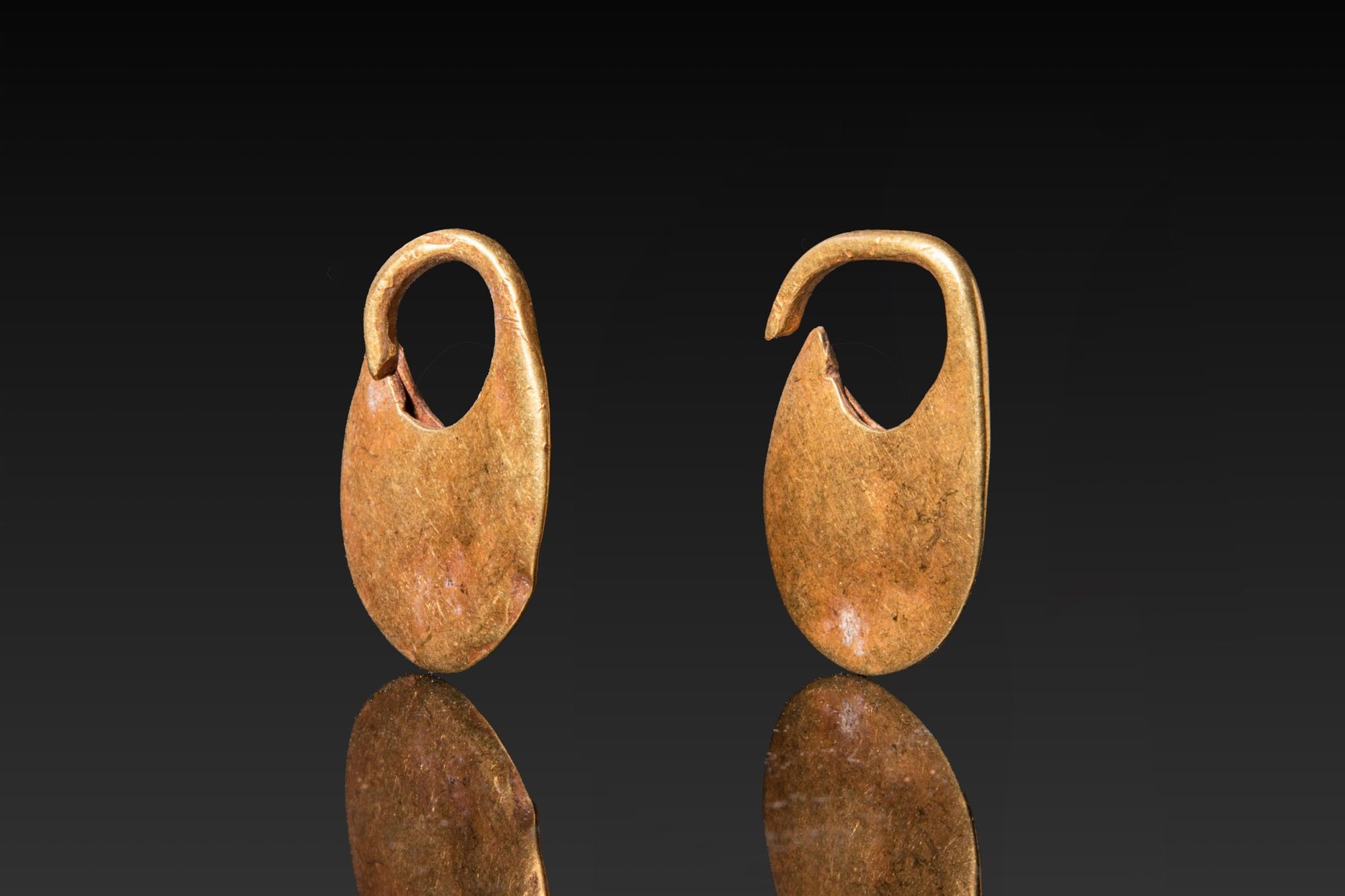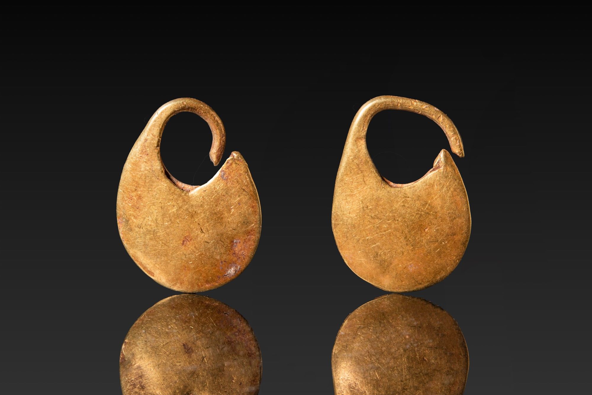 A matched pair of gold earrings, each made from a thin sheet as a rounded drop with an integral curved hook.