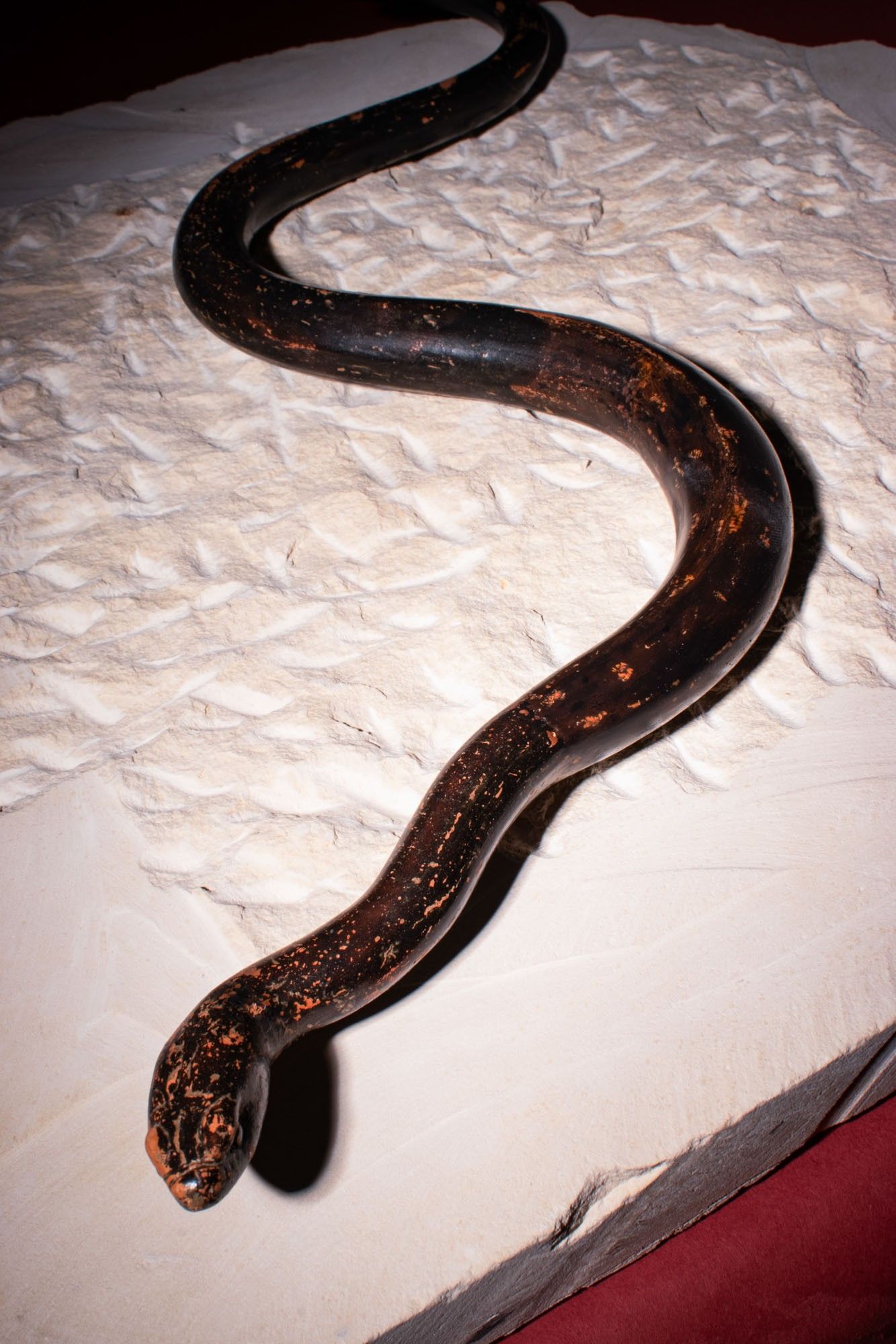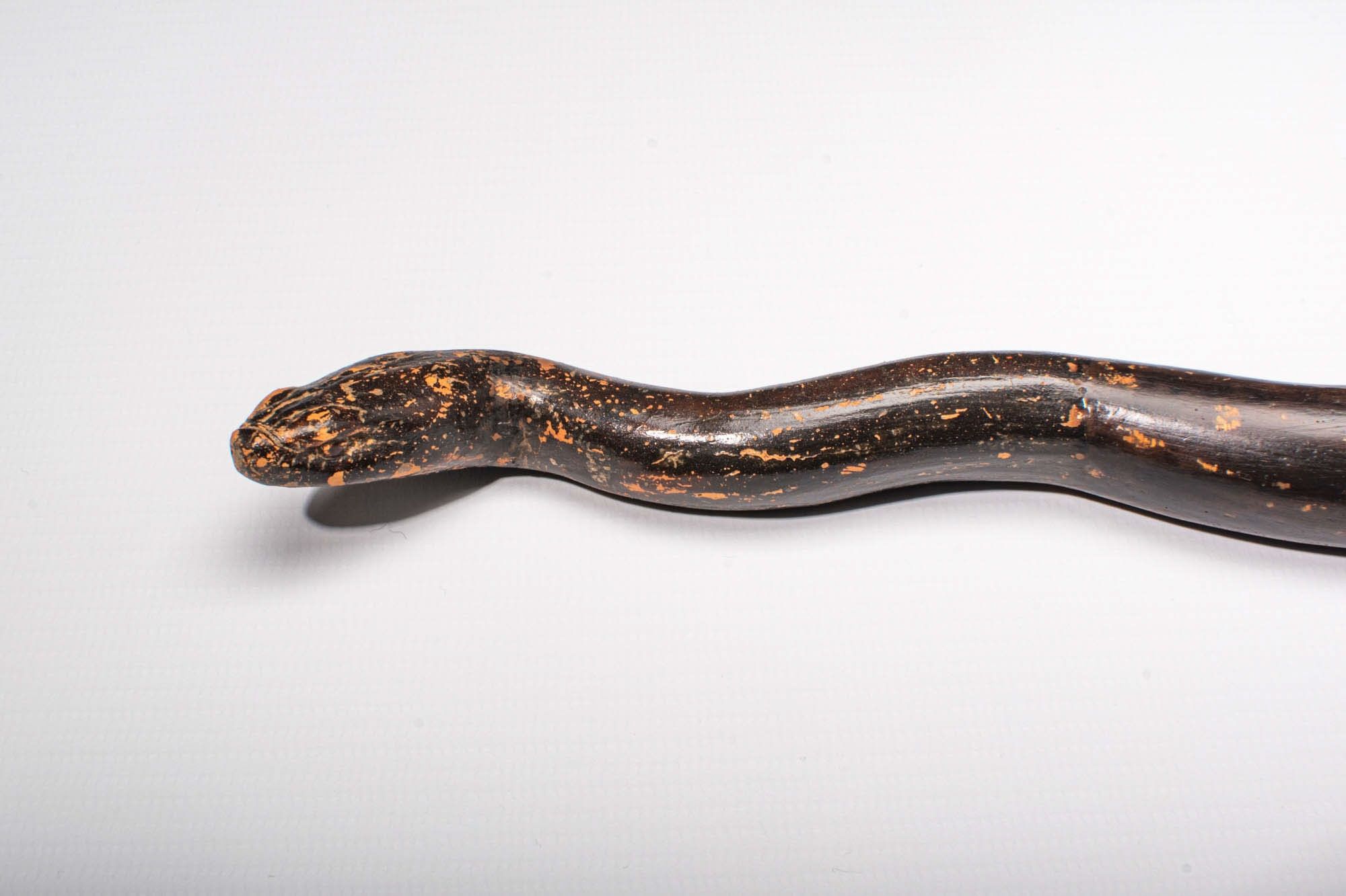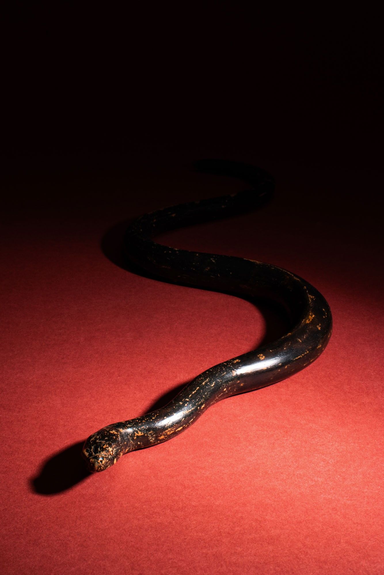 A black-glazed terracotta snake modelled with an elongated, sinuous body, thickest at mid-section and tapering to a pointed tail. The head is slightly raised with a short snout and indicated eyes.