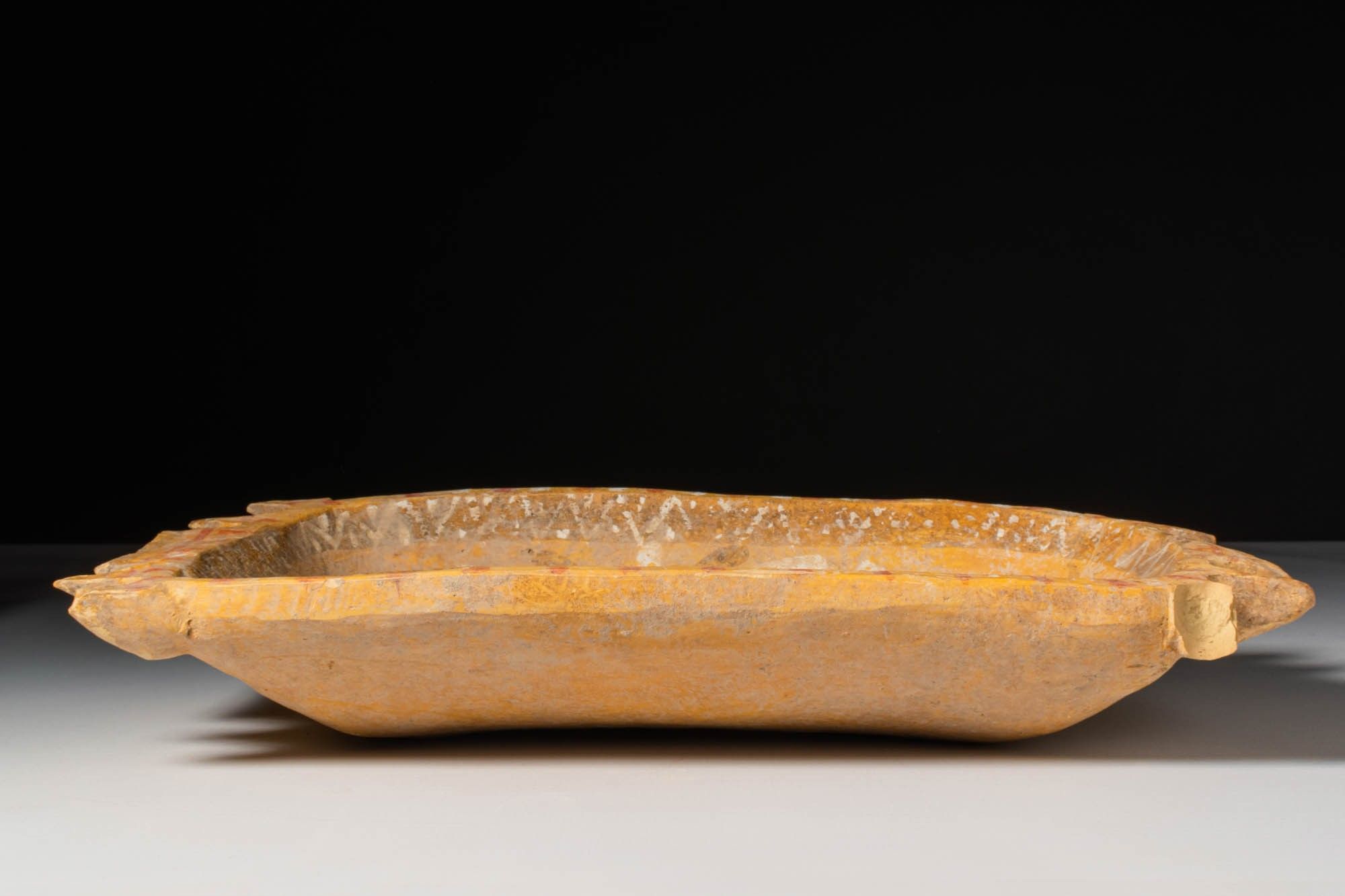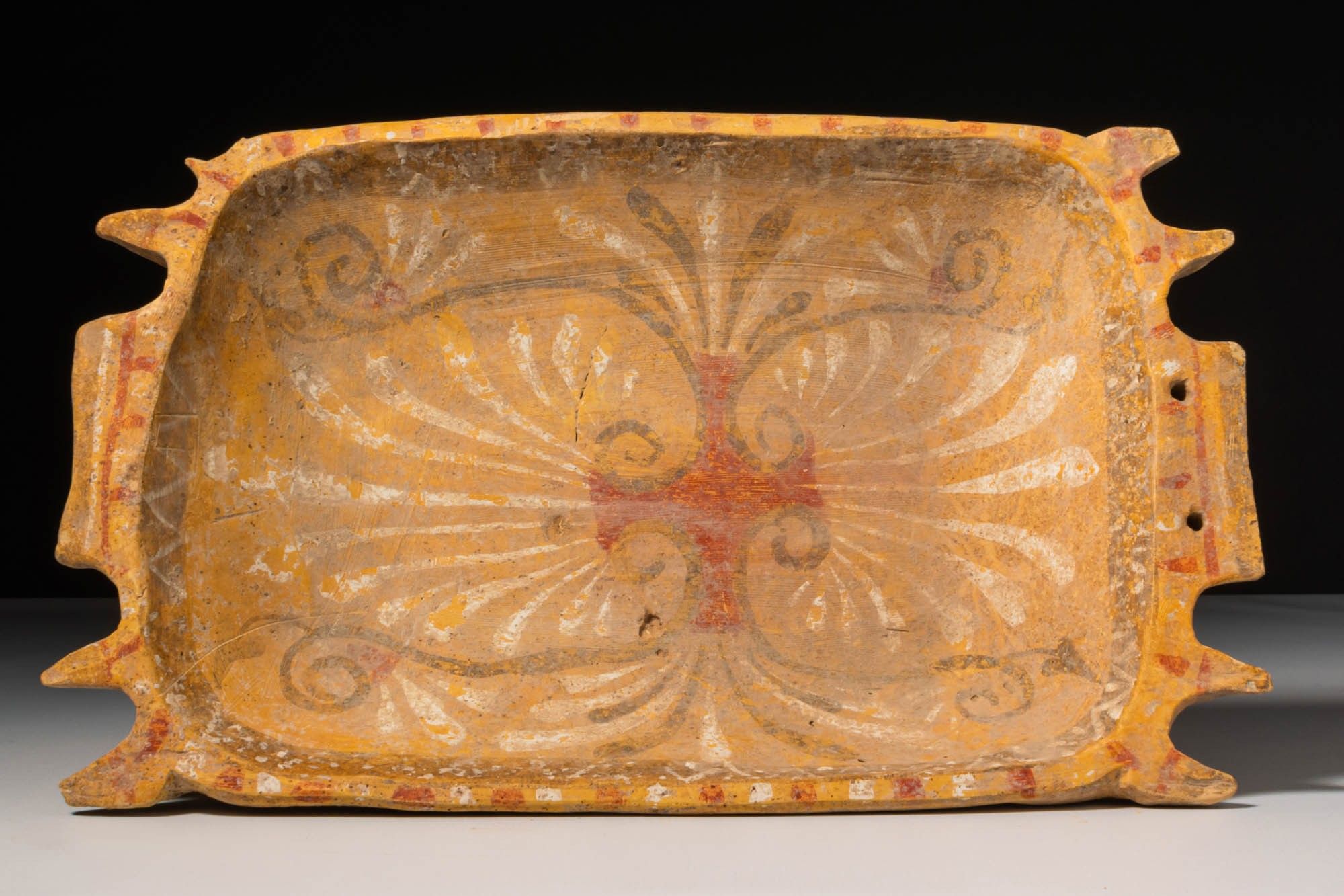 Ca. 300 BC. A terracotta toy cradle with a shallow, square-form body. The shorter sides feature rectangular handles, flanked by spiky protrusions at the corners. The interior is painted with a central cross-shaped element, extending into large palmettes on one side and tendrils on the other. The exterior is coated in a warm ochre hue with traces of red and white pigments. For similar see: Christie's, Live Auction 5488, Antiquities, 7 October 2010, Lot 257; Bonhams, Antiquities, 4 July 2024, Lot 130. Size: 45mm x 270mm; Weight: 765g Provenance: Prince collection, 1990s-2014; Ex. Galerie Gunter Puhze, 2010; Ex. Geneva collection, acquired in the 1960s. This item has been cleared against the Art Loss Register database and comes with a confirmation letter.