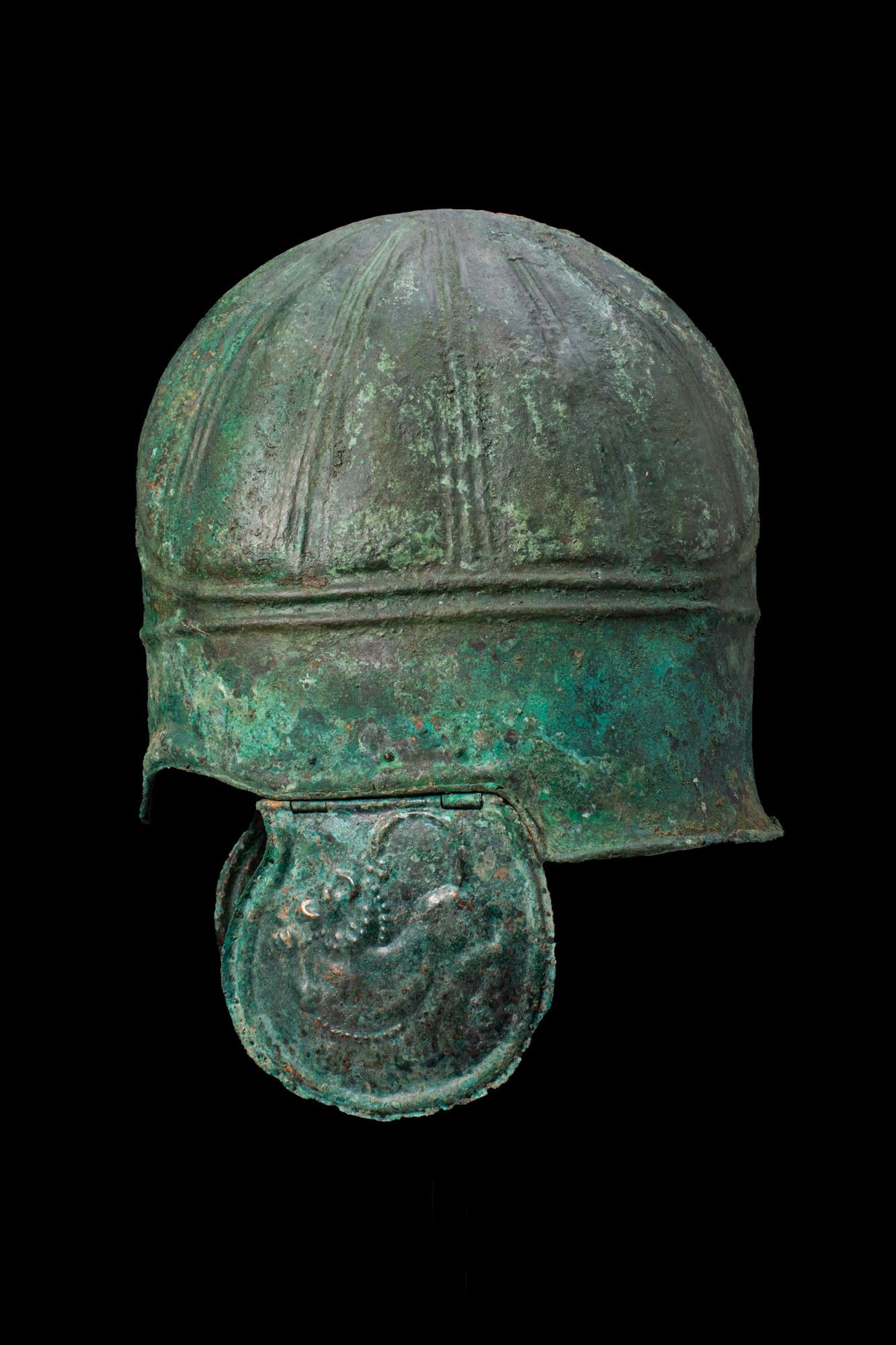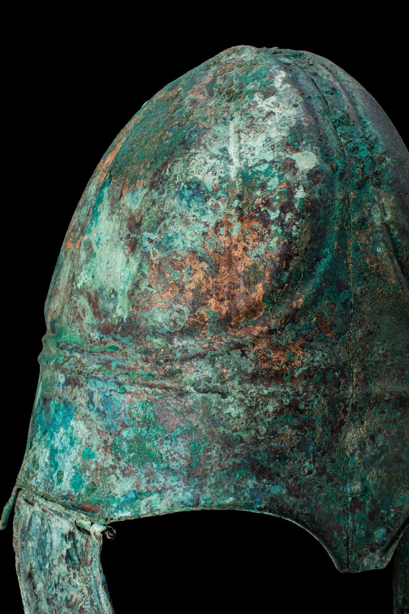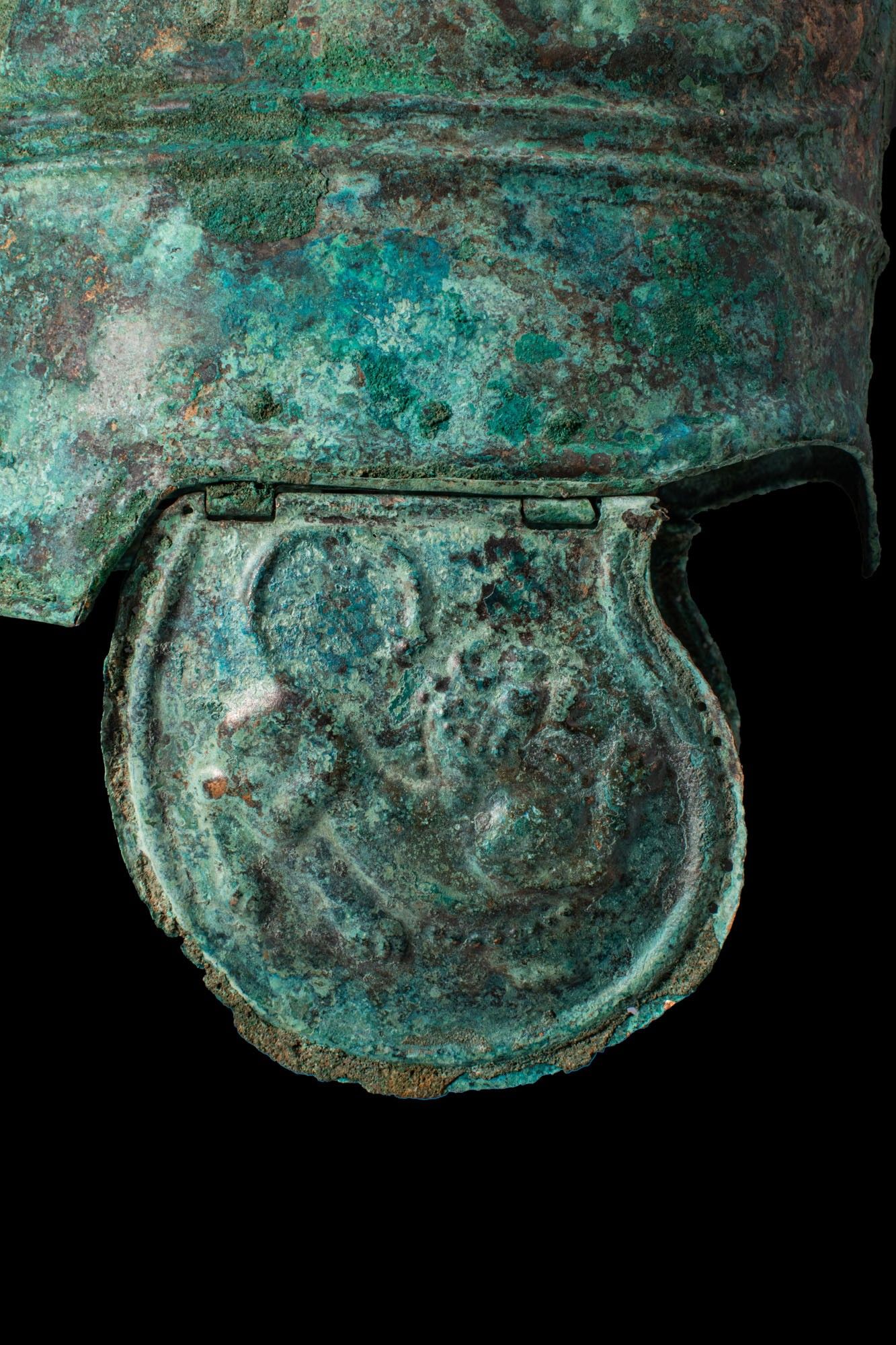 Premium CHALCIDIAN BRONZE HELMET WITH CHEEKS DEPICTING LIONS. Ca. 33…