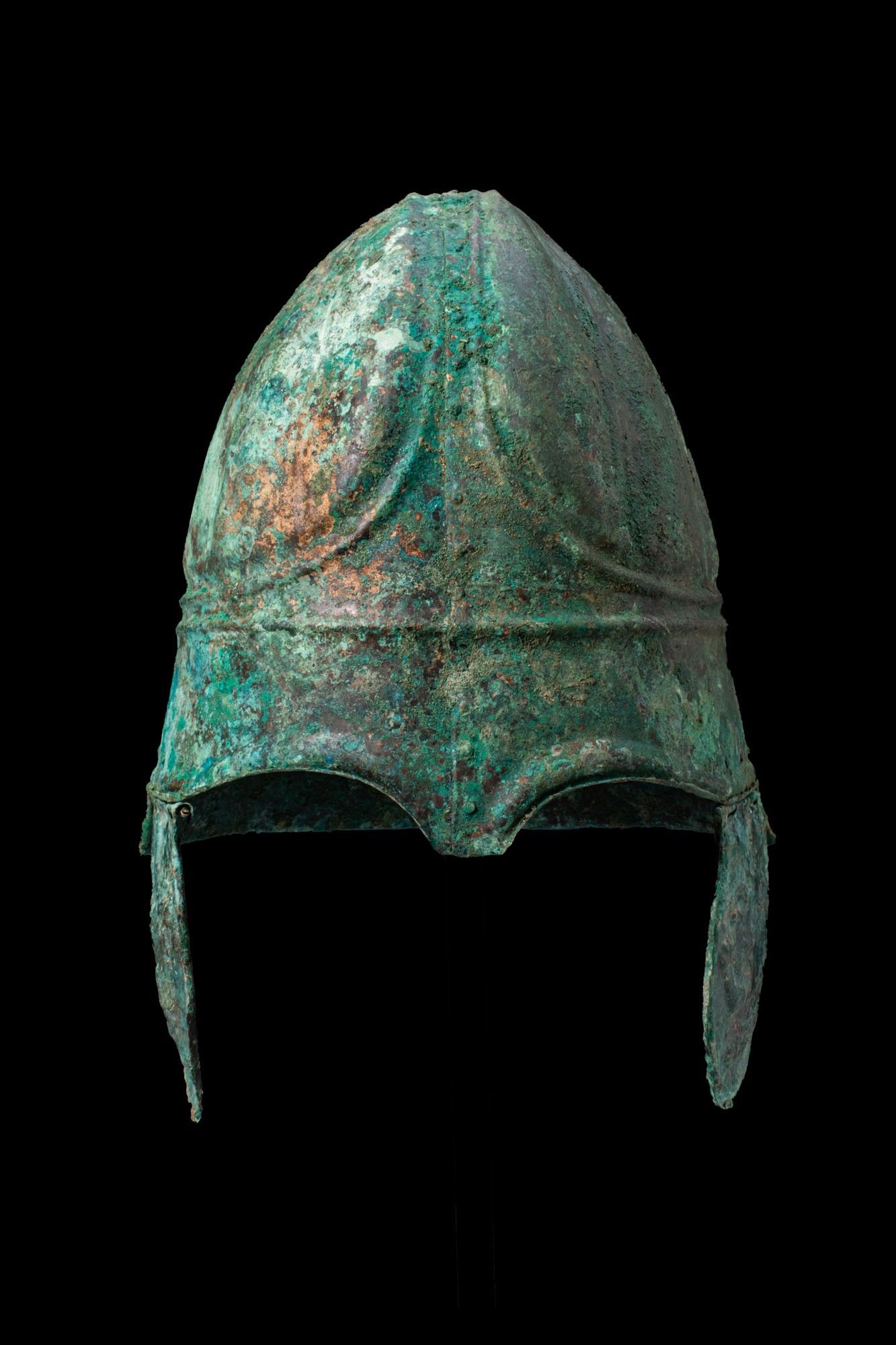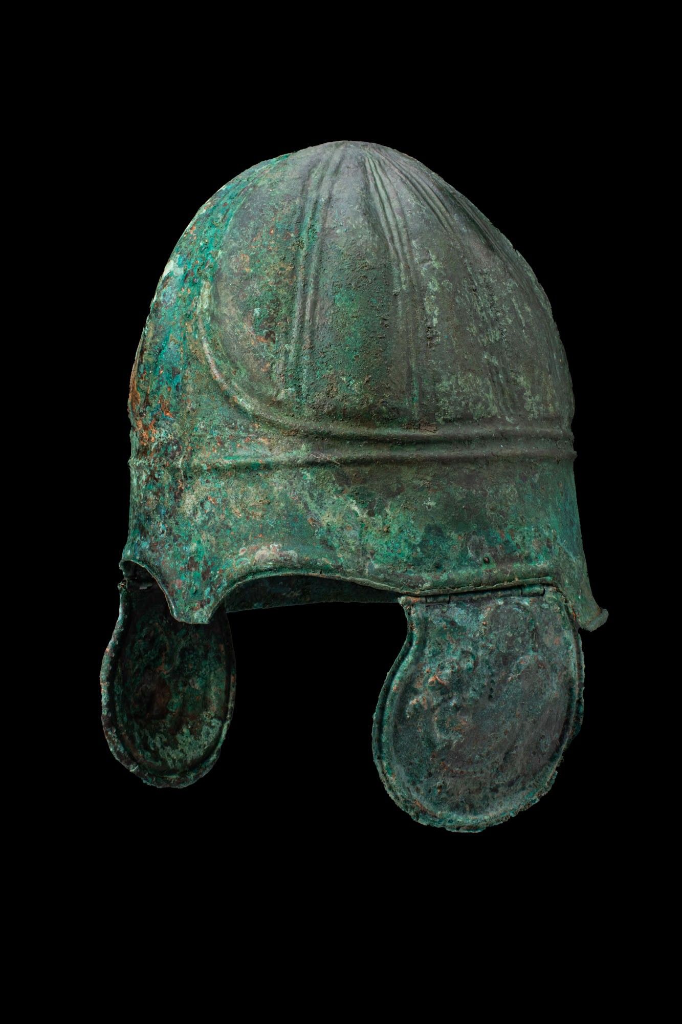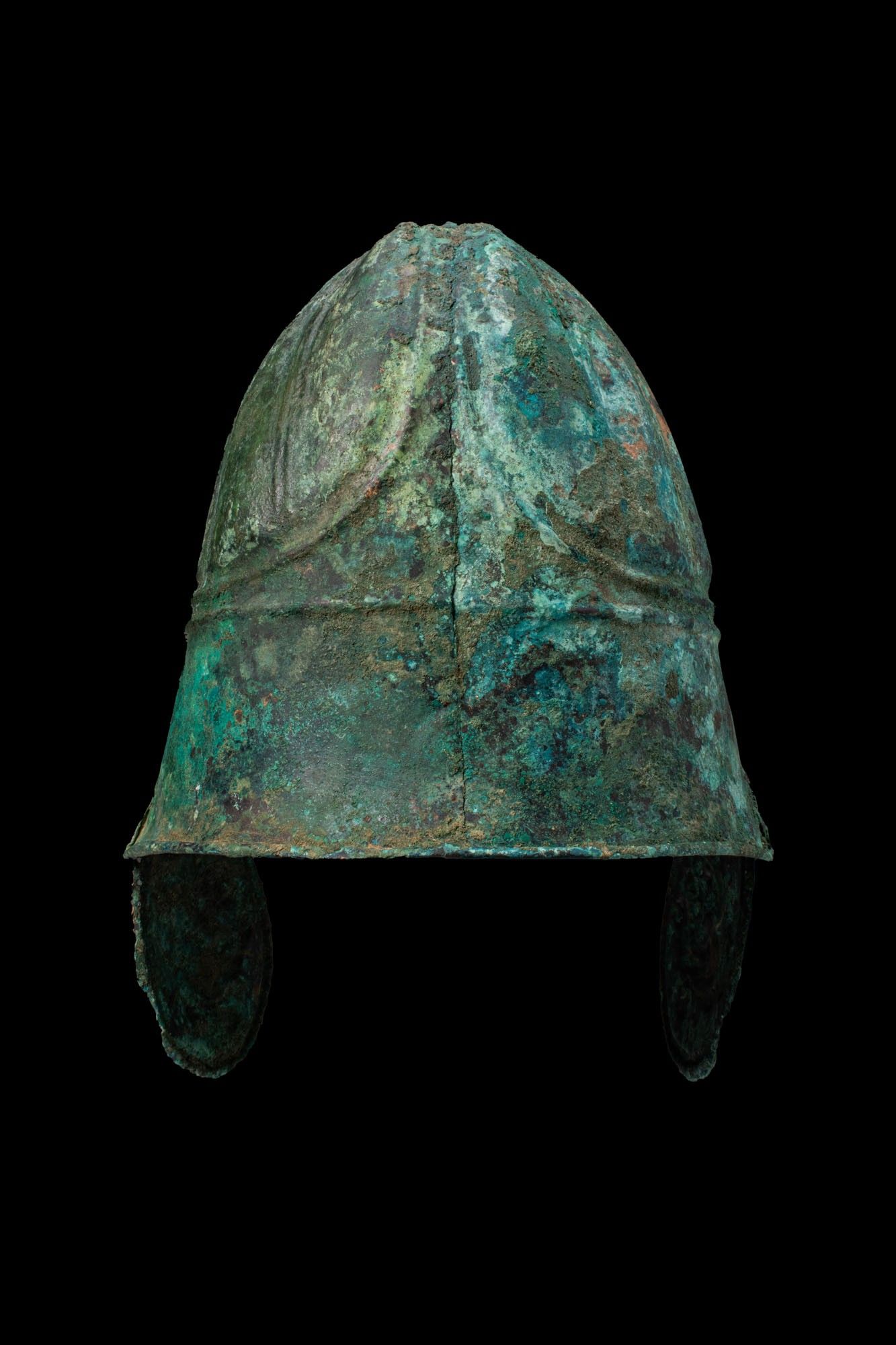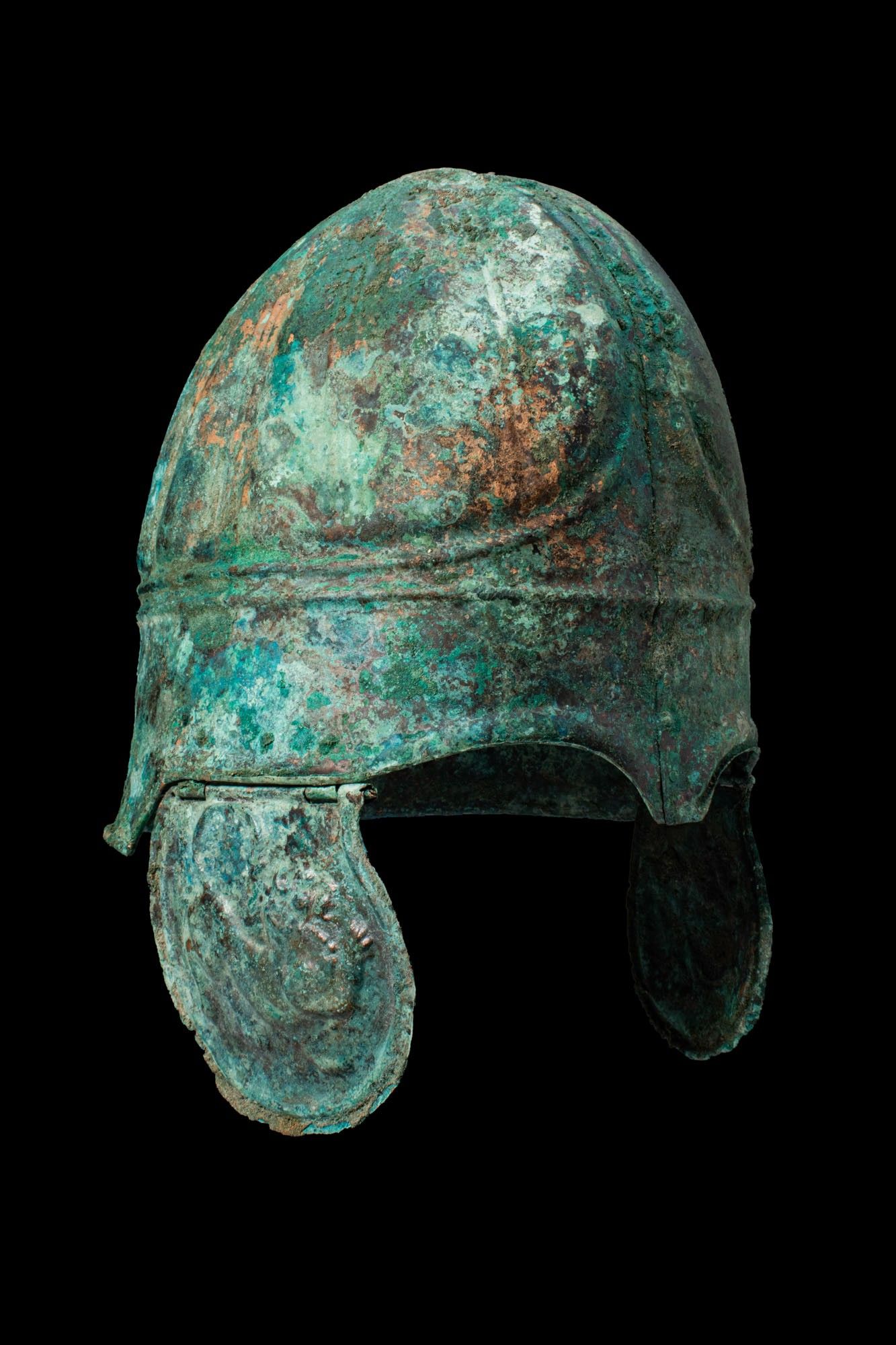 Premium CHALCIDIAN BRONZE HELMET WITH CHEEKS DEPICTING LIONS. Ca. 33…