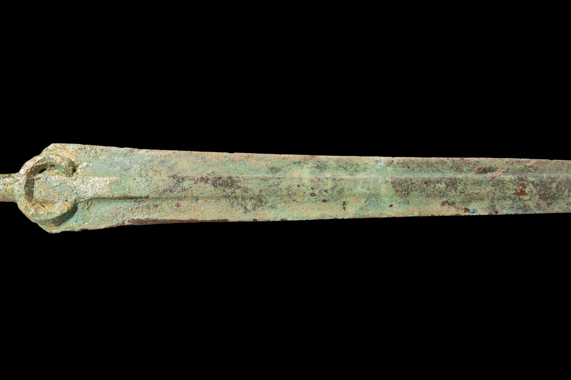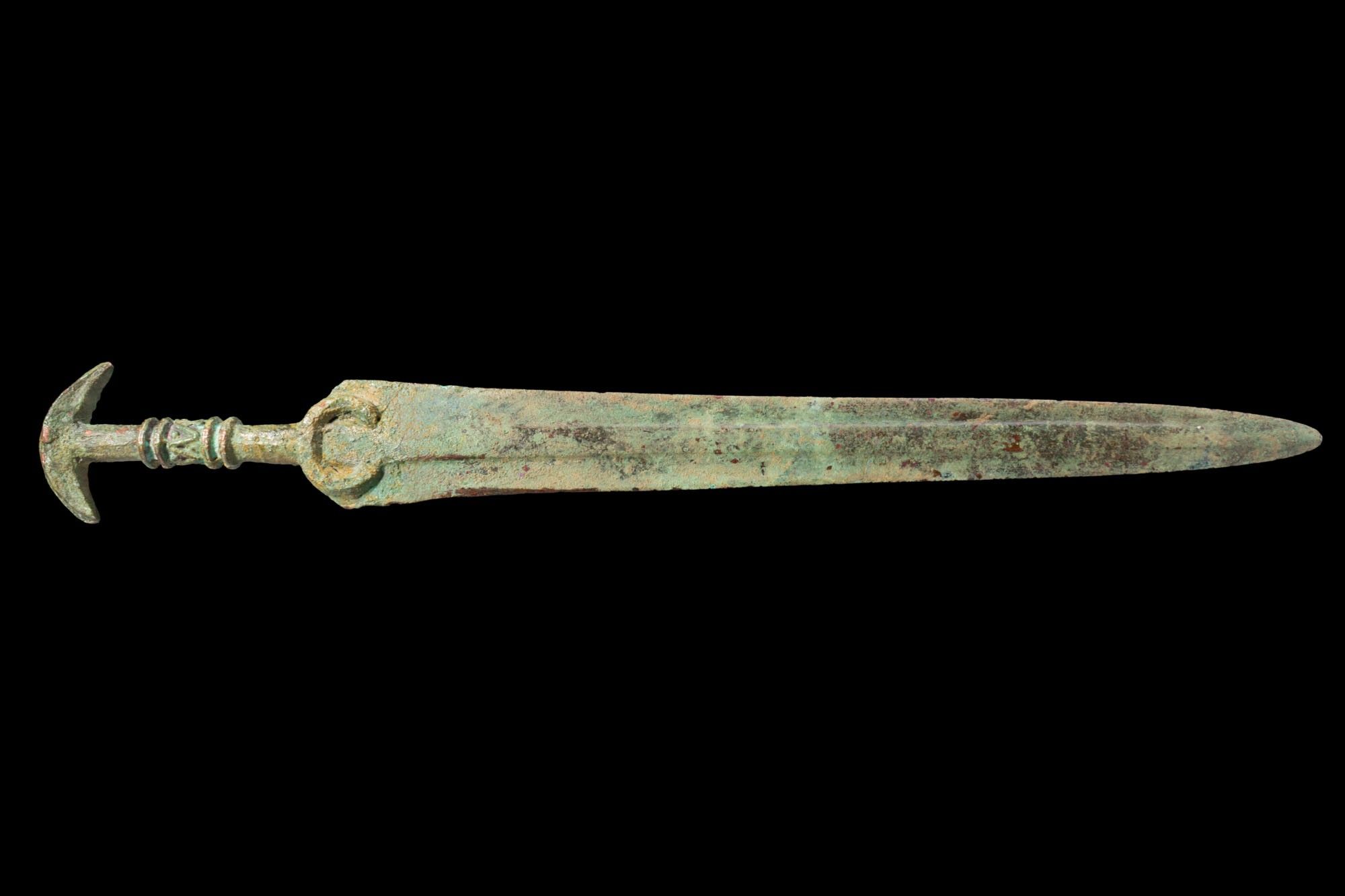 Premium GREEK PERIOD BRONZE SWORD WITH CRESCENT-SHAPED POMMEL. Ca. 1…