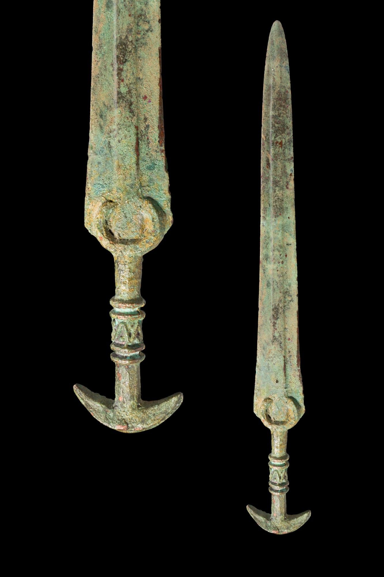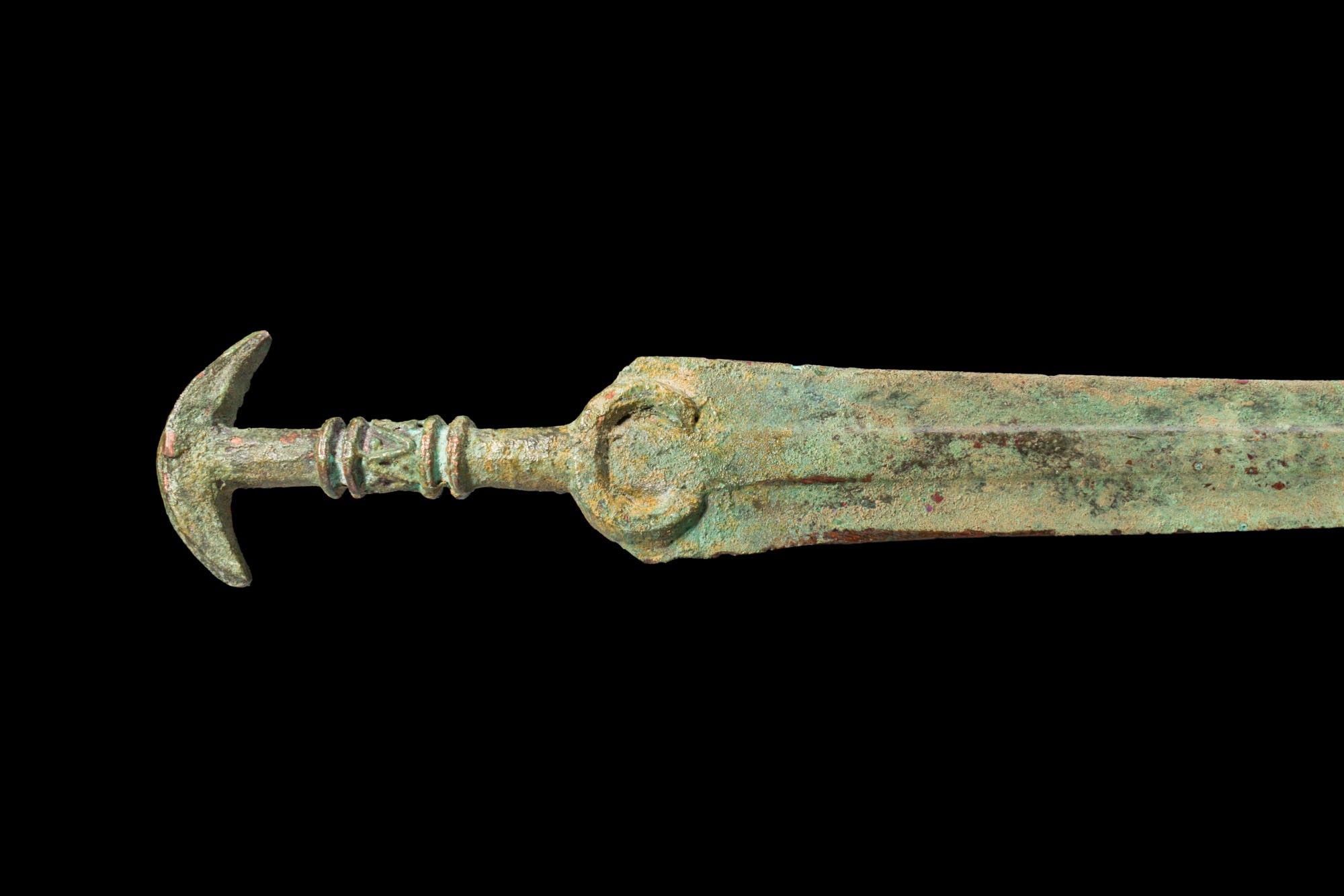GREEK PERIOD BRONZE SWORD WITH CRESCENT-SHAPED POMMEL.